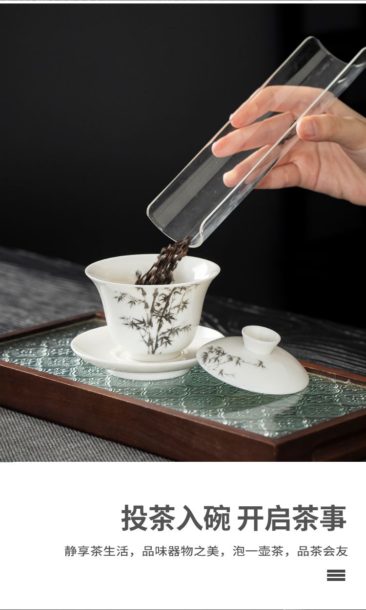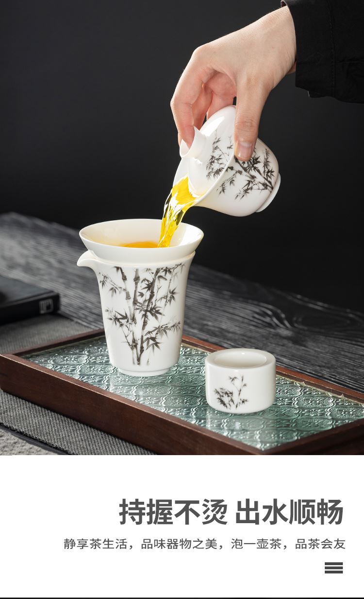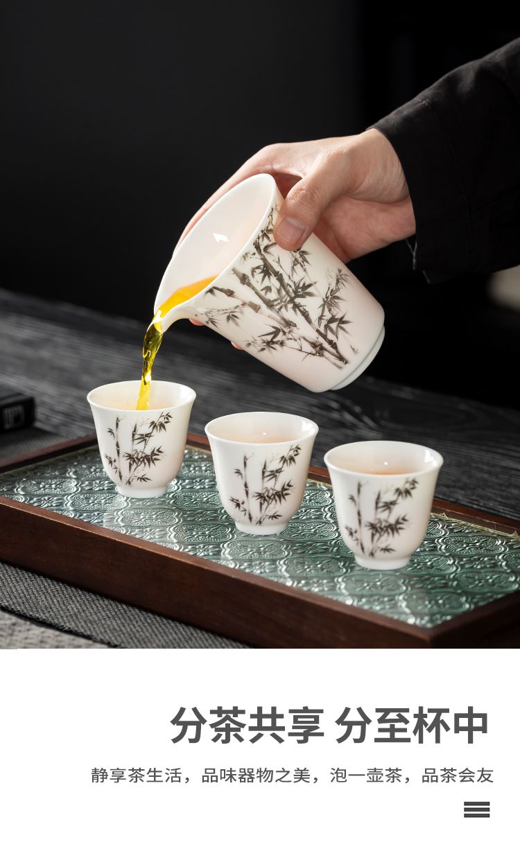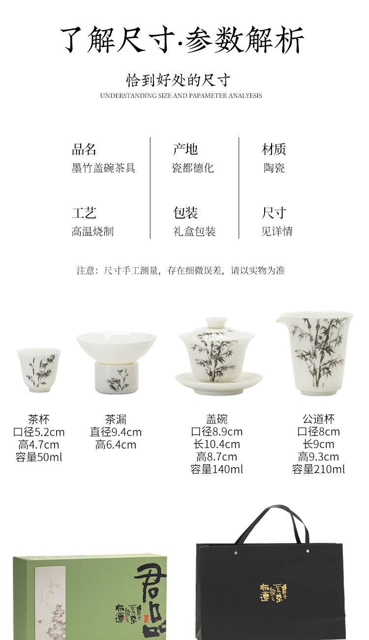 配置:盖碗*1 品茗杯*6 公道杯*1 茶漏*1 礼盒*1手提袋*1 材质:羊脂玉瓷 礼盒尺寸:40.3cm*25cm*12cm 产品尺寸:盖碗:145ml 品茗杯:50ml 茶海 230ml