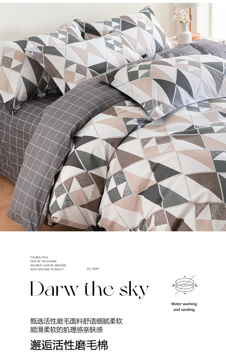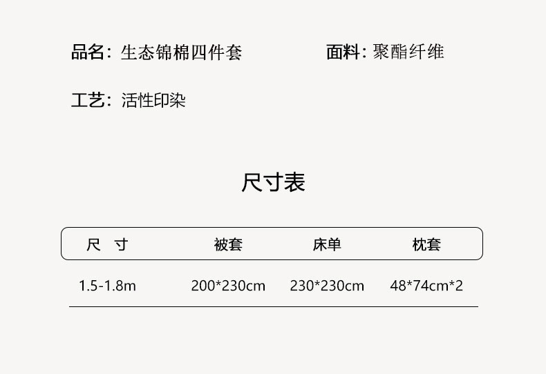 被套:200×230cm 床单:230×230cm 枕套:48×74cm 适用:1.5M-1.8M床 面料:聚酯纤维 印染工艺:环保印花 风格:田园风格 包装:精美手提盒 甄选生态锦棉亲肤面料,居家品质,感软糯亲肤舒适 透气不易闷热。美观大方,耐磨耐用的经典床品。