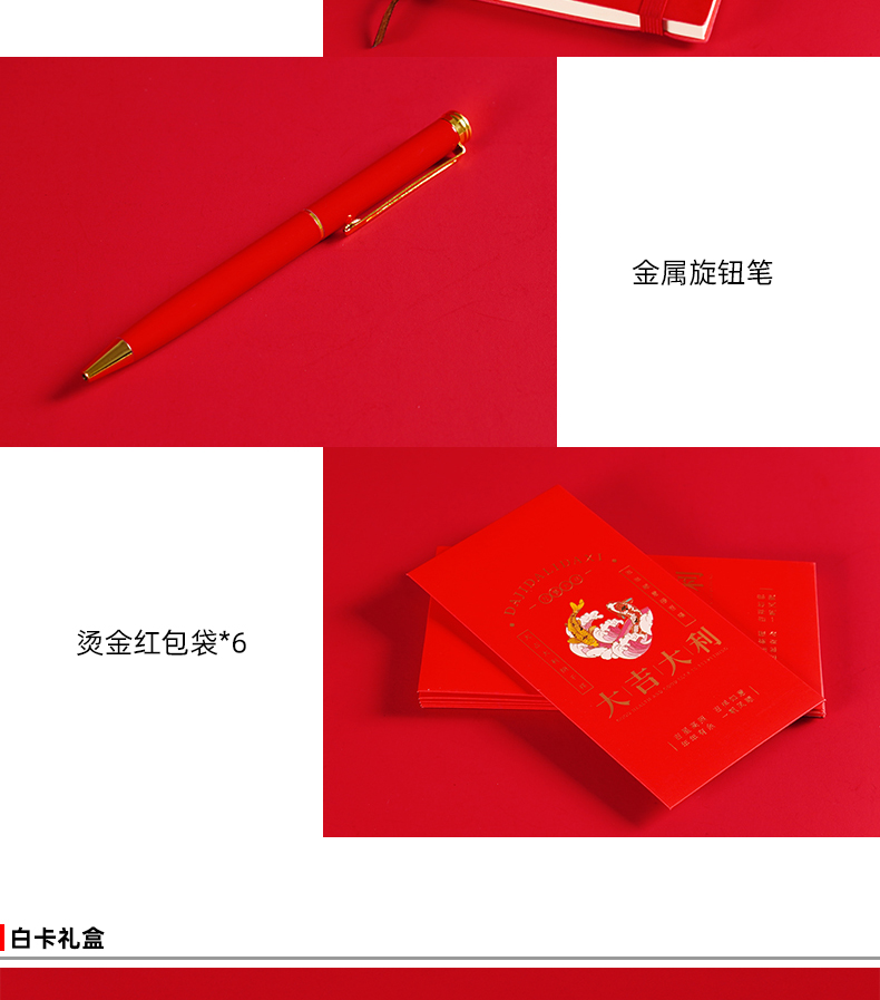 配置:笔记本+金属笔+台历+红包袋*6 型号:NF07 材质:PU+金属+纸 尺寸:笔记本210*145mm 台历215*125mm 金属笔140*10mm 红包袋168*88mm 包装:白卡礼盒(225*190*45mm)