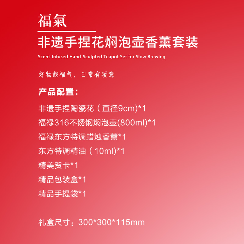 【产品配置】 非遗手捏陶瓷花(直径9cm)*1 福禄316不锈钢焖泡壶*1 (800ml)*1福禄东方特调蜡烛香薰*1 东方特调精油(10ml)*1 精美贺卡*1 精品包装盒*1 精品手提袋*1 【产品说明】 非遗手捏花工艺,彰显文化底蕴; 316 不锈钢焖泡壶,实用耐用; 东方特调香薰,多品类香氛体验; 福禄元素,契合新年商务礼赠寓意; 精美礼盒包装,精致有格调。
