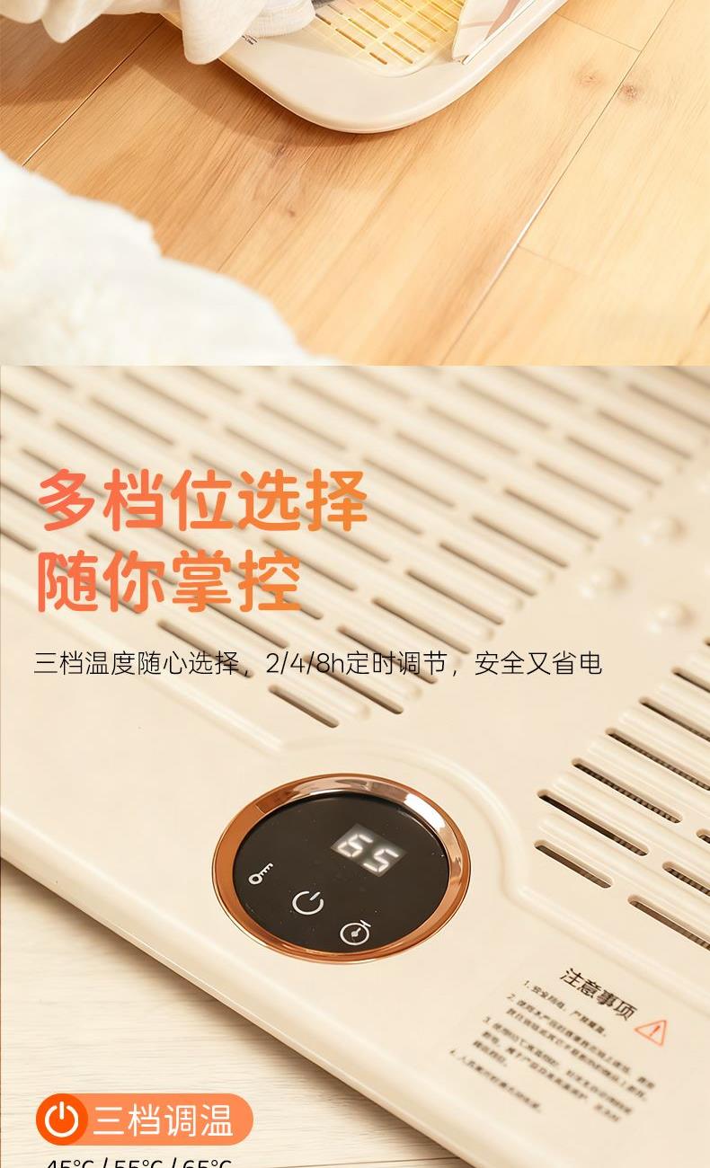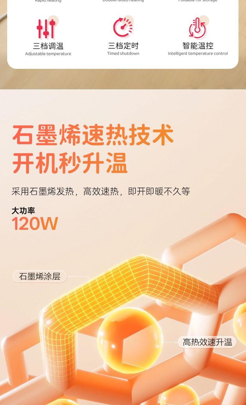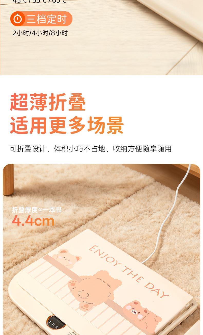 产品尺寸:45*35*4.4cm包装尺寸:49.5*40*6cm产品重量:1.97Kg 输入:110-220V 功率:120W定时:开机后轻触定时面板-切换定时时间,以2-4-8-取消定时循环切换 材质:PP/PC/电子原件/PVC人造革 颜色:米色 阻燃材料,石墨烯1S速热,快速温暖,上下双面发热, 脚底脚面一样暖,智能温控,不烫脚,超薄折叠 适用更多场景,过热智能断电,可定时关机,低能耗, 0.1度/小时,带遥控器,操作更便捷