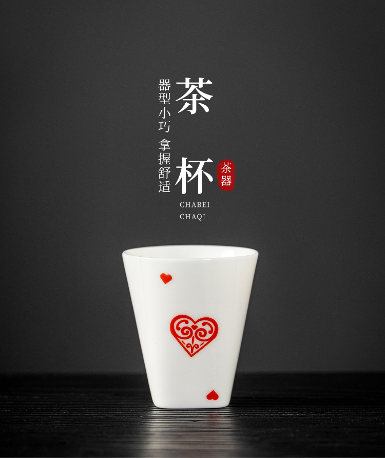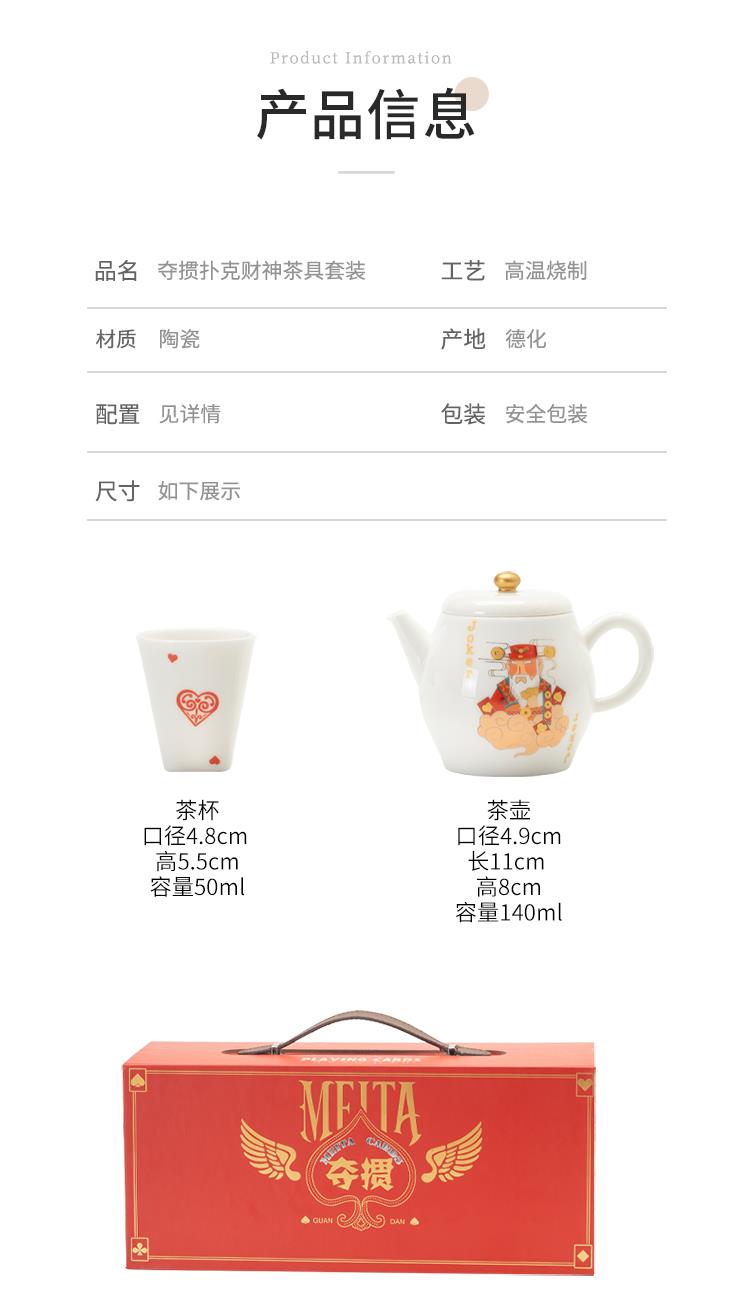 配置:品茗杯*4 壶*1 养生茶*1 扑克牌*2 礼盒*1 养生茶成分:西洋参、党参、黄芪、麦冬 材质:羊脂玉瓷 礼盒尺寸:36cm*14cm*16cm 产品尺寸: 品茗杯 4.8cm*5.5cm 容量50ml 壶5cm*11cm 容量140ml 养生茶:5.4cm*4.1cm 容量8g 扑克牌2副
