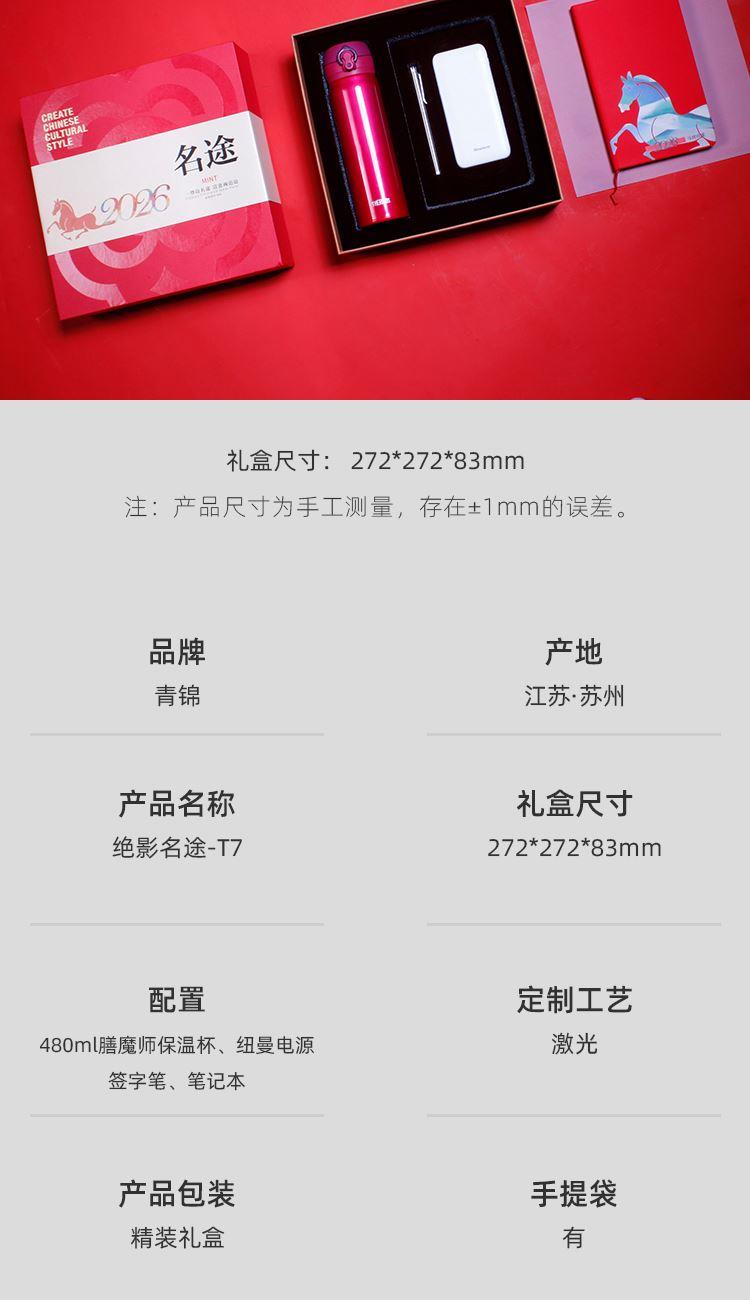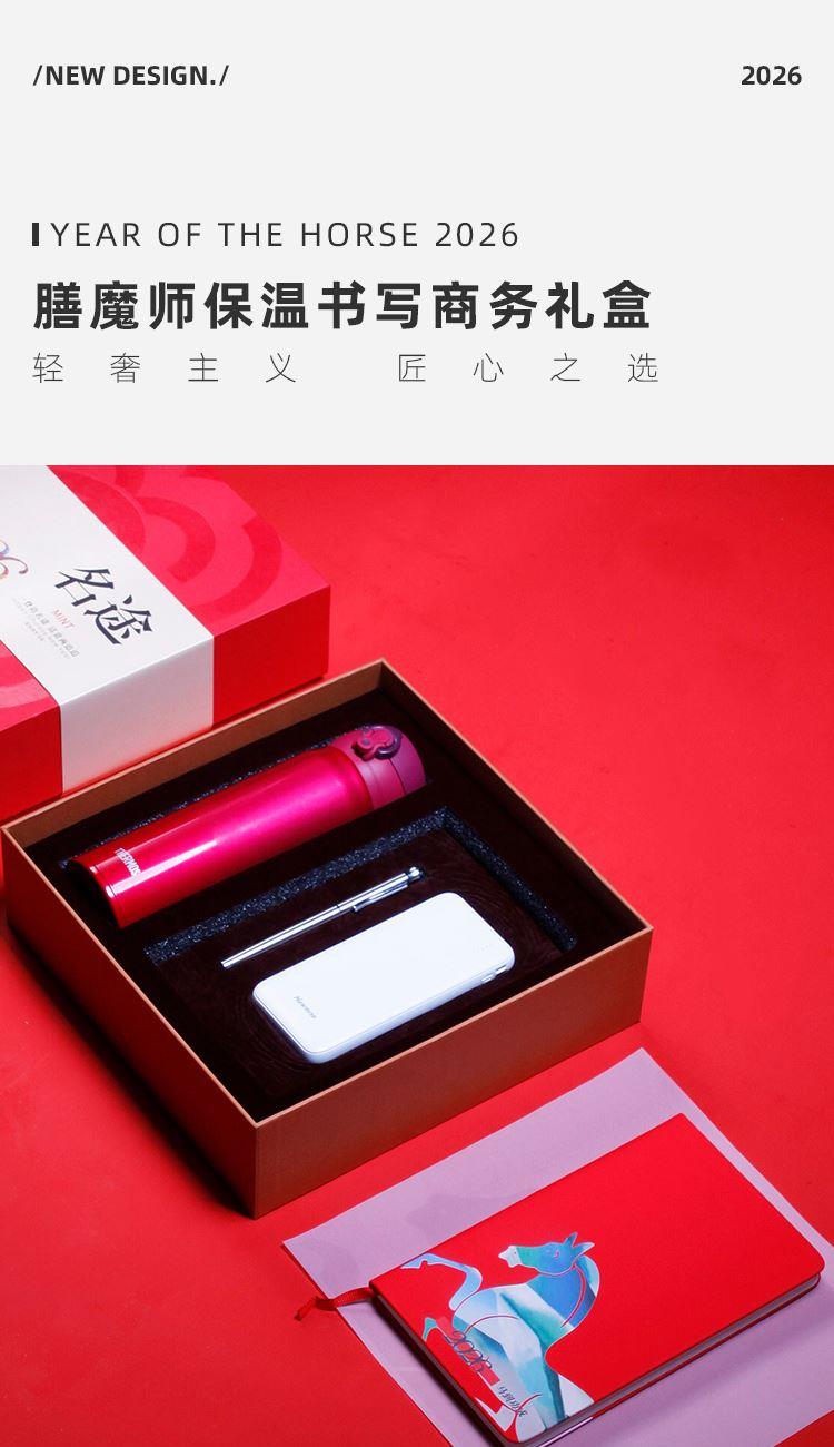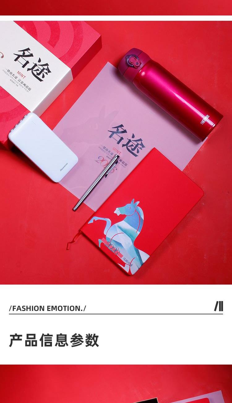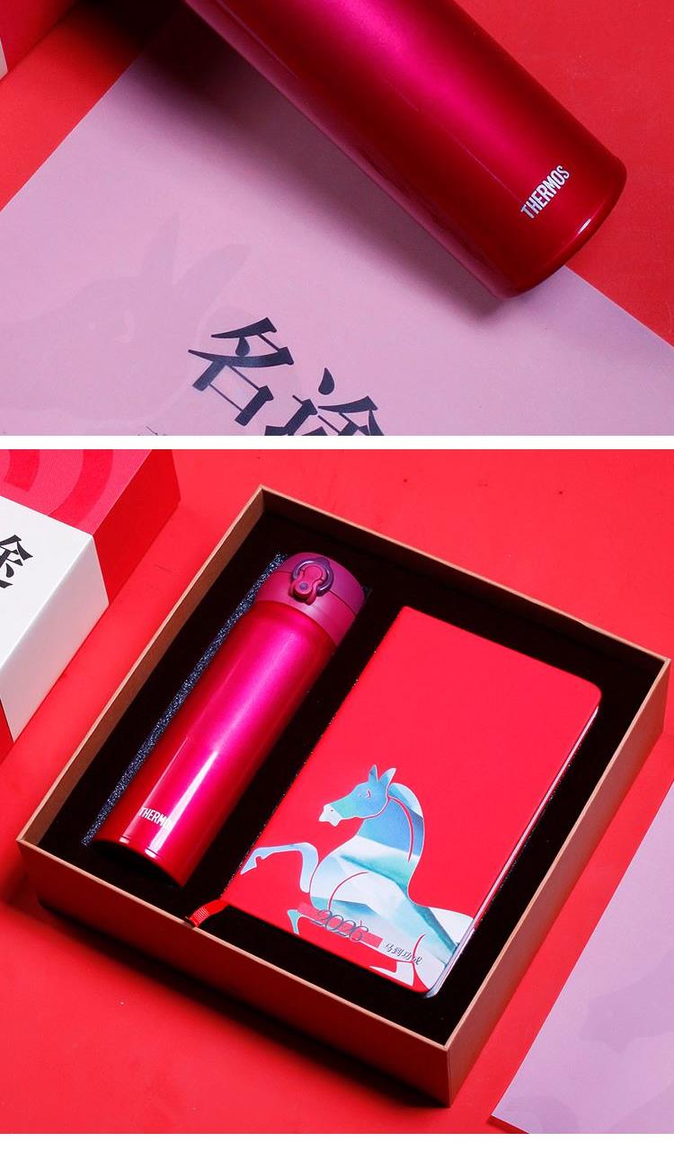 配置 膳魔师保温杯480ML*1 青马笔记本*1 颜色黑色/红色/彩印色 签字笔*1 纽曼移动电源*1 白色 手提袋套*1 精装礼盒*1 材质 保温杯:304钢 签字笔:abs 笔记本:皮革千越象牙白纸100克80张 尺寸 笔记本:130*212mm 保温杯:220*60*60mm 礼盒:272*272*83mm