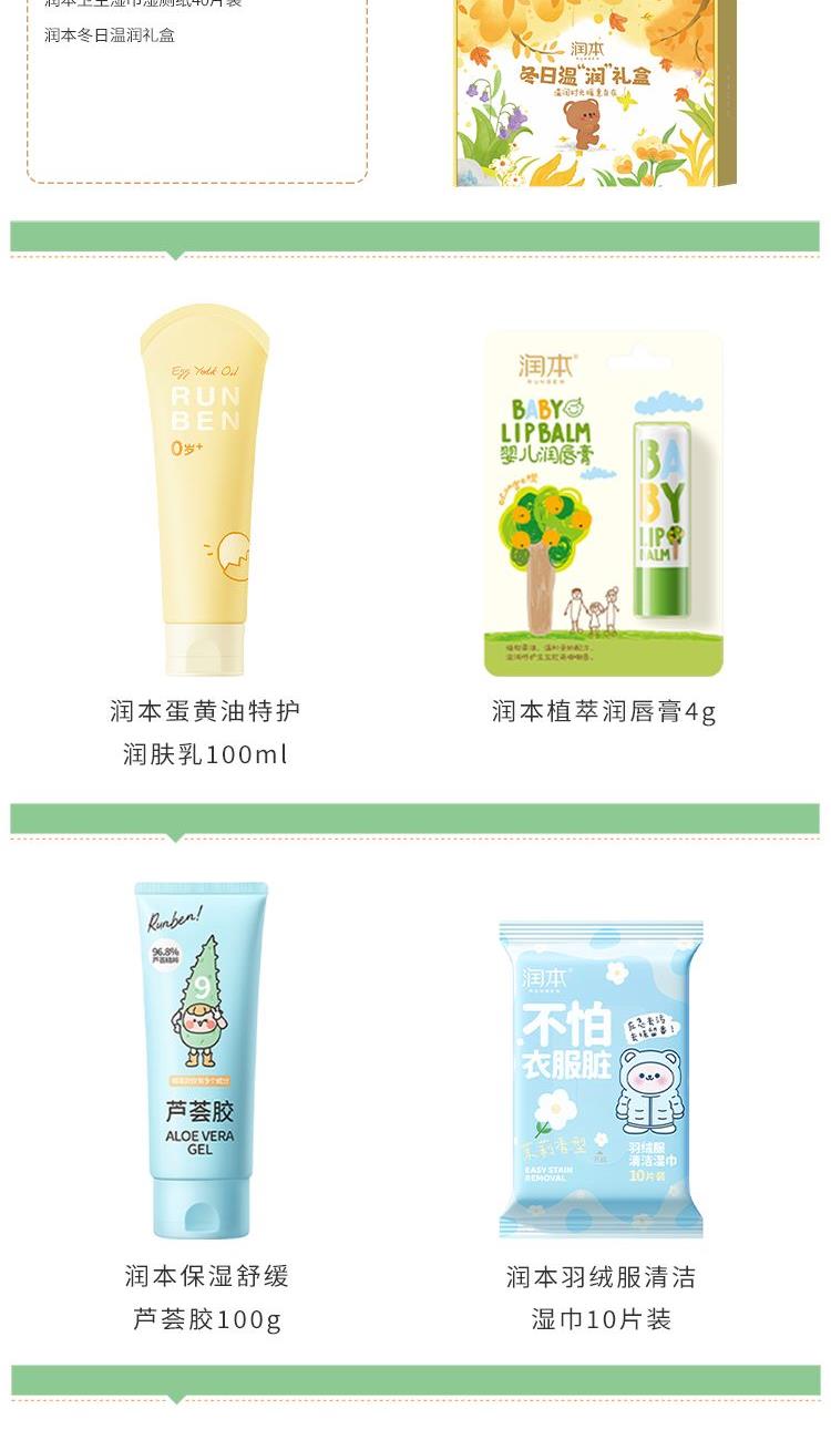 润本蛋黄油特护润肤乳100ml 润本植萃润唇膏4g 润本保湿舒缓芦荟胶100g 润本羽绒服清洁湿巾10片装 润本卫生湿巾湿厕纸40片装 思珀莱冬日温润礼盒