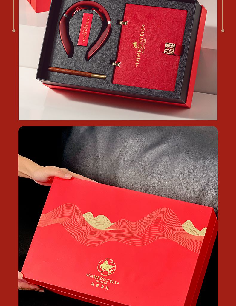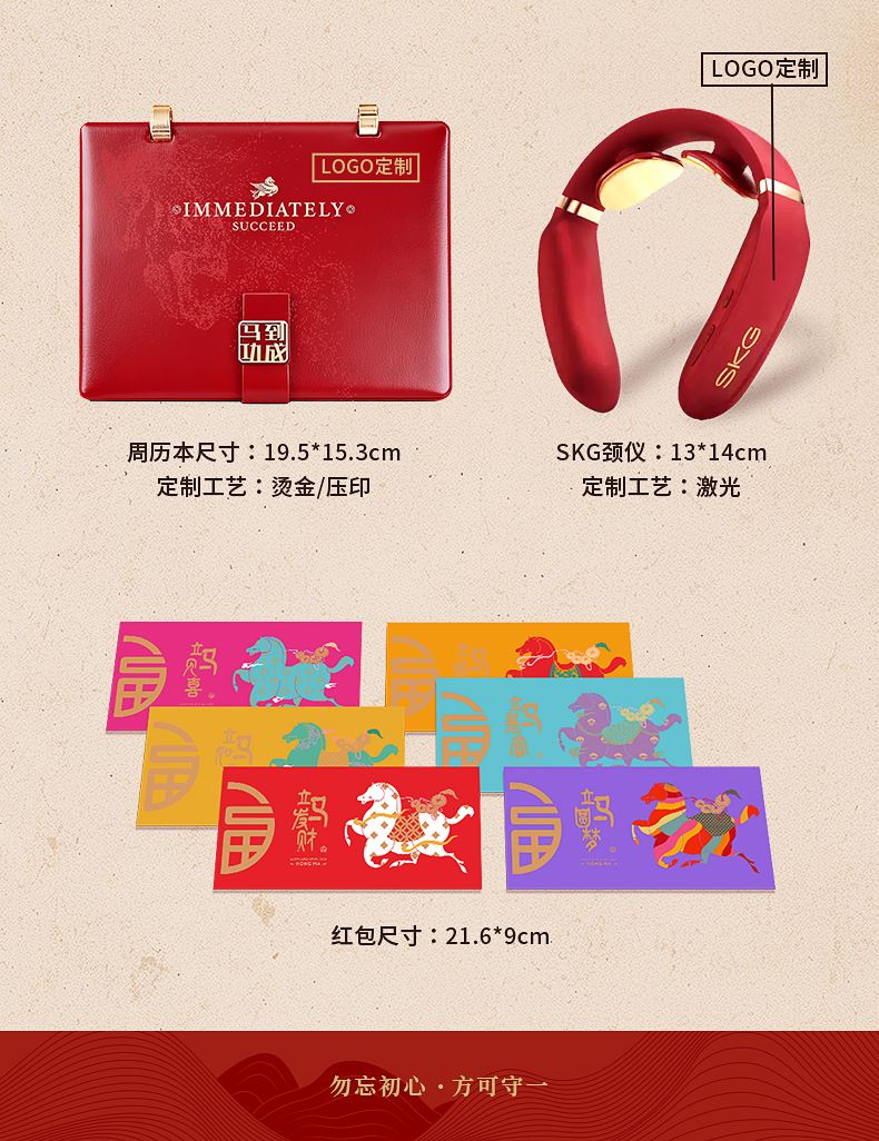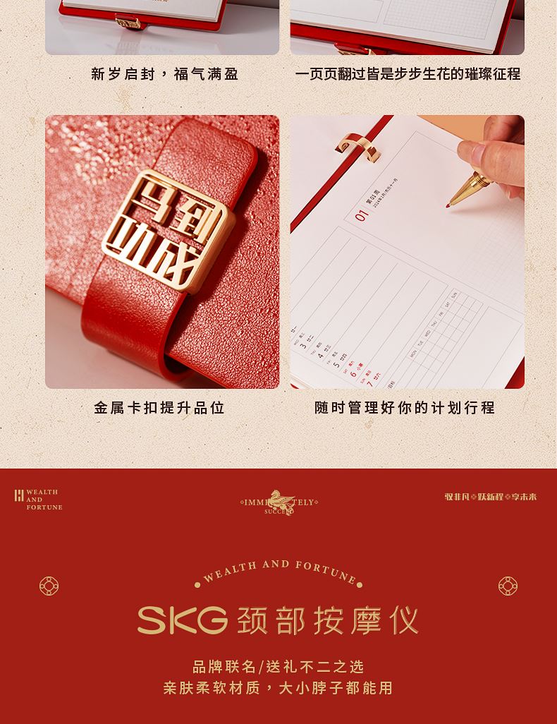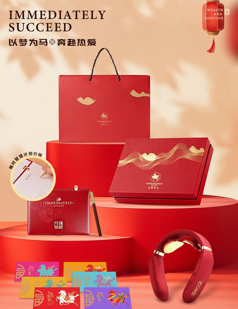 1、SKG红色颈部按摩仪是给奋斗者贴心的守护:42°恒温加热、15分钟智能 定时、900mAH(10天续航)16档力度 2、时间管理手册本:台历功能、笔记本功能、摆件功能 3、红木签字笔:书写新年 新篇章 4、新年红包*6:开启新年好运程