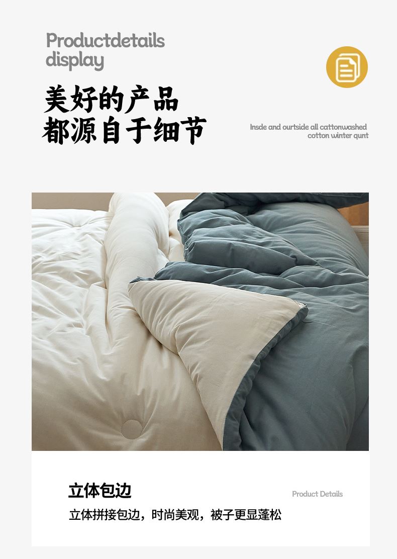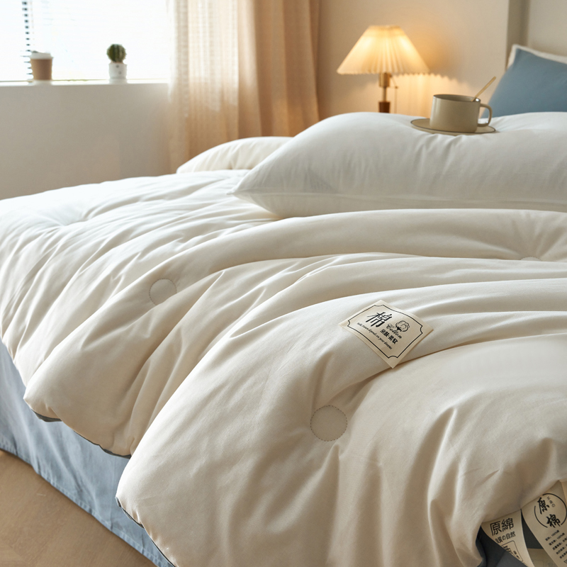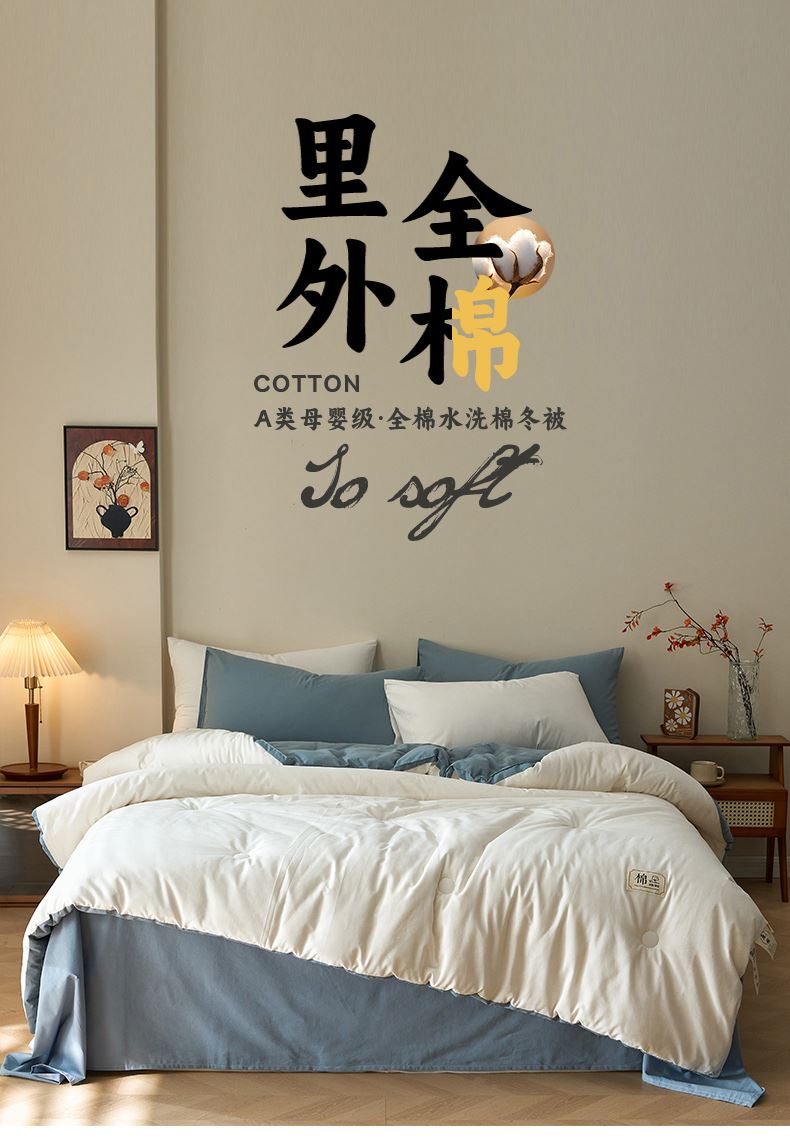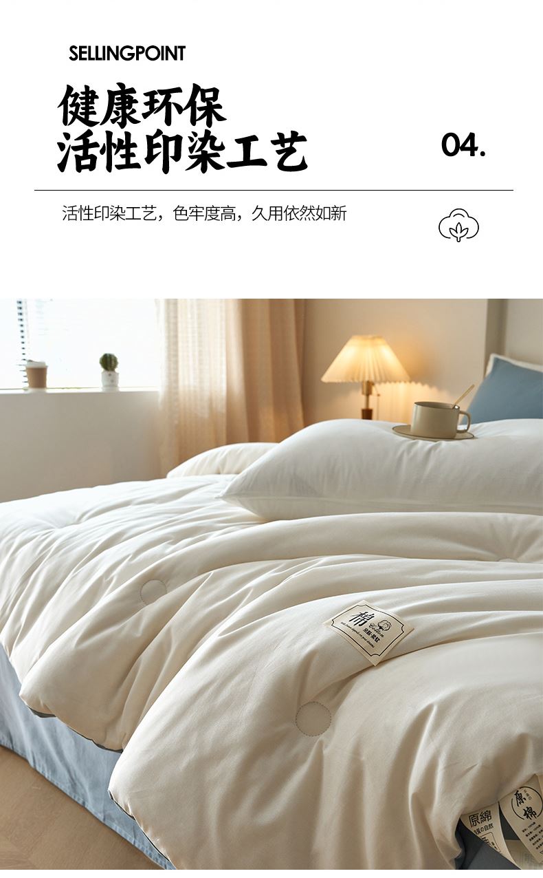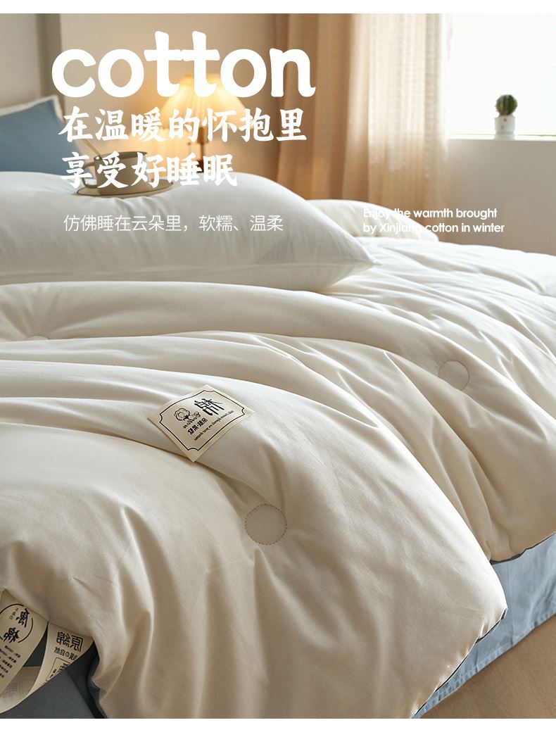 面料:棉 填充:新疆棉花 规格:200cm*230cm 总重量:3000g 包装:精美软包 里外都是全棉的棉花冬被,吸湿透气手感暖糯,细腻柔软,填充选用优质新疆棉花。高标准,无刺激,适合敏感肌肤。