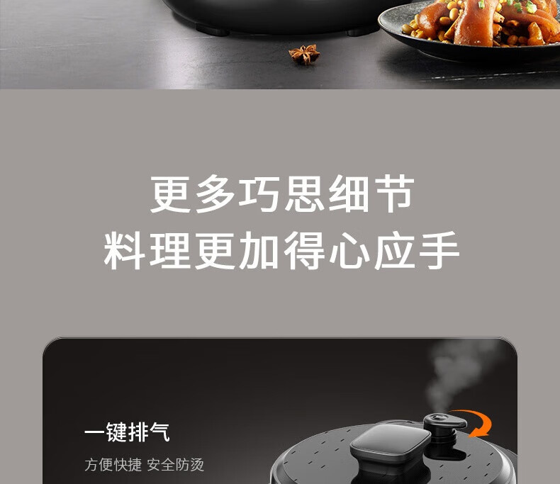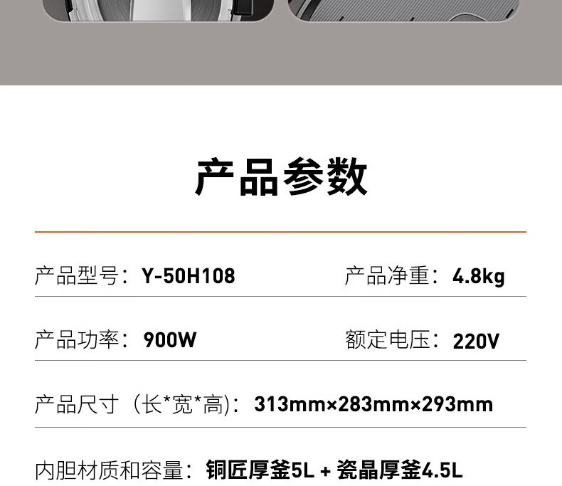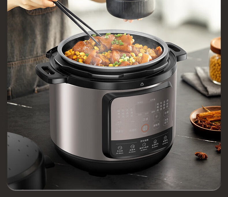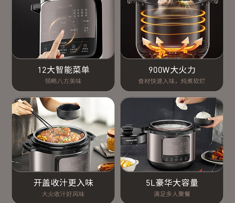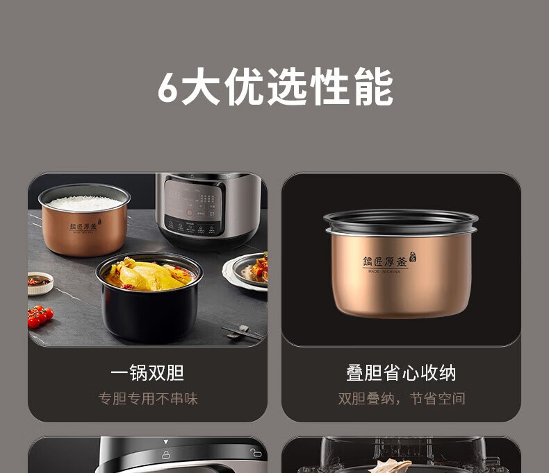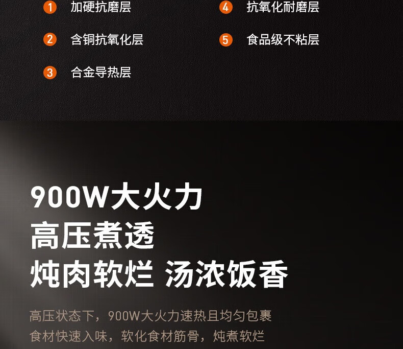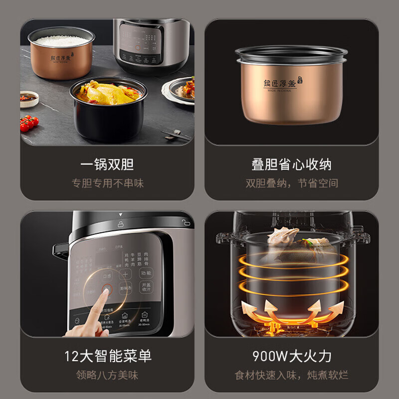 170千帕高压/900W大火力 铝+晶瓷单胆单用 12大功能菜单:精煮饭,杂粮饭,浓香粥,杂粮粥,豆蹄筋,牛羊肉,鸡鸭肉,开盖收汁,快速饭,快速粥,美味汤,营养蒸 包装尺寸:333L*330W*356Hmm