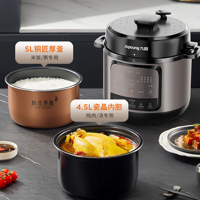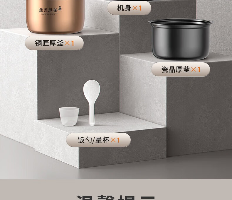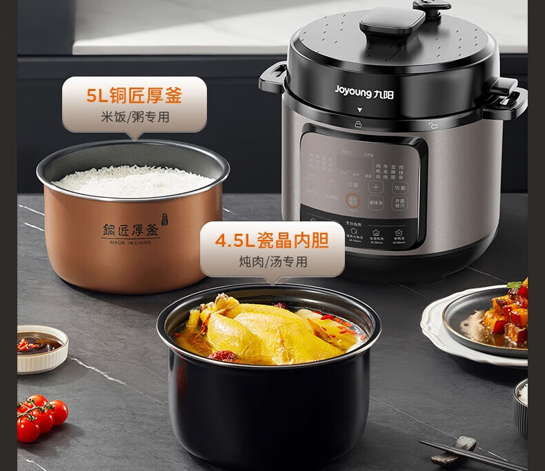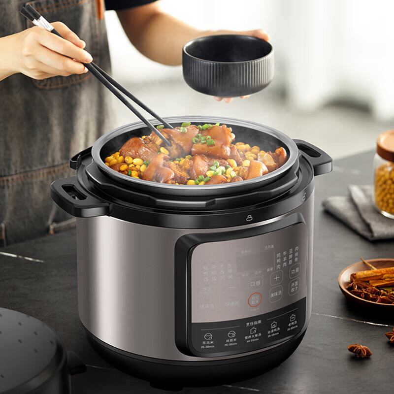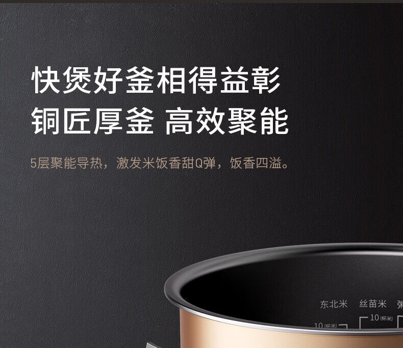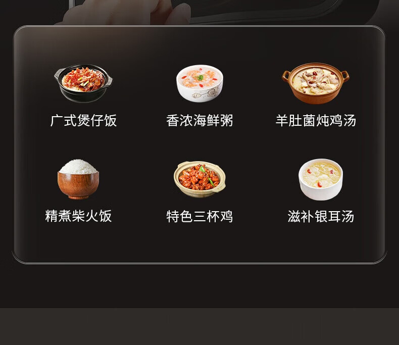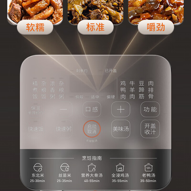 170千帕高压/900W大火力 铝+晶瓷单胆单用 12大功能菜单:精煮饭,杂粮饭,浓香粥,杂粮粥,豆蹄筋,牛羊肉,鸡鸭肉,开盖收汁,快速饭,快速粥,美味汤,营养蒸 包装尺寸:333L*330W*356Hmm
