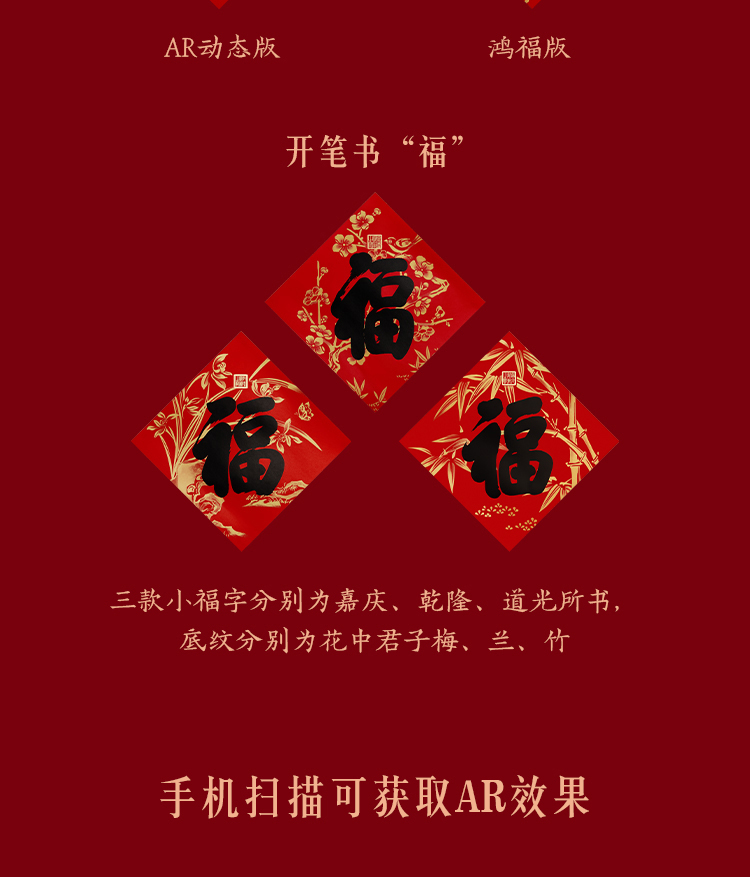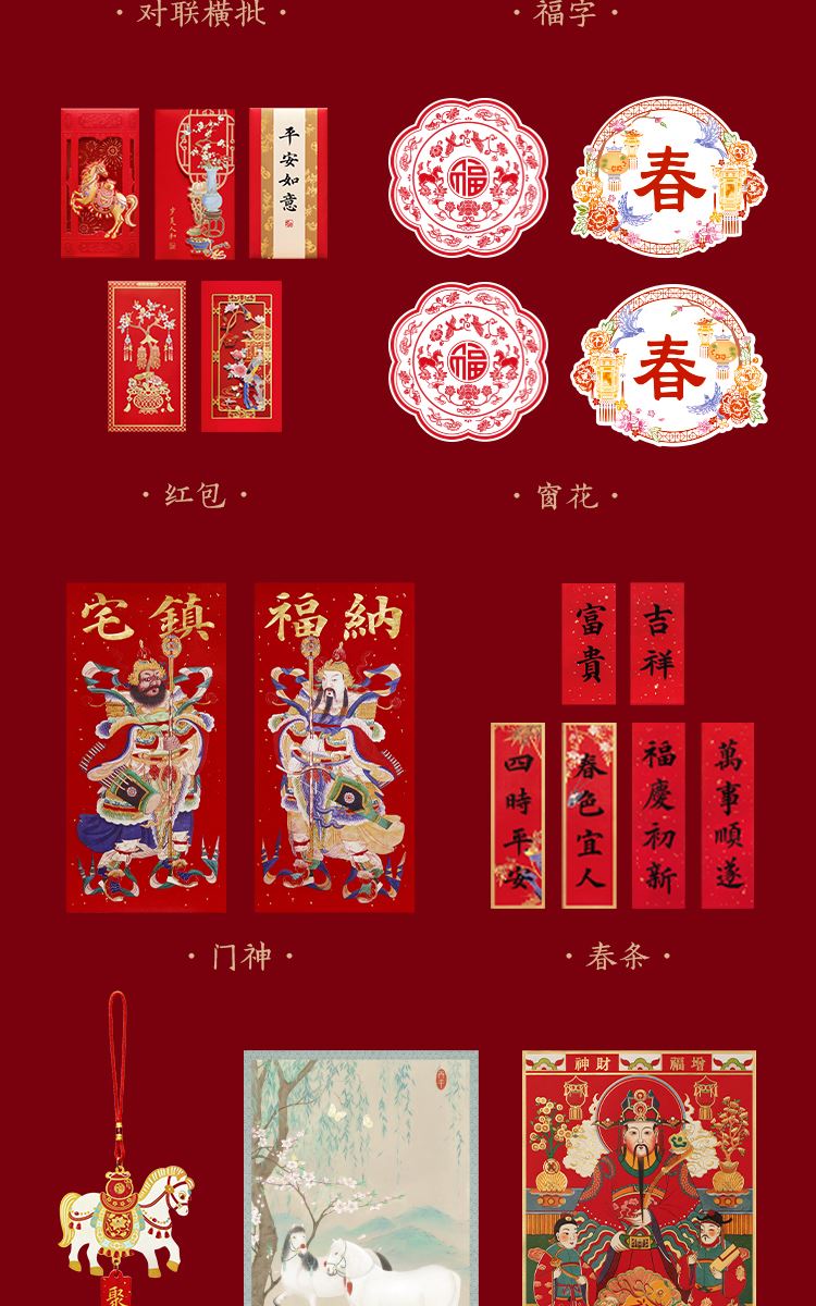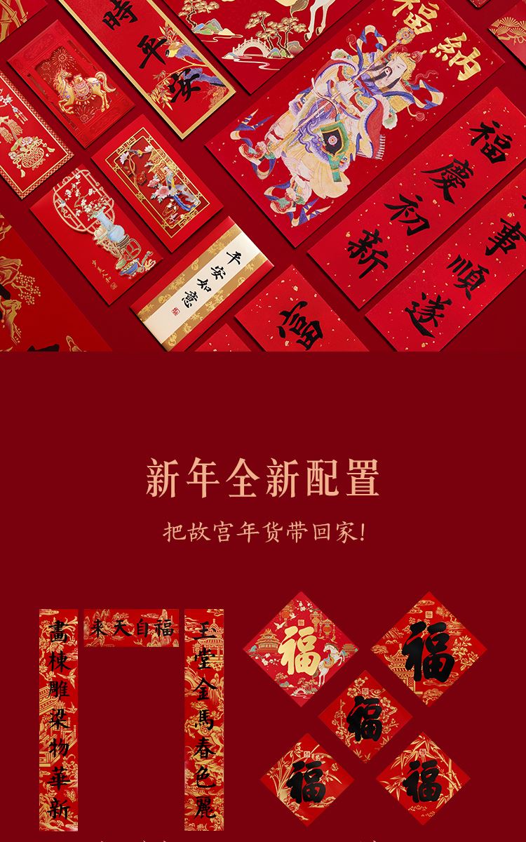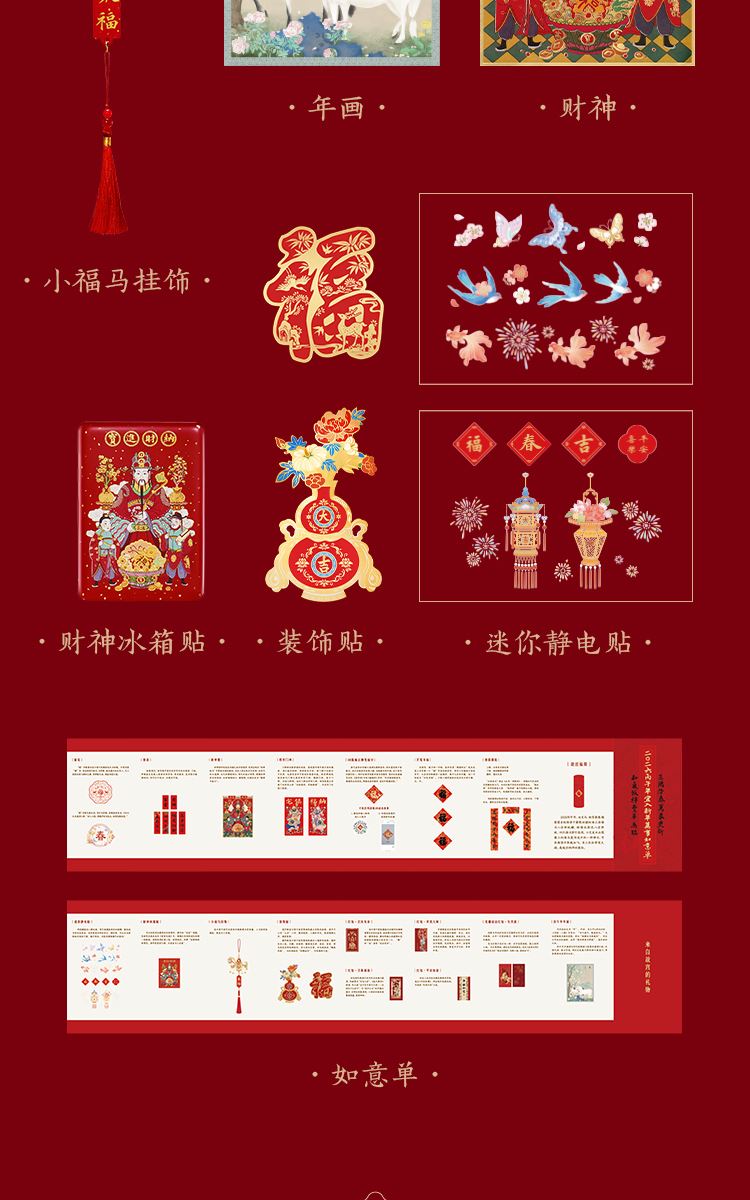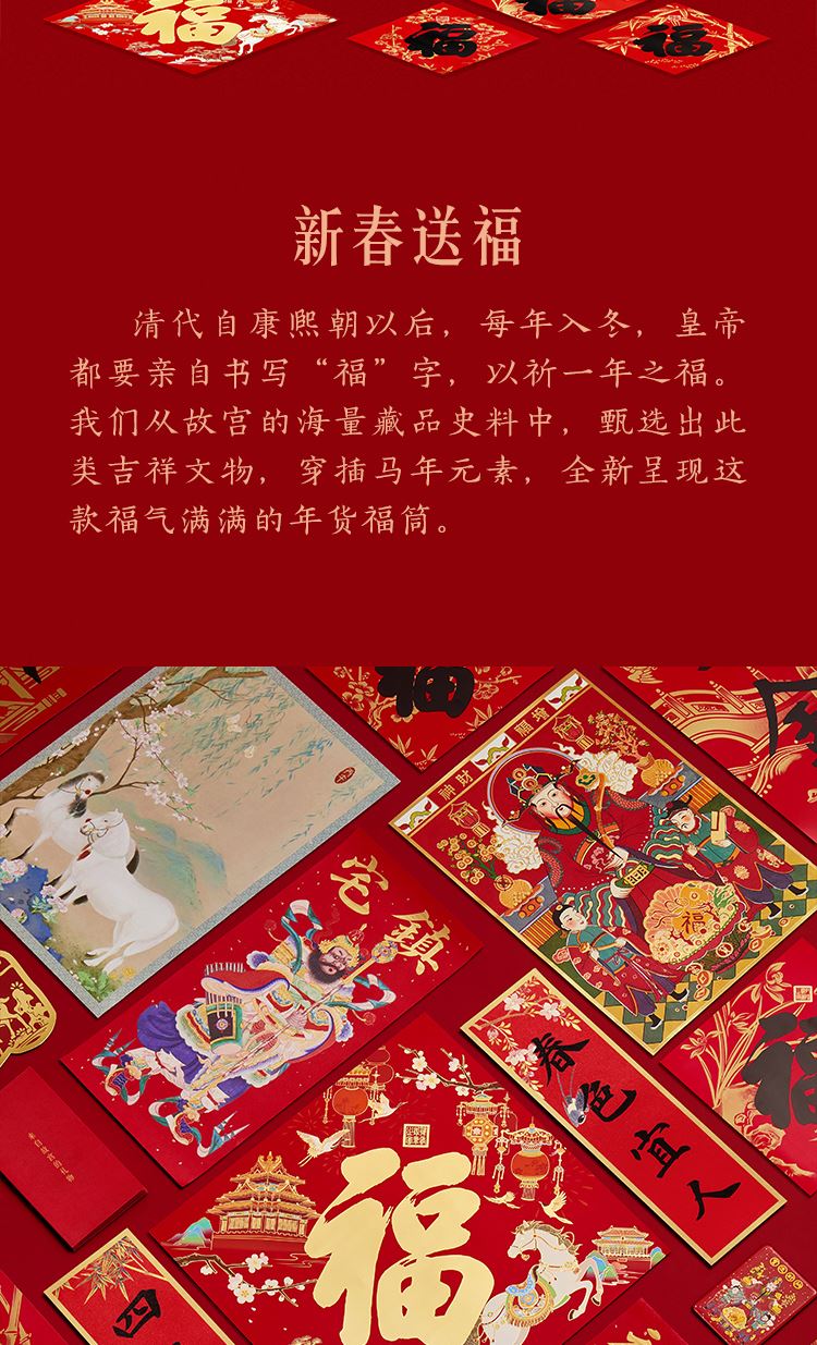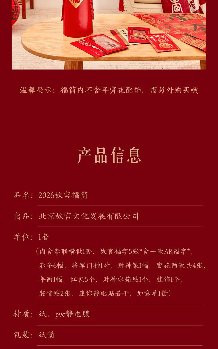 组成:1 套(内含春联横批 1 套,故宫福字 5 张含一款 AR 福字,春条 6 幅,将军门神 1 对,财神像 1 幅,窗花两款共 4 张,年画 1 幅,红包 5 个,财神冰箱贴 1 个,挂饰 1 个,装饰贴 2 张,迷你静电贴若干,如意单 1 册) 材质:纸、pvc 静电膜 包装:纸筒 福筒尺寸:12*38cm