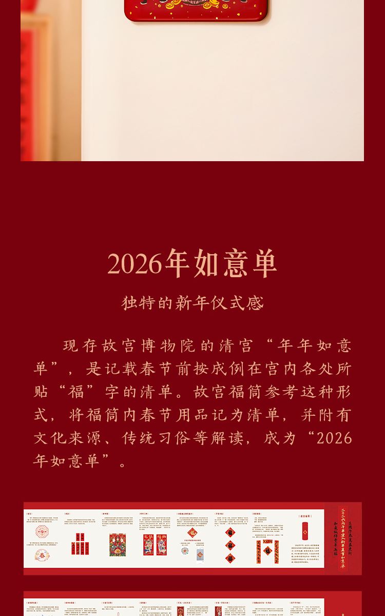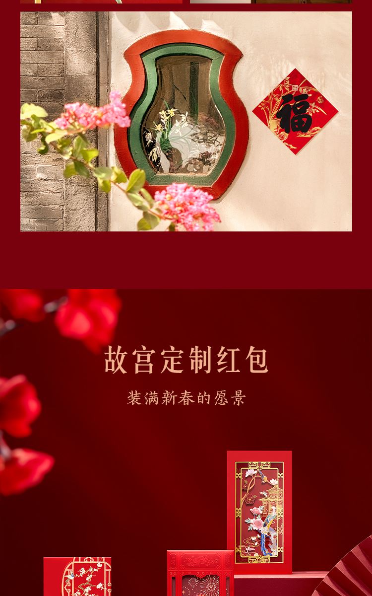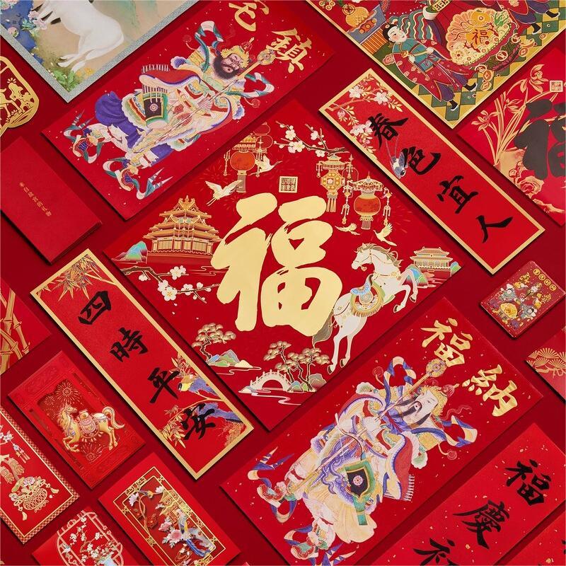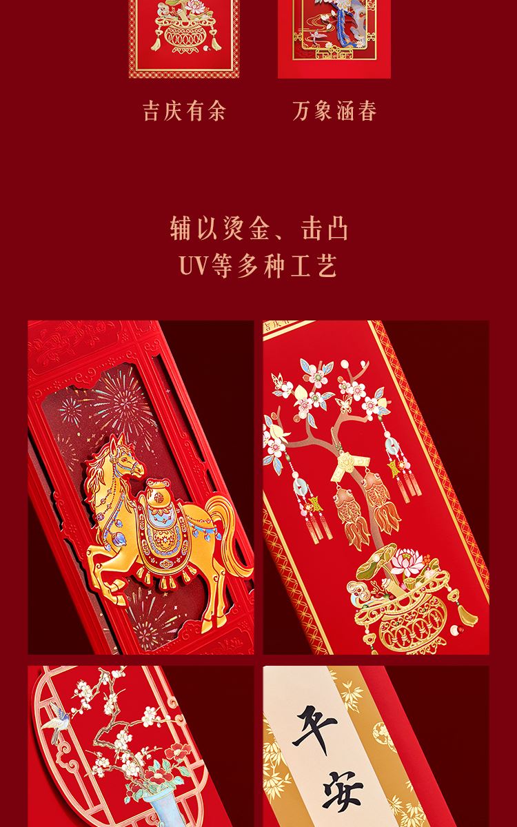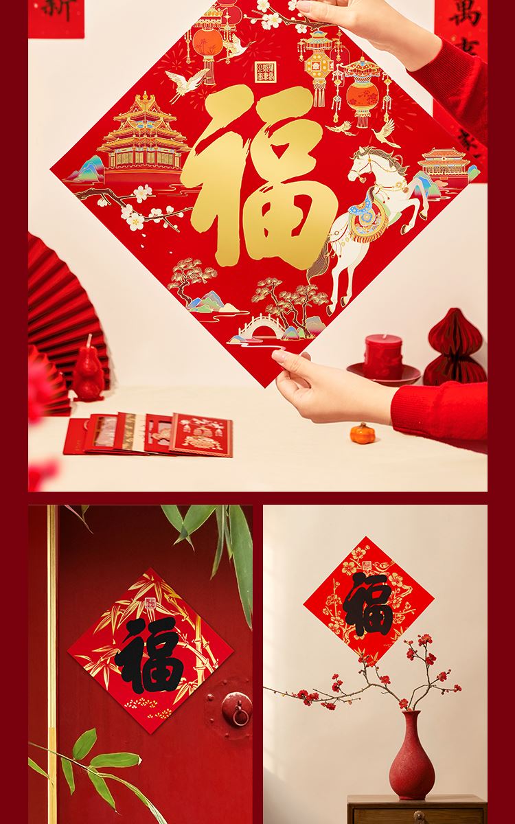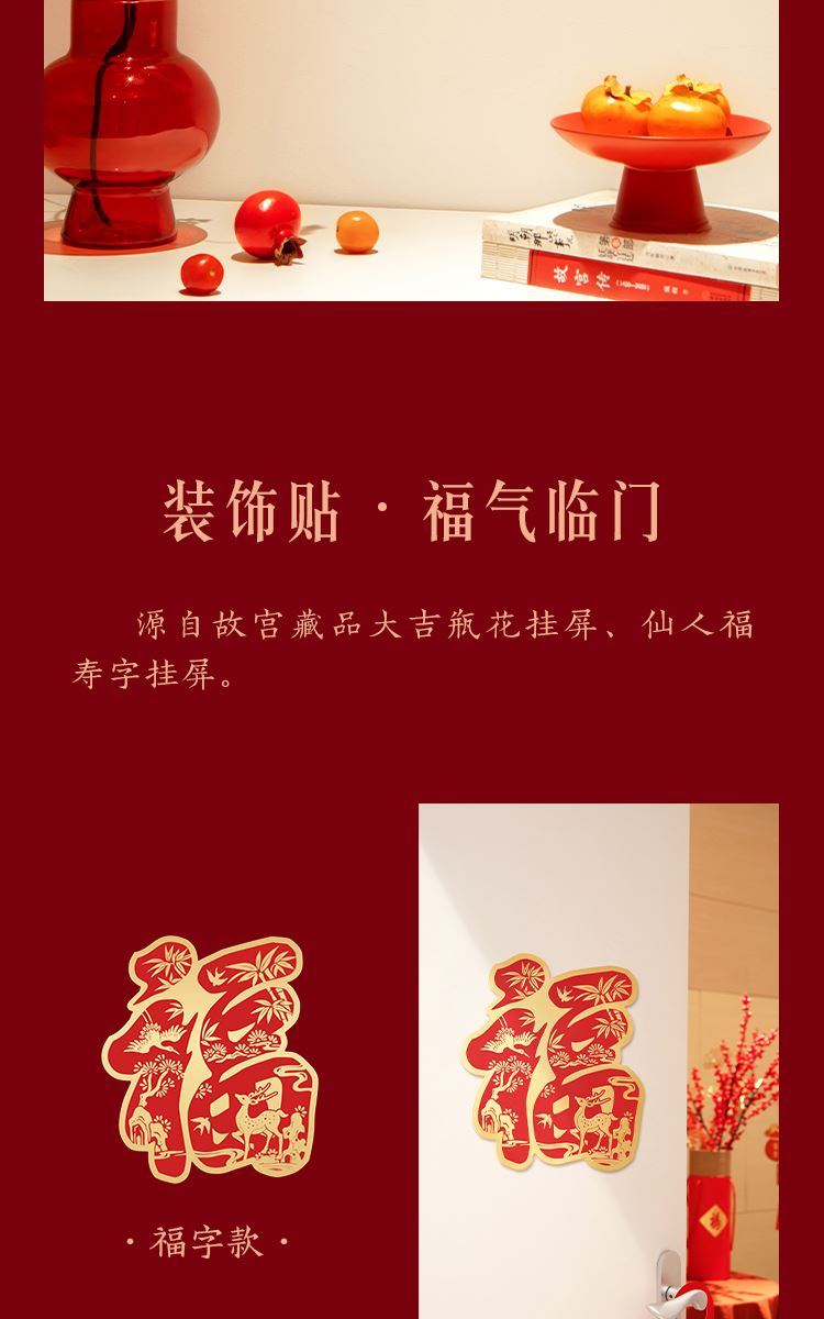 组成:1 套(内含春联横批 1 套,故宫福字 5 张含一款 AR 福字,春条 6 幅,将军门神 1 对,财神像 1 幅,窗花两款共 4 张,年画 1 幅,红包 5 个,财神冰箱贴 1 个,挂饰 1 个,装饰贴 2 张,迷你静电贴若干,如意单 1 册) 材质:纸、pvc 静电膜 包装:纸筒 福筒尺寸:12*38cm