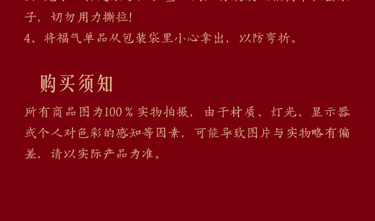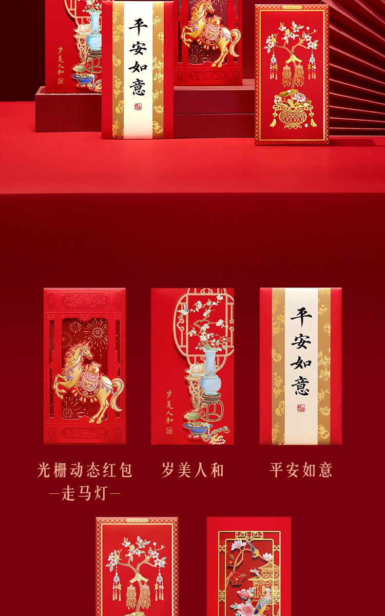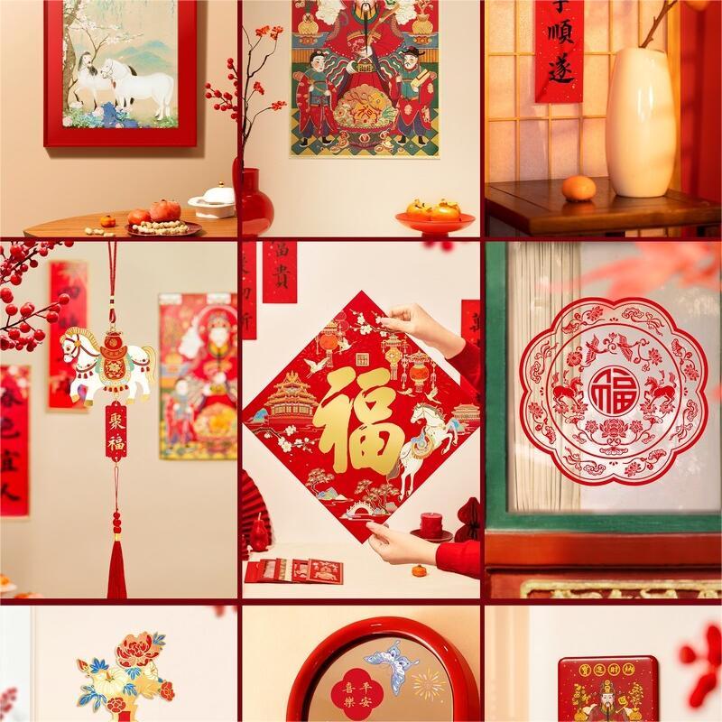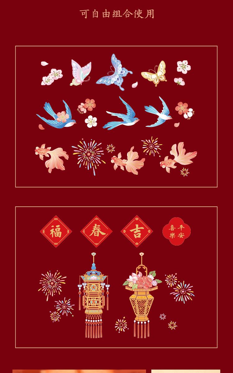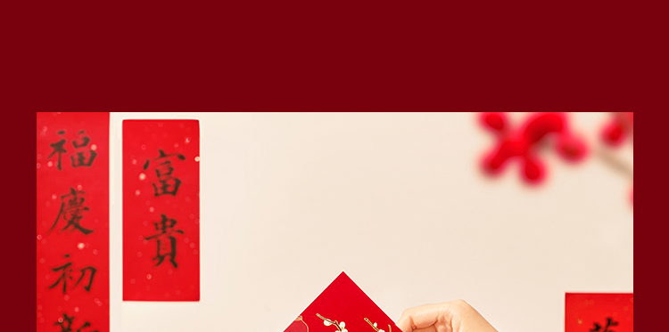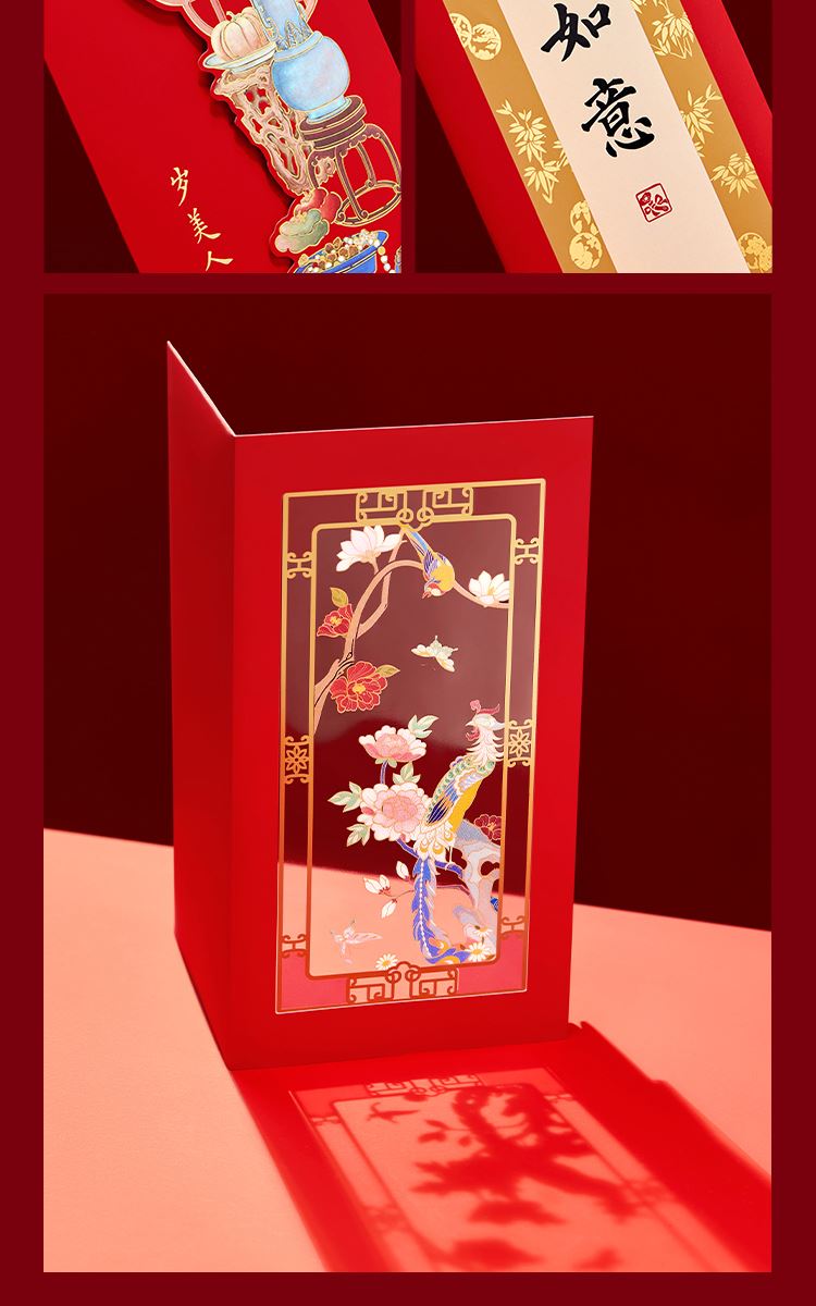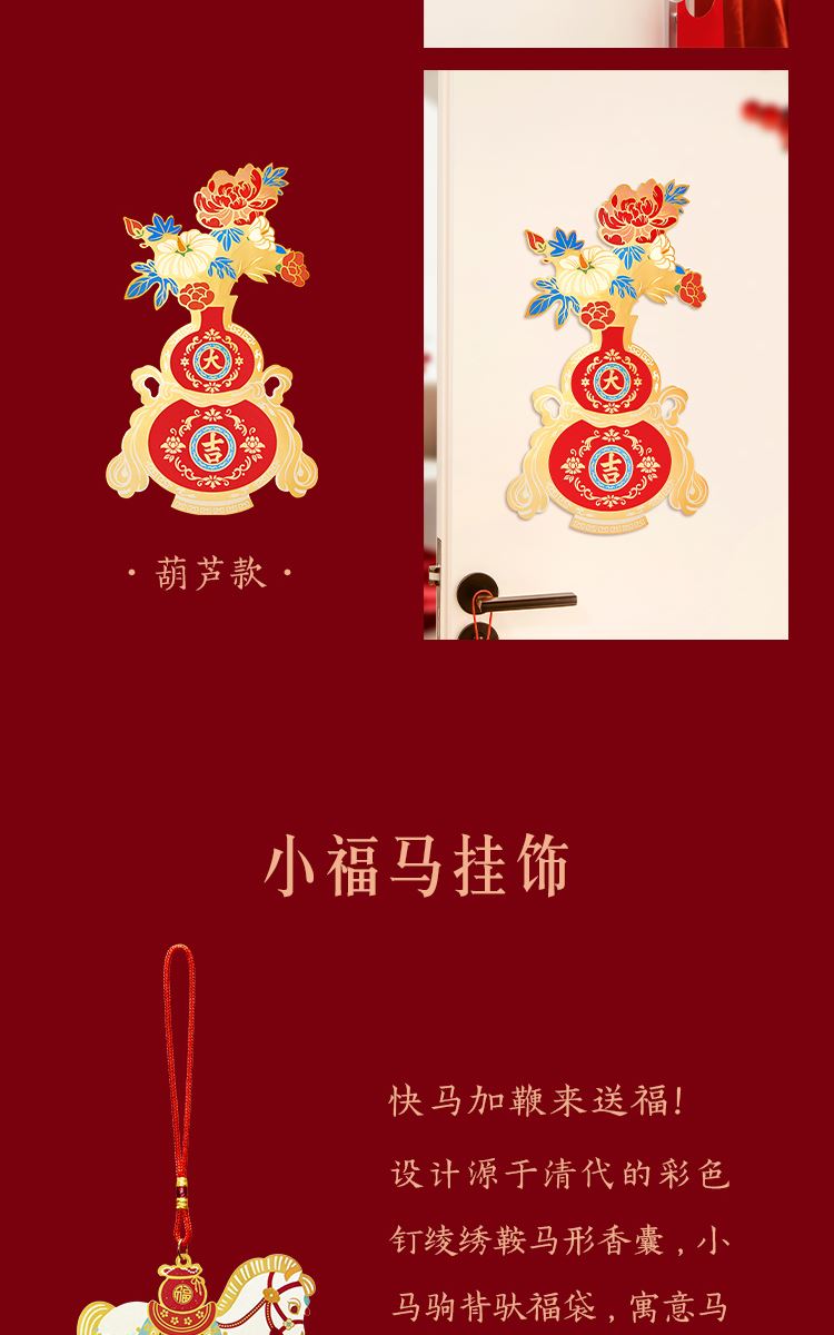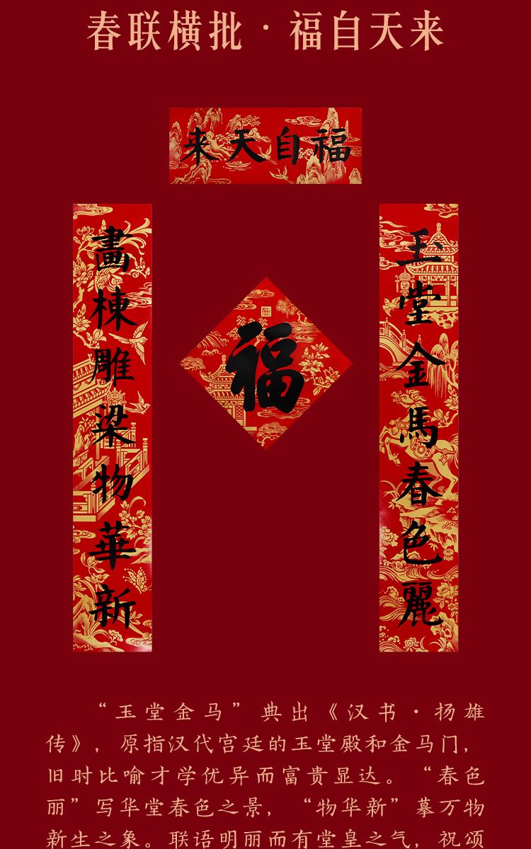 组成:1 套(内含春联横批 1 套,故宫福字 5 张含一款 AR 福字,春条 6 幅,将军门神 1 对,财神像 1 幅,窗花两款共 4 张,年画 1 幅,红包 5 个,财神冰箱贴 1 个,挂饰 1 个,装饰贴 2 张,迷你静电贴若干,如意单 1 册) 材质:纸、pvc 静电膜 包装:纸筒 福筒尺寸:12*38cm