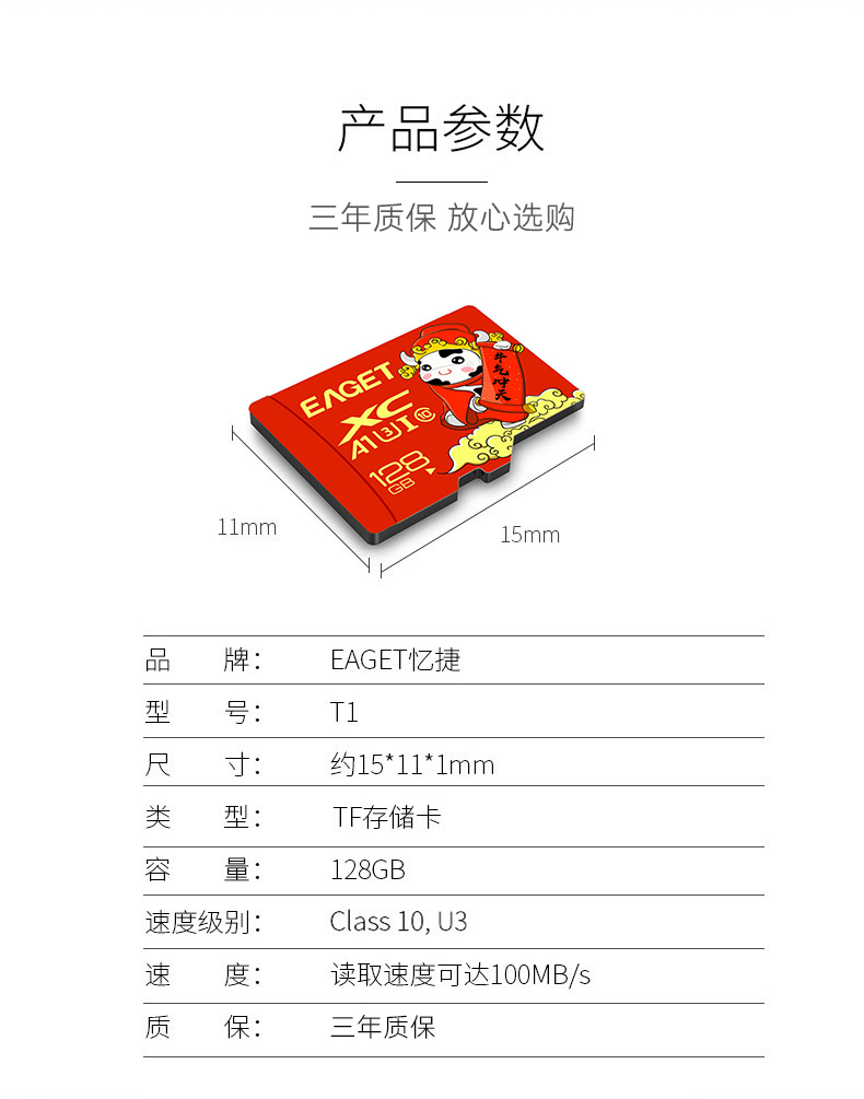 接口:micro 材质:ABS 速度:30mb/s(写入速度)120mb/s(读取速度) 多容量 多选择 海量存储 告别卡顿慢 一卡多用 兼容性强 使用寿命长 产品尺寸:15*11*1mm 包装尺寸:113*100*2mm 单品重量:3g