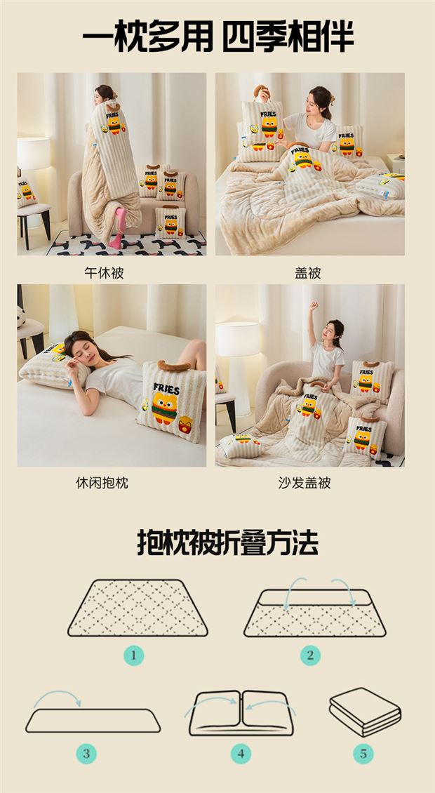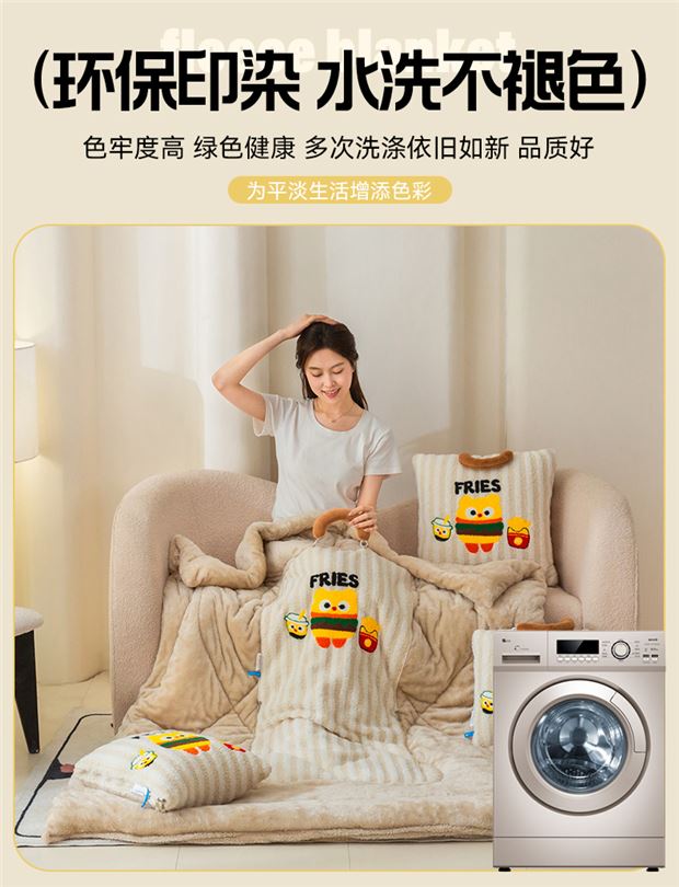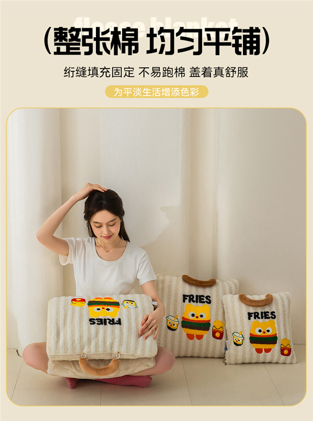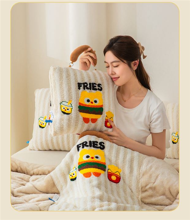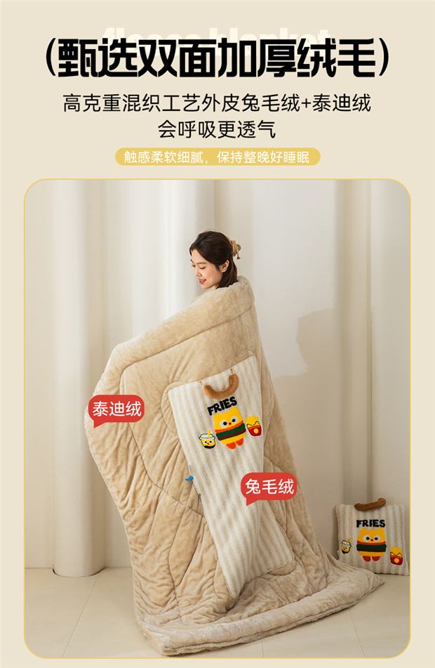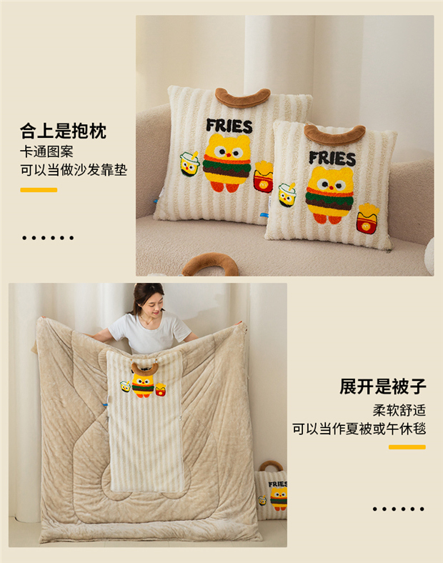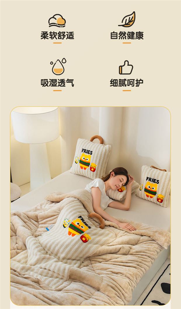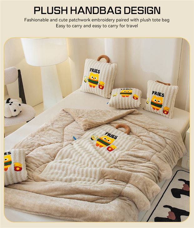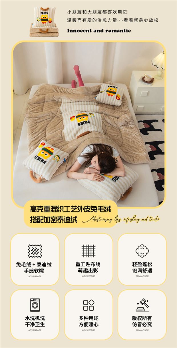 给您带来全新的产品享受!面料色彩艳丽,持久光鲜!不褪色!被子全部采长毛绒面料,柔软质感,吸湿透气, 舒适亲肤,四季好用!被子采用绗缝工艺,支持机洗、水洗! 面料:兔毛绒+泰迪绒 填充:整张羽丝棉 工艺:重工贴布绣+绗缝工艺 尺寸:40*40cm 打开100*150cm