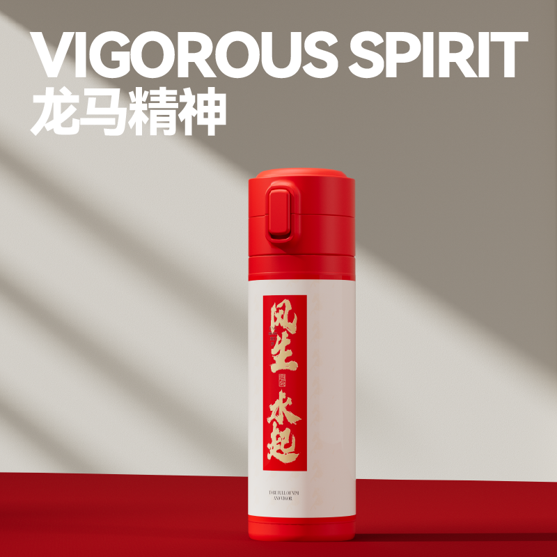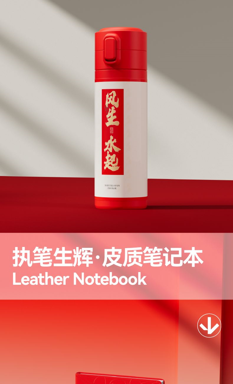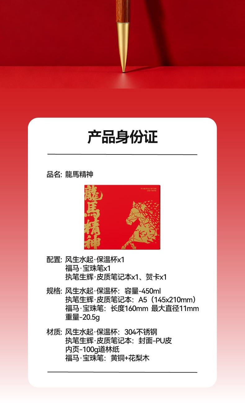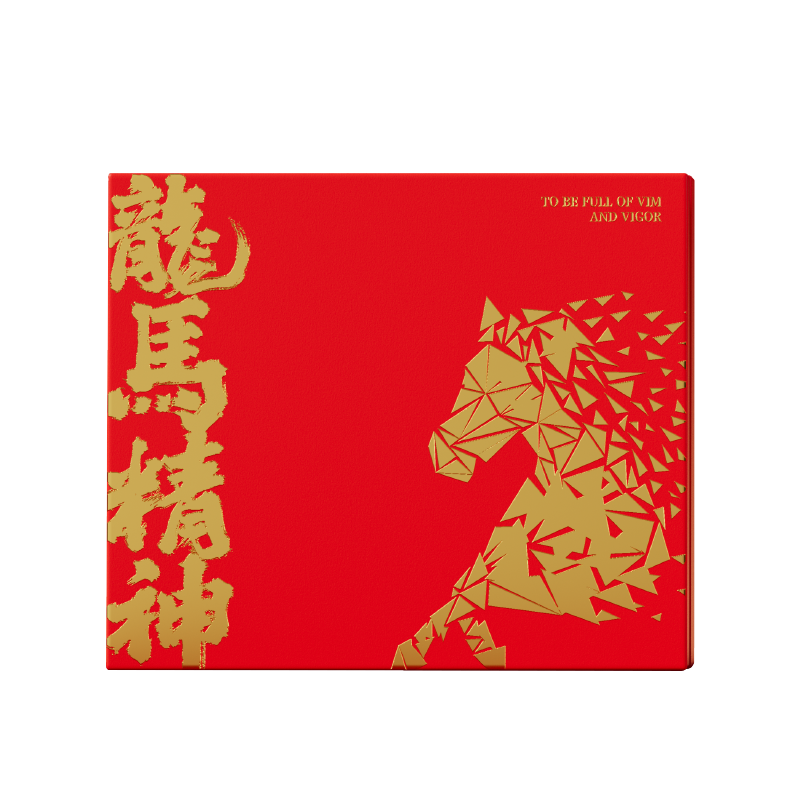 “龙马精神”是中华民族自古以来推崇的奋斗姿态。龙,代表非凡的志向与高度;马,象征踏实的前行与耐力。 礼盒设计紧扣“马”年主题,提炼了骏马奔腾时的矫健姿态与几何图案作为核心元素,整体动感十足,充满力量,直接传递出“龙马精神”所蕴含的蓬勃朝气与一往无前的进取之心。 整体配色喜庆而大气,融入新年祥瑞元素,不仅是一份诚意之礼,更是传递一份祝福:愿收礼之人在甲午马年,风生水起、马当先;龙马精神,万事如意。 礼盒配置 精装礼盒&手提袋 x1、风生水起·保温杯x1 福马·宝珠笔x1、执笔生辉·皮质笔记本x1、贺卡x1