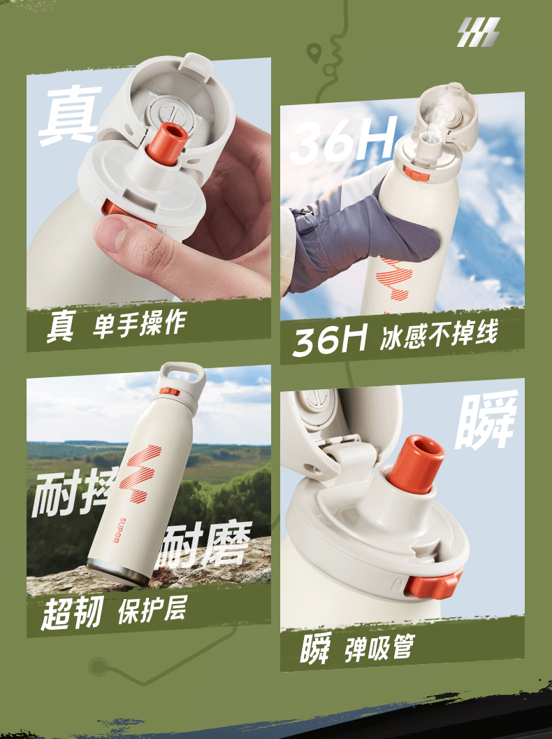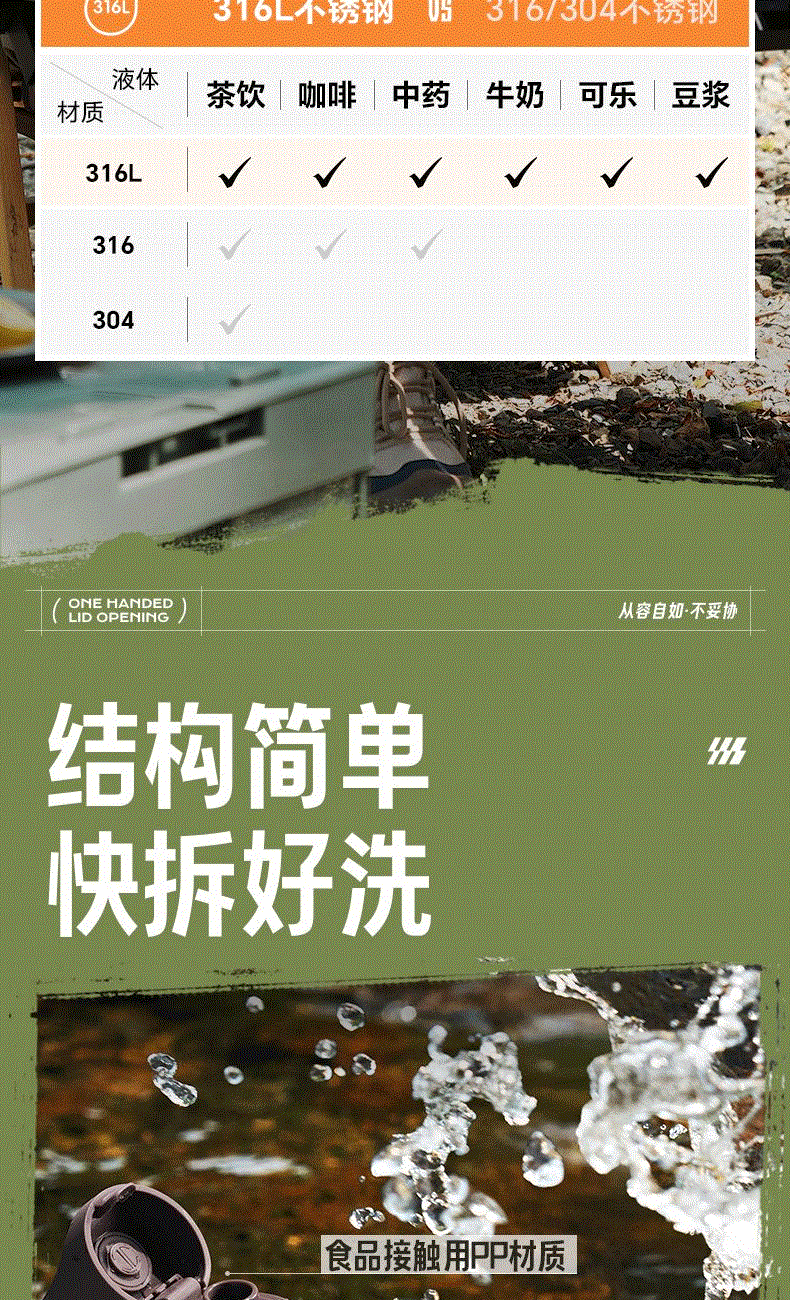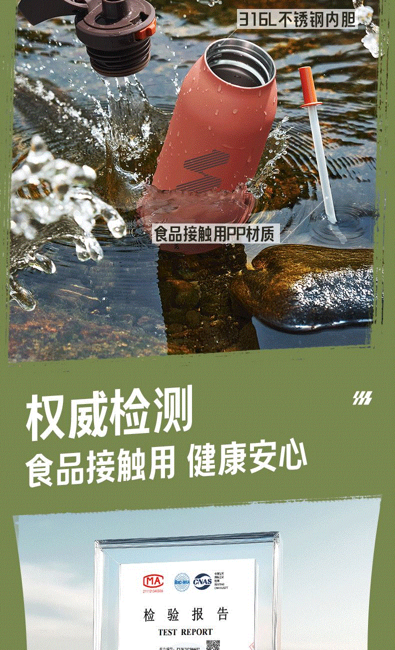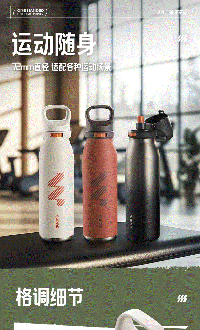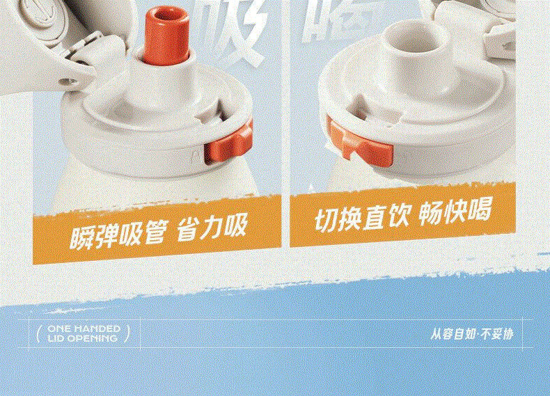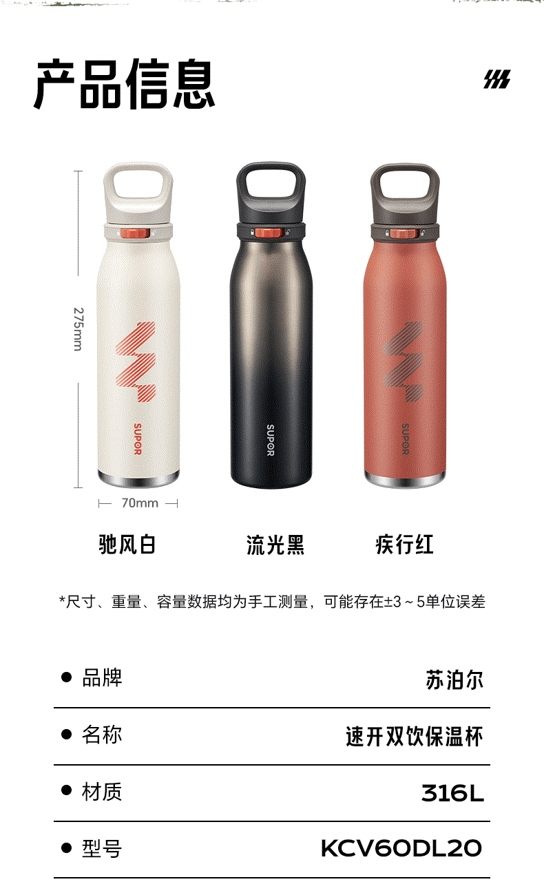 规格参数 产品说明 容量:600ml 材质:316L 功能卖点 1、600豪升大容量满足运动补水需求,补水不断电 2、大口径吸管+排气设计,吸饮畅快不费力 3、吸饮不费力 精巧小直径,入包随行无压力 4、运动中喝水:快开快饮水,单手可操作,吸管不呛水