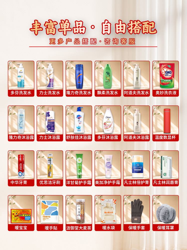 礼袋尺寸:20*27*10cm 包装尺寸:66* 45*51 CM 产品配置:(香型随机) 多芬洗发水380ml 多芬沐浴露300ml 凡士林保湿霜140g 珊瑚绒毛巾30*60cm 高露洁牙膏90g 高露洁牙刷 暖水袋500ml 海氏海诺好暖鸭暖贴(1片装/袋)*5袋 香港大药房裂可宁35g 李时珍蒸汽眼罩——5片/盒 精美礼袋