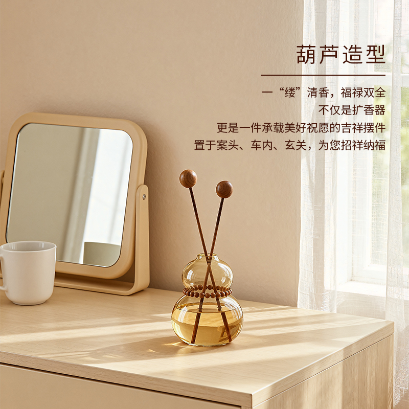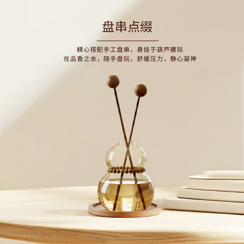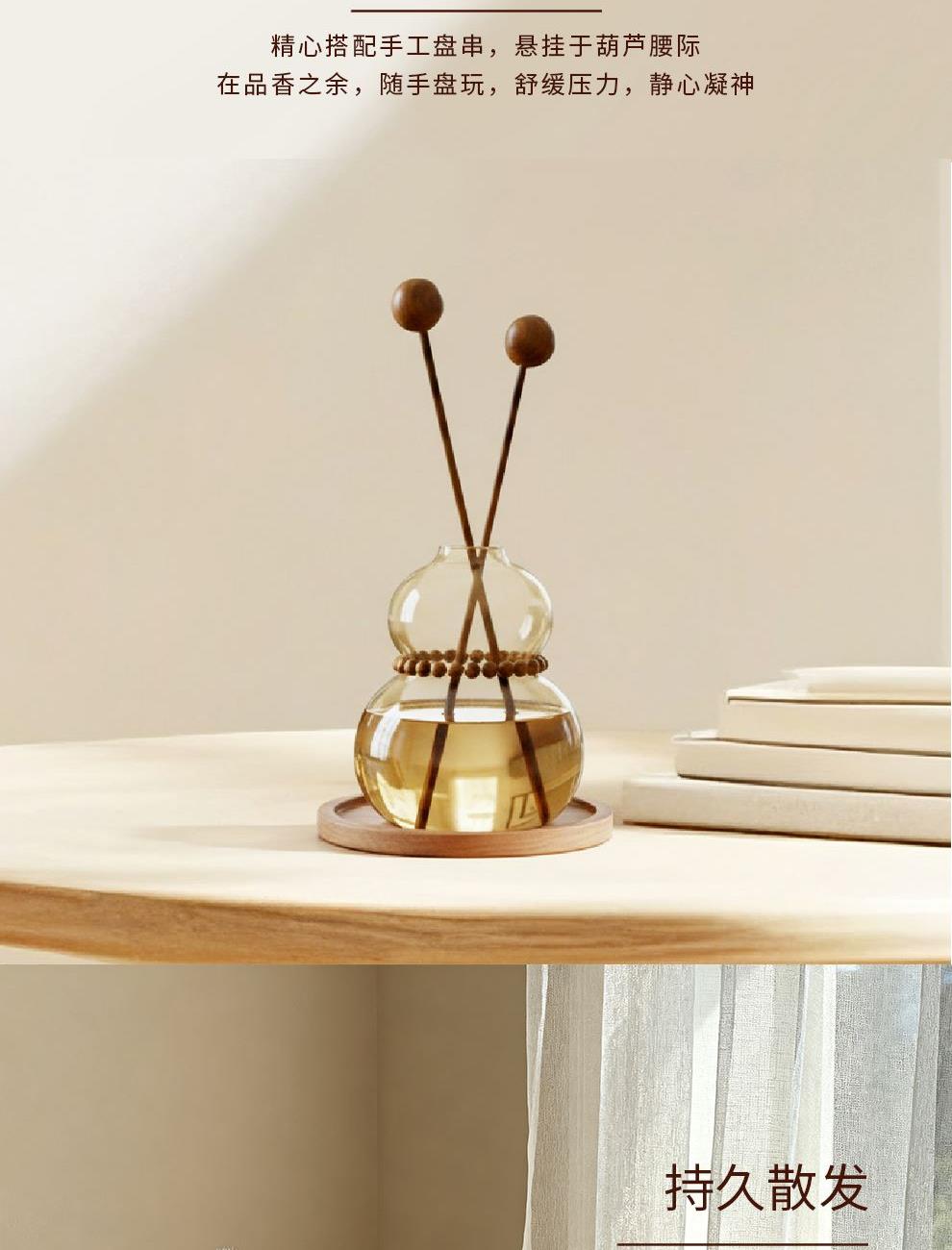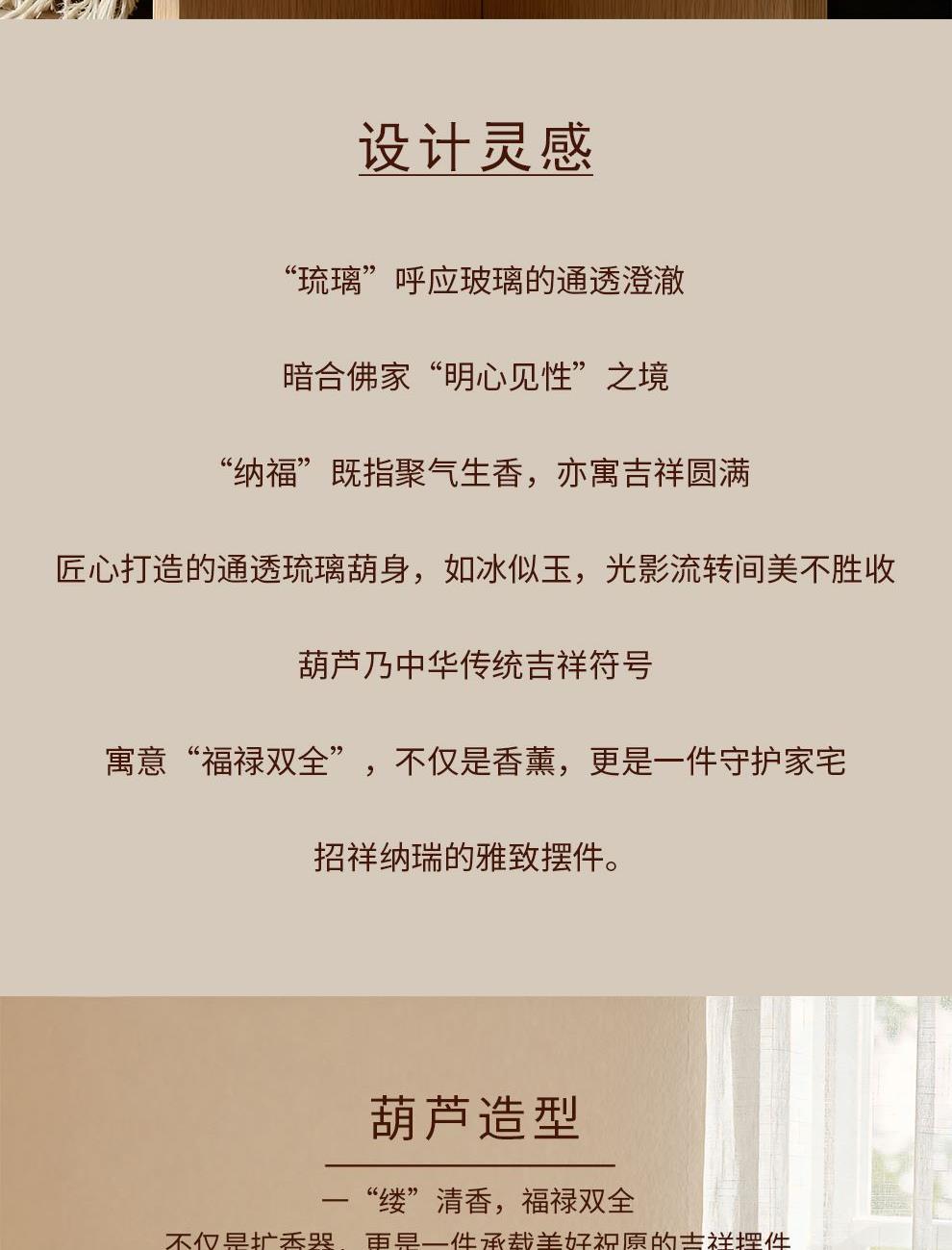 设计师说 “琉璃”呼应玻璃的通透澄澈,暗合佛家“明心见性”之境;“纳福”既指聚气生香,亦寓吉祥圆满。 匠心打造的通透琉璃葫身,如冰似玉,光影流转间美不胜收。葫芦乃中华传统吉祥符号,寓意“福禄双全”,不仅是香薰,更是一件守护家宅、招祥纳瑞的雅致摆件。 无声胜有声,有香如仙至 产品配置:小葫芦容器1,香薰精油50ml×2,檀木串1,扩香棒1