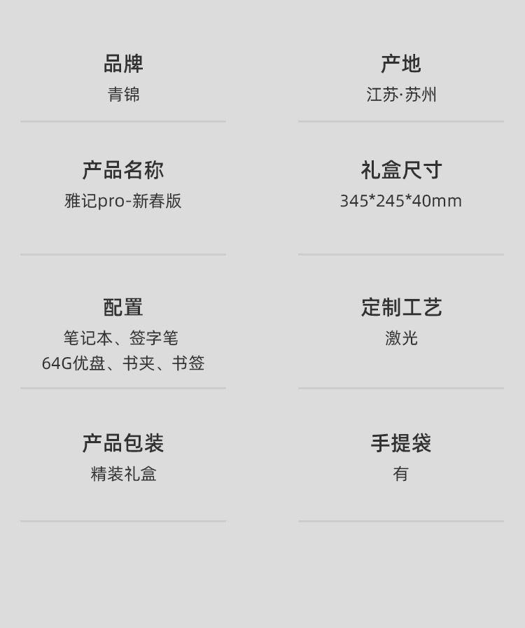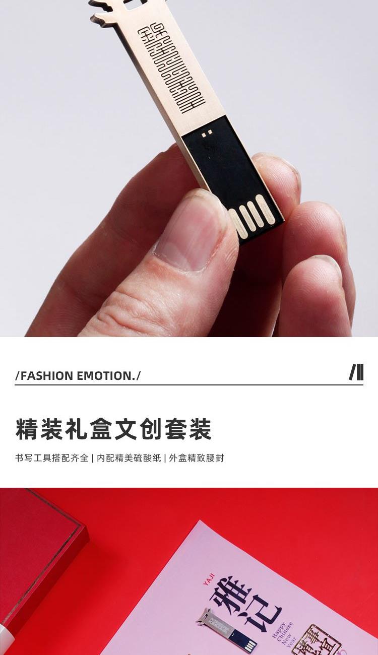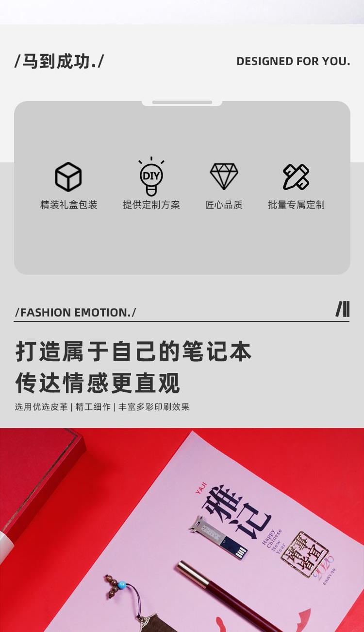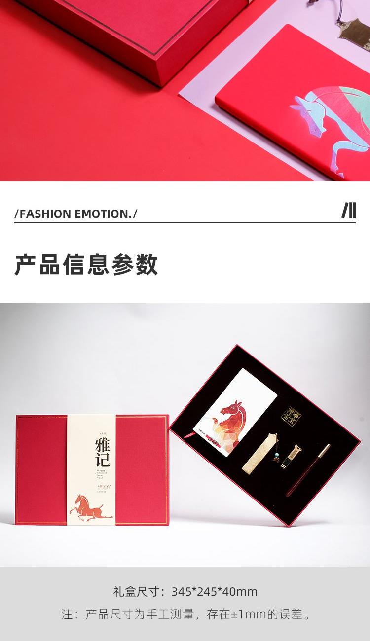 配置 贺岁绝影雅记记事本x1 黄铜书签 x1诸事皆宜书夹*1 科檀笔x1 存在u盘x1 材质 记事本 -PU皮料 ;黄铜书签-铜;科檀笔 -科檀;存在u盘 -合金 64G 记事本-裱贴技术-黄铜书签-蚀刻 记事本:100*175mm(48K) 礼盒:精装礼盒245*215mm 书写新的未来-企业定制年会定制-主题定制。
