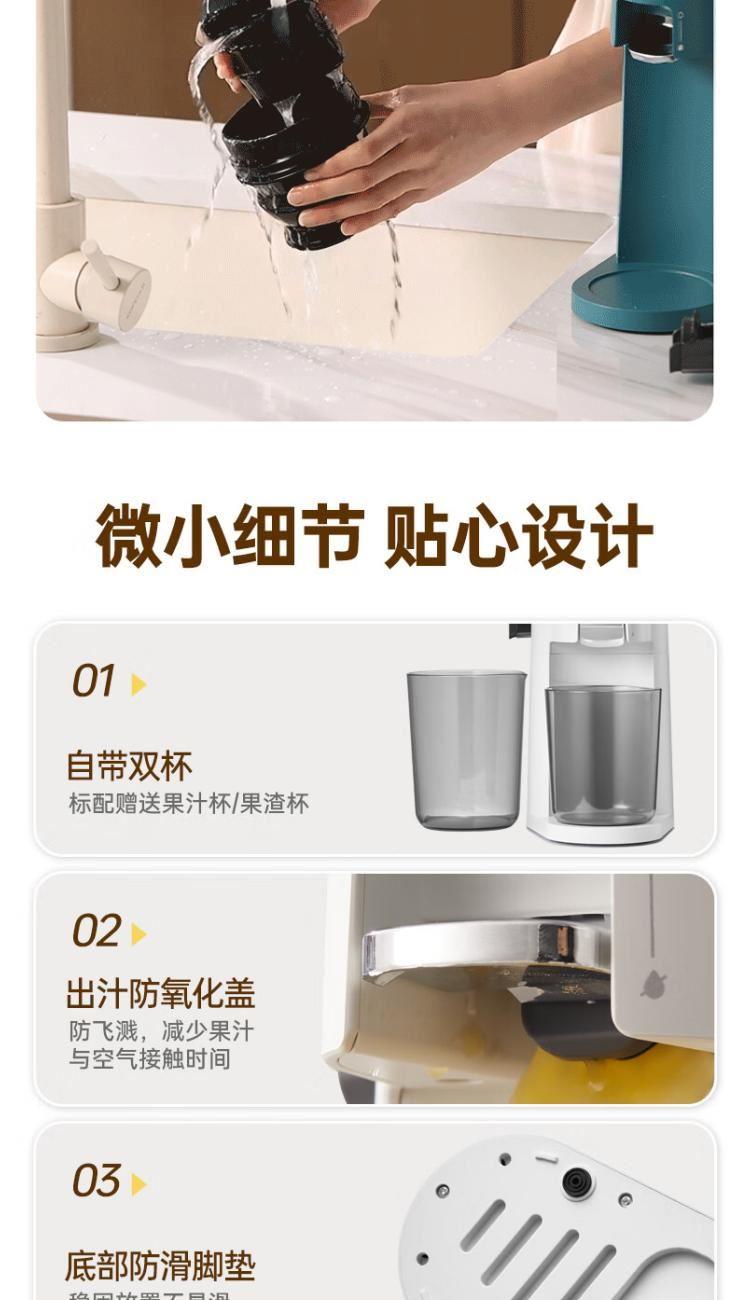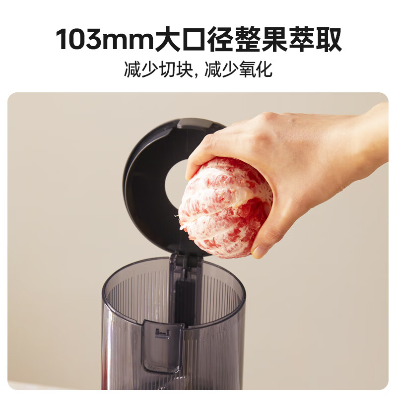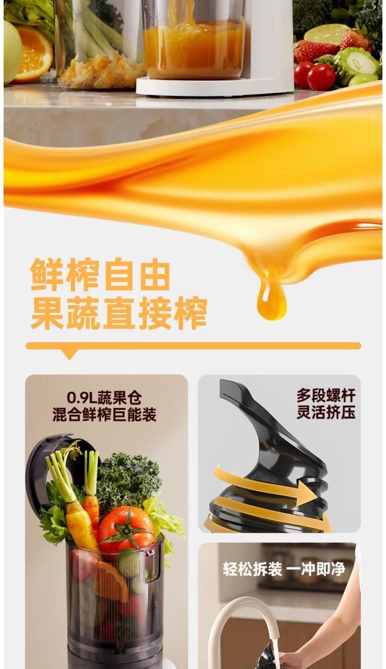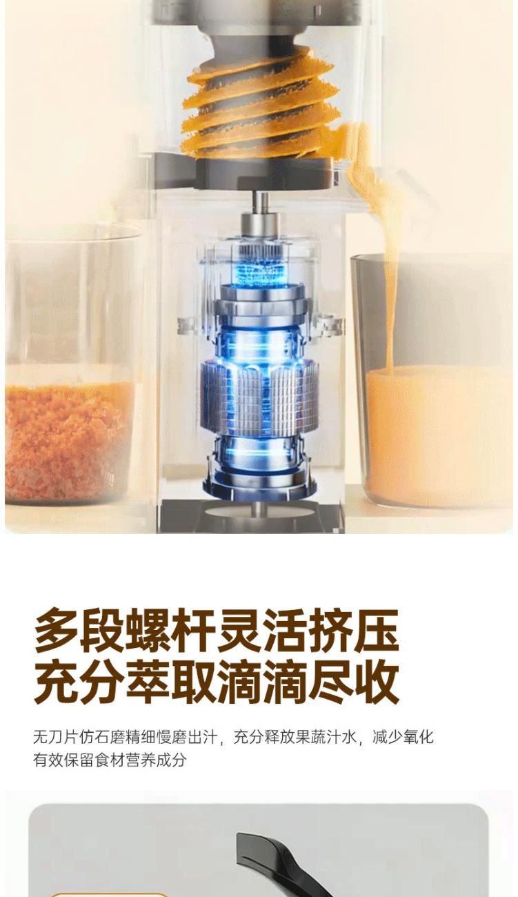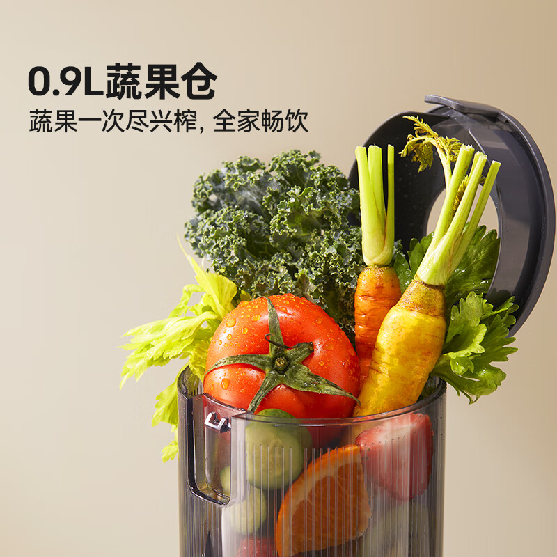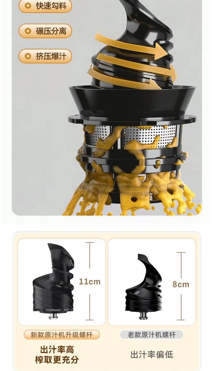额定功率:150W 额定电压:220V 原汁机口径尺寸:103mm 档位数:2档 果汁杯容量:600ml 果渣杯容量:900ml 净重:3.7kg 毛重:4.4kg 产品尺寸:132*207*397mm 包装尺寸:438*180*290mm 鲜榨自由 果蔬直接榨 变速螺旋挤压(像石磨)转速约 40-80转/分钟 口感浓郁、稠厚、分层慢几乎无泡沫,氧化程度低 低速冷压,产热少,氧化慢能保留更多活性酶和维生素 轻松拆卸一冲即净把时间还给生活