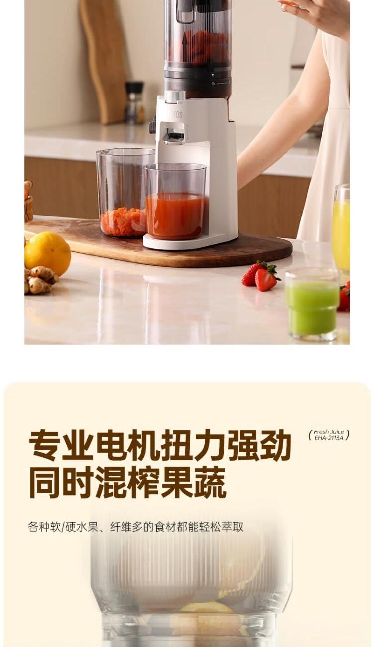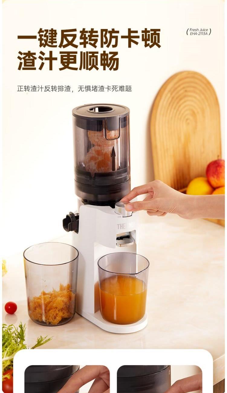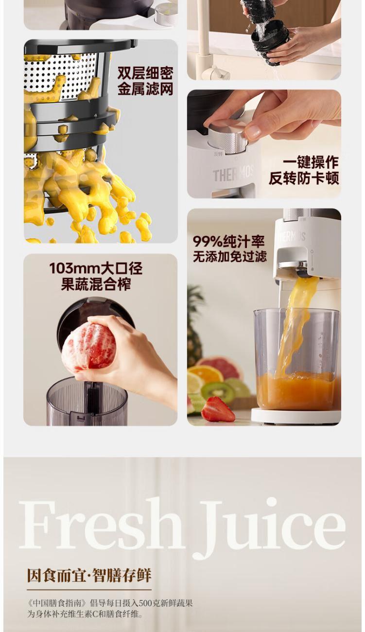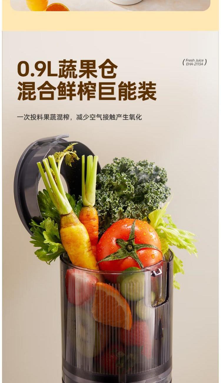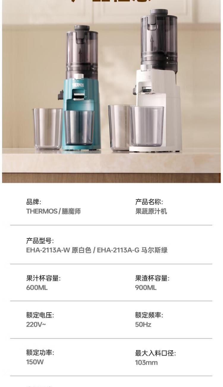 额定功率:150W 额定电压:220V 原汁机口径尺寸:103mm 档位数:2档 果汁杯容量:600ml 果渣杯容量:900ml 净重:3.7kg 毛重:4.4kg 产品尺寸:132*207*397mm 包装尺寸:438*180*290mm 鲜榨自由 果蔬直接榨 变速螺旋挤压(像石磨)转速约 40-80转/分钟 口感浓郁、稠厚、分层慢几乎无泡沫,氧化程度低 低速冷压,产热少,氧化慢能保留更多活性酶和维生素 轻松拆卸一冲即净把时间还给生活