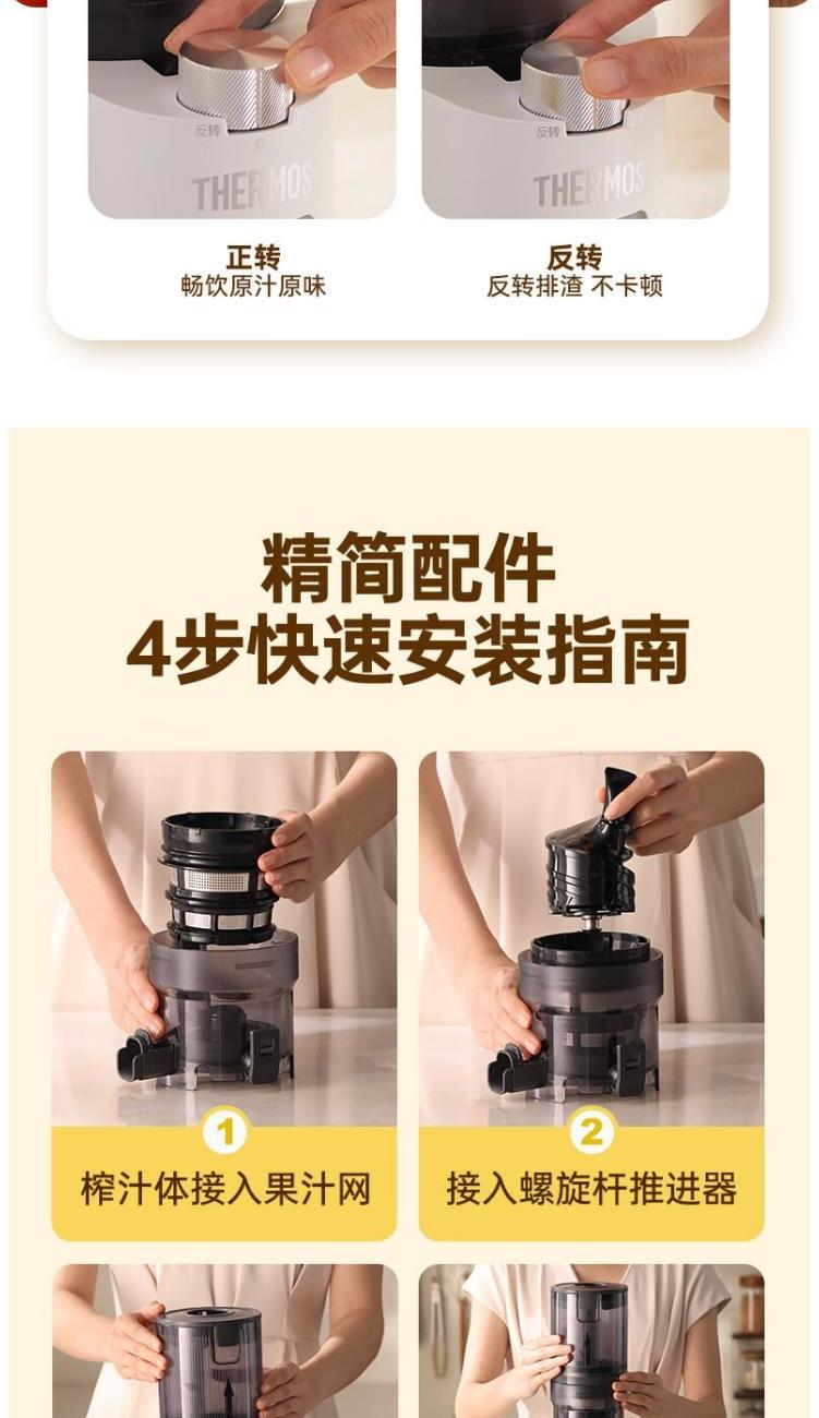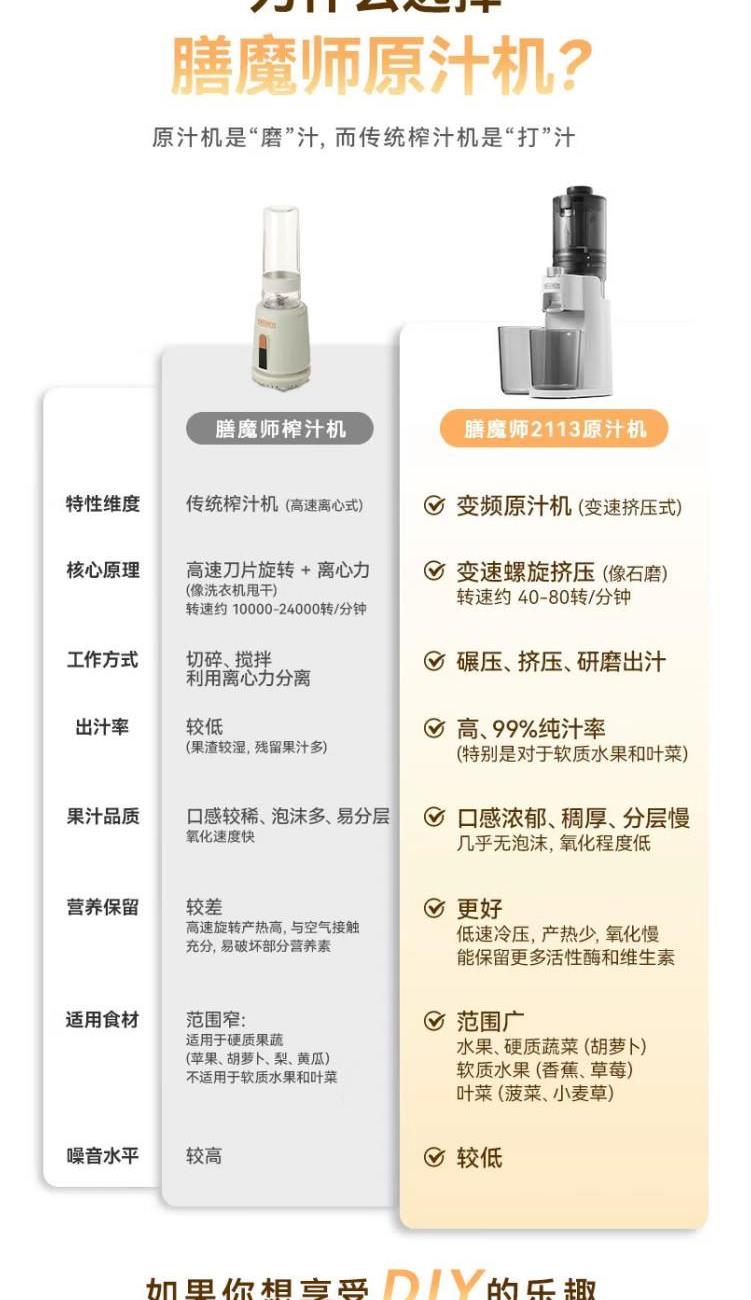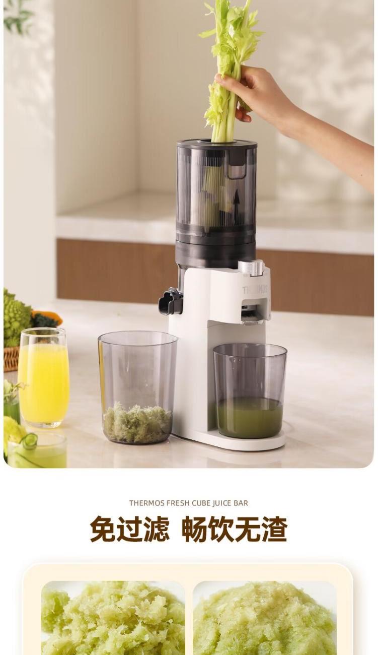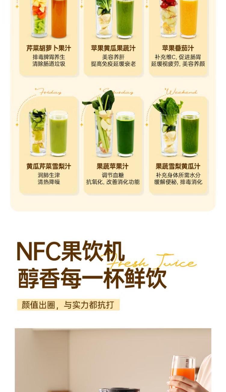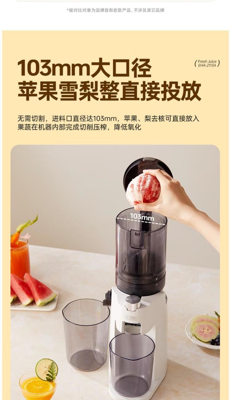 额定功率:150W 额定电压:220V 原汁机口径尺寸:103mm 档位数:2档 果汁杯容量:600ml 果渣杯容量:900ml 净重:3.7kg 毛重:4.4kg 产品尺寸:132*207*397mm 包装尺寸:438*180*290mm 鲜榨自由 果蔬直接榨 变速螺旋挤压(像石磨)转速约 40-80转/分钟 口感浓郁、稠厚、分层慢几乎无泡沫,氧化程度低 低速冷压,产热少,氧化慢能保留更多活性酶和维生素 轻松拆卸一冲即净把时间还给生活