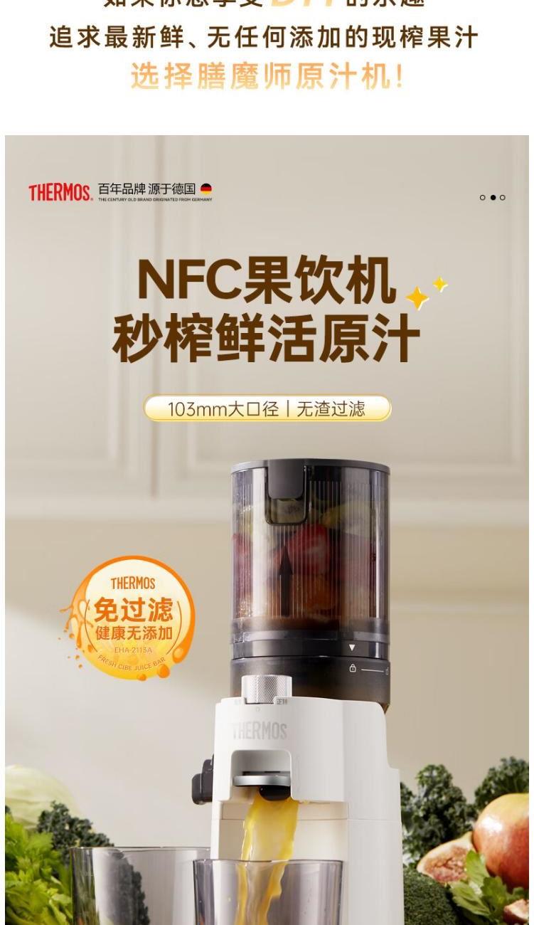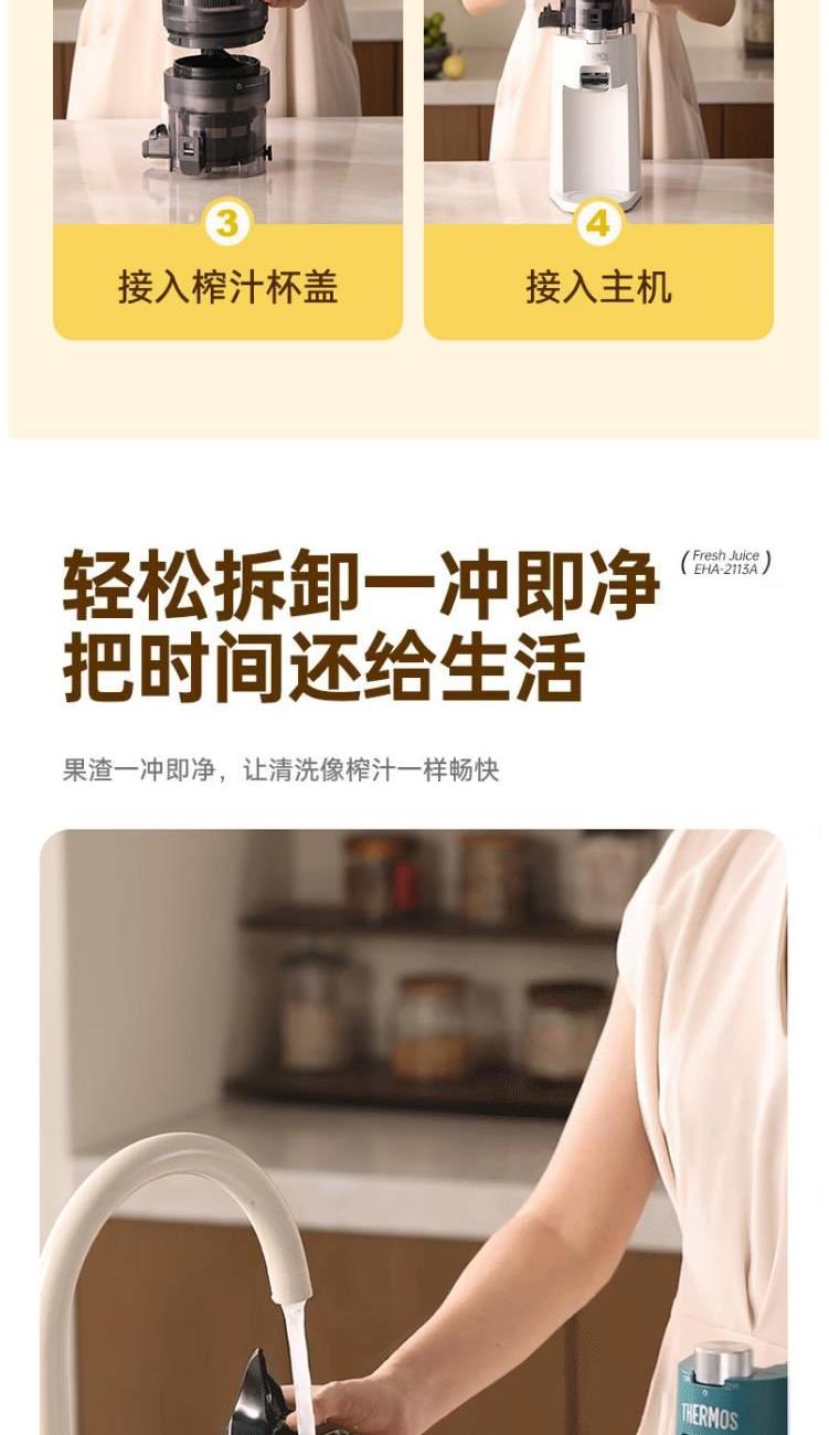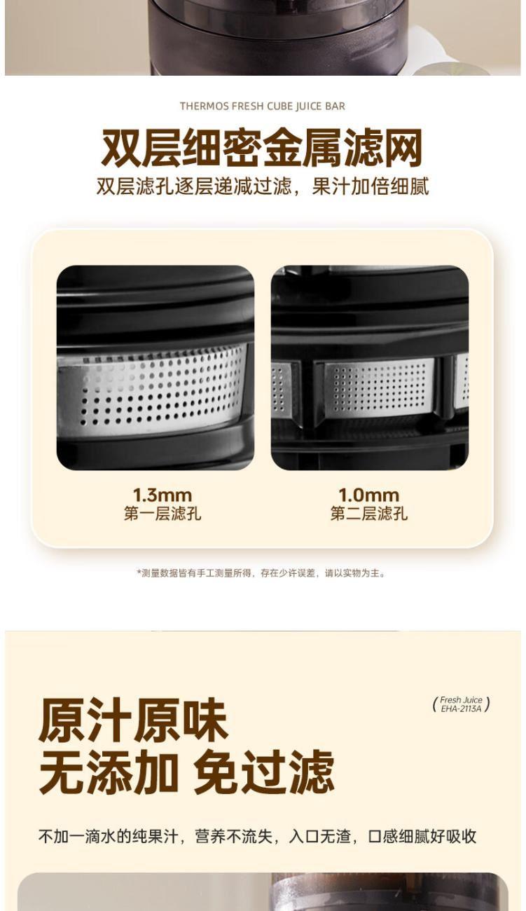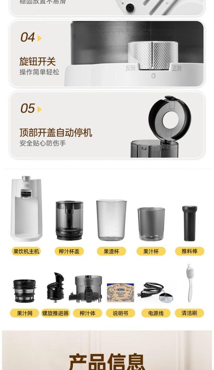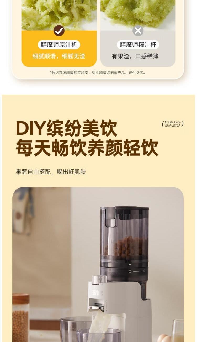 额定功率:150W 额定电压:220V 原汁机口径尺寸:103mm 档位数:2档 果汁杯容量:600ml 果渣杯容量:900ml 净重:3.7kg 毛重:4.4kg 产品尺寸:132*207*397mm 包装尺寸:438*180*290mm 鲜榨自由 果蔬直接榨 变速螺旋挤压(像石磨)转速约 40-80转/分钟 口感浓郁、稠厚、分层慢几乎无泡沫,氧化程度低 低速冷压,产热少,氧化慢能保留更多活性酶和维生素 轻松拆卸一冲即净把时间还给生活