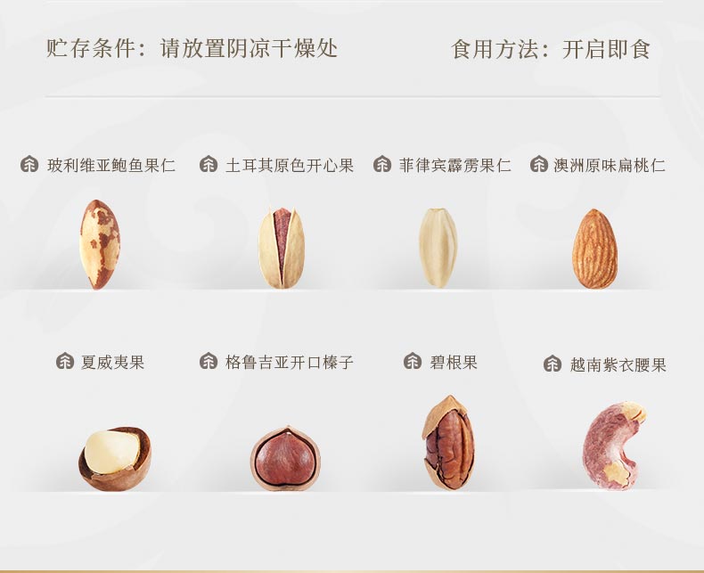 100g菲律宾霹雳果仁*1 120g土耳其原色开心果*1 30g澳洲原味扁桃仁*4 15g脱衣核桃仁*4 17g格鲁吉亚开口榛子*4 120g玻利维亚鲍鱼果仁*1 100g夏威夷果 90g开口香榧 90g碧根果 110g小白杏核*1 100g越南紫衣腰果*1 340g智利汤姆森提子干*1 340g乌兹别克黑加仑干*1 340g智利车厘子干*1