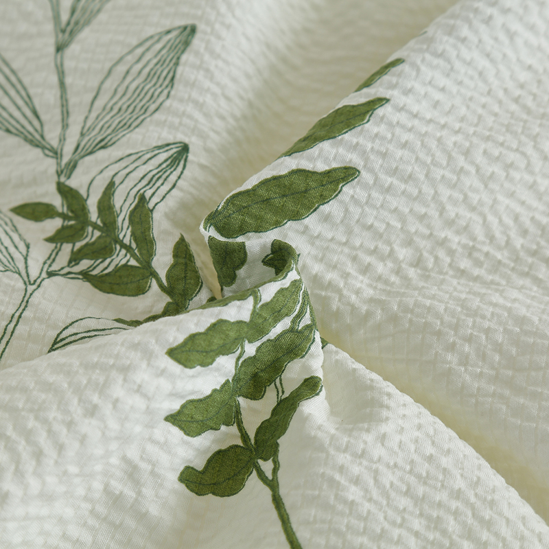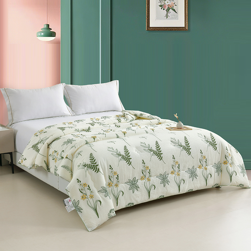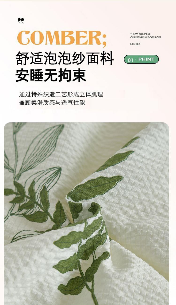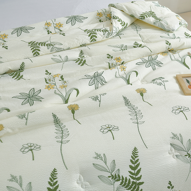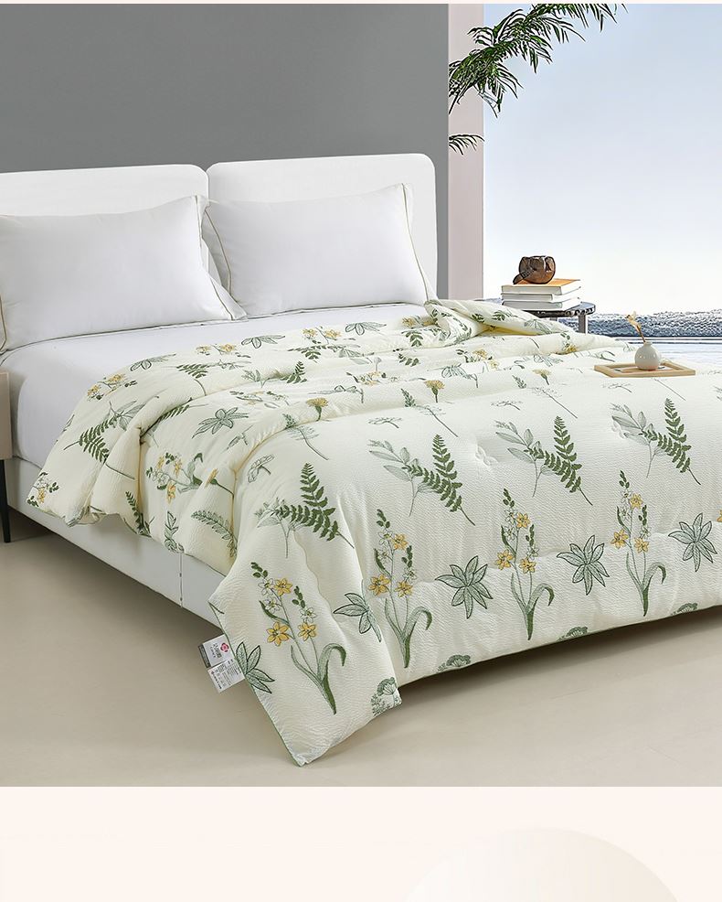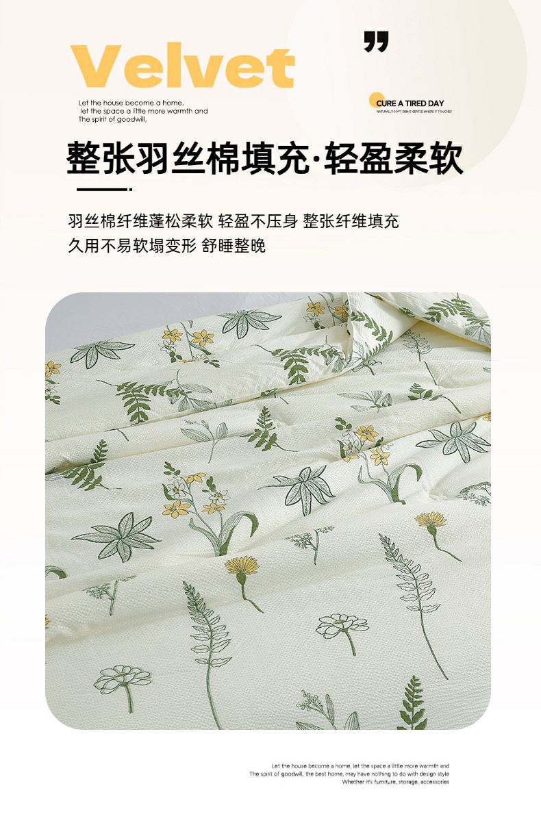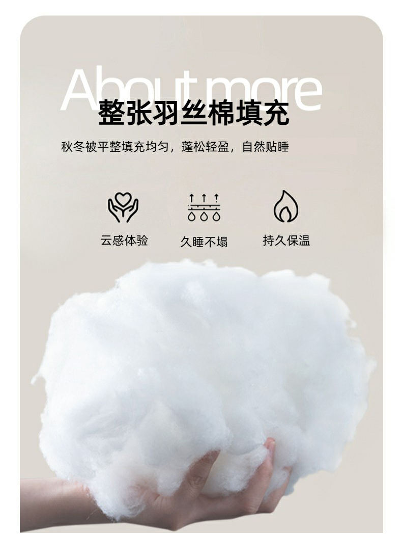规格:200*230cm 面料:泡泡纱 填充:羽丝棉 重量:2300g 执行标准:GB/T22796-2021 安全类别:GB18401-2010 B类 1.泡泡纱面料通过特殊织造工艺形成立体肌理,减少与皮肤的直接接触,兼顾柔滑质感与透气性能。 2.羽丝棉填充均匀饱满,不易结块变形,长久保持蓬松柔软。整被可机洗易打理,持久耐用,适合秋冬季节使用,带来干爽温暖、呼吸自在的舒适睡眠体验。