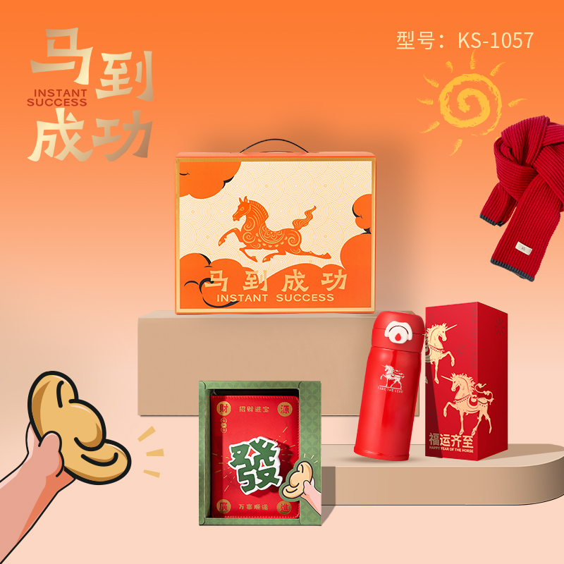橙米撞色礼盒,搭配烫金复古骏马主题插画,时尚亮眼,新年氛围瞬间拉满。“马到成功”,是更适合商务伙伴与新老客户的新年祝福佳品,心意与寓意兼得。