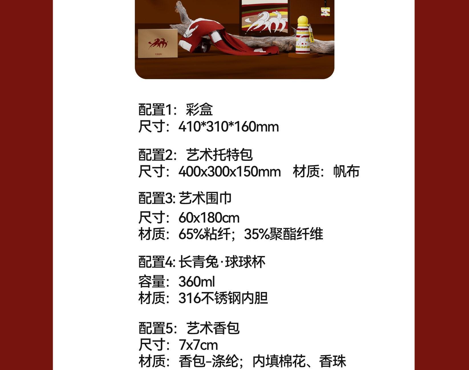 礼盒配置 艺术牛皮纸盒x1、长青兔·艺术托特包x1 长青兔·球球杯x1、长青兔·艺术围巾x1 长青兔·艺术香包x1、贺卡x1