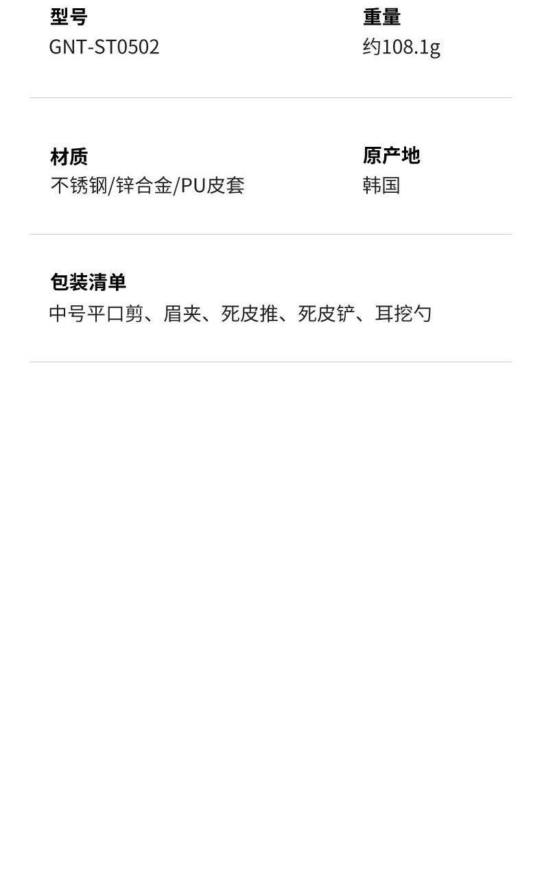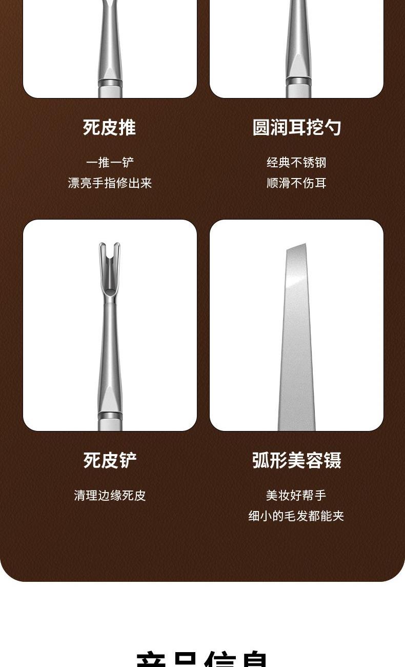 材质:优质不锈钢、pu 规格:126*67*26mm 产品颜色:棕色 套装内容:5件套 产品配件:锌合金中号平口、眉夹、耳挖、死皮推、死皮铲 产品卖点: 1)精致礼盒,仪式感拉满:搭配质感礼盒,从外观到包装都尽显格调,无论是自用还是送礼,都能传递出从指尖到心底的仪式感,情意不言而喻。 2)贴心配置,满足多样需求:内含多种美甲美护工具,精心设计的件数搭配,应对指甲修剪、死皮处理等不同需求,为手部护理提供便利。 3)匠心皮套,便携又美观:采用独特造型的皮套,不仅能妥善收纳工具,还方便携带。