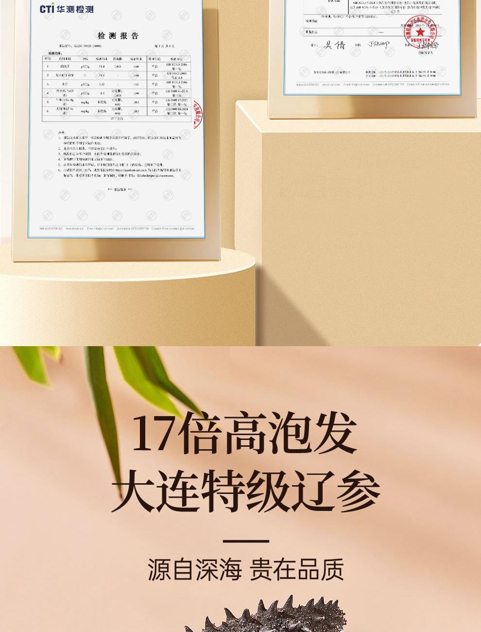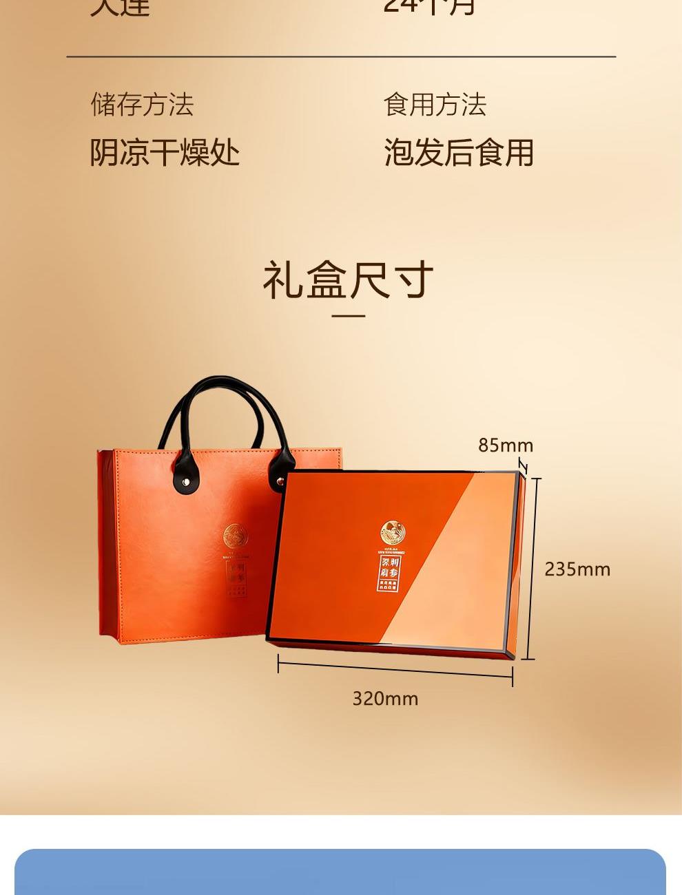 源自大连北纬39°黄金海域,冷水慢养,造就出众品质。 采用传统淡干工艺,营养保留更完整,更便于储存与运输。 富含优质蛋白与多种微量元素,特有的海参多糖与皂苷。 泡发后肉质肥厚,口感Q弹劲道,鲜美醇正。
