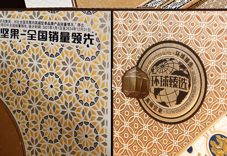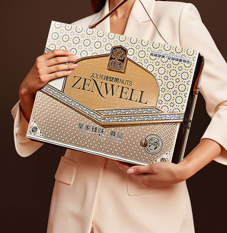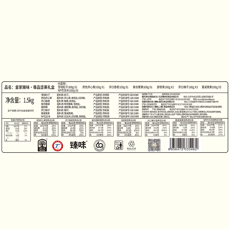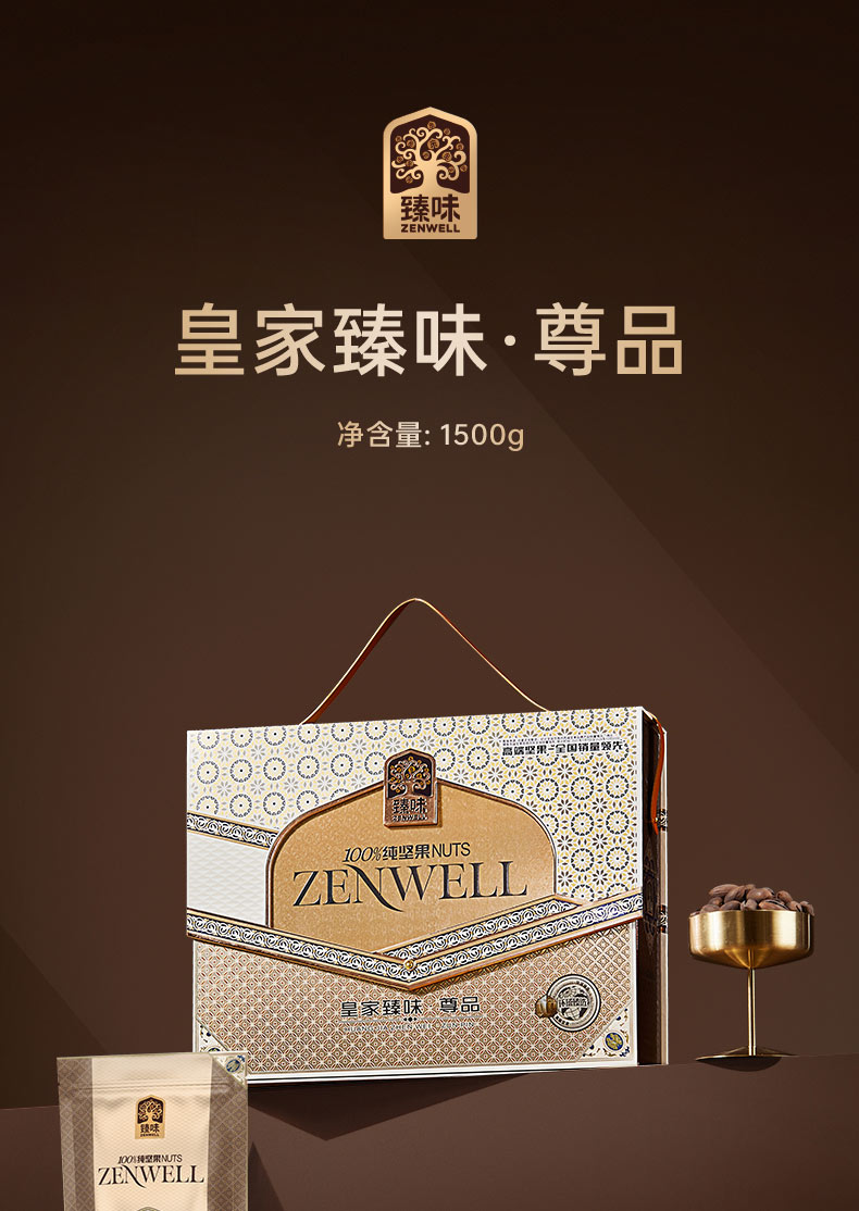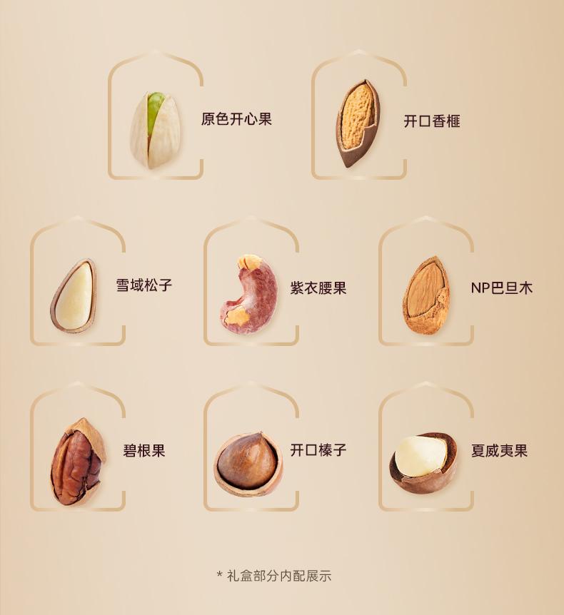 100g雪域松子*1 100g原色开心果*1 100g开口香榧*1 100g紫衣腰果*1 100g碧根果*2 100g开口榛子*3 100g夏威夷果*3 100gNP巴旦木*3 独特翻盖手提盒型,搭配皮质手提与精致华丽的宫廷风格花纹装饰,营造出典雅庄重的皇家氛围; 净含量:1500g,内含8种纯坚果,方便携带的同时,更显礼盒的尊贵格调。