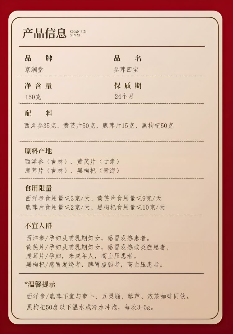 内配:西洋参35克、黄芪片50克、鹿茸片15克、黑枸杞50克 卖点: ✅ 珍贵食材 精挑细选 ✅ 传统滋补 现代工艺 ✅ 高贵礼赠 彰显品味 ✅ 四季养生 倍添活力 一份礼盒,四重滋养,百分诚意🎉