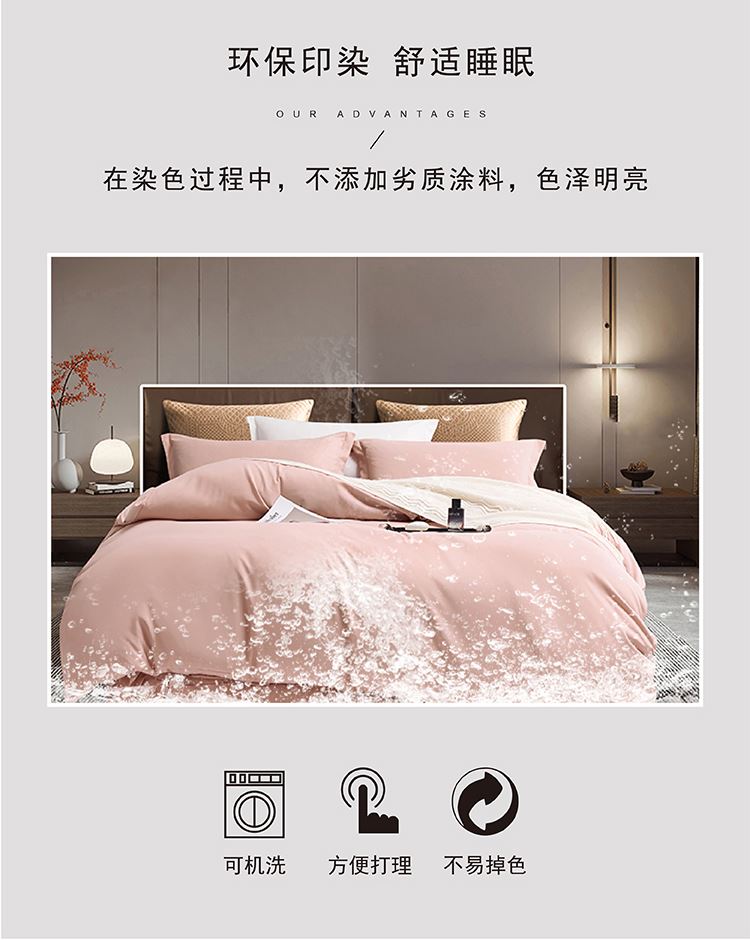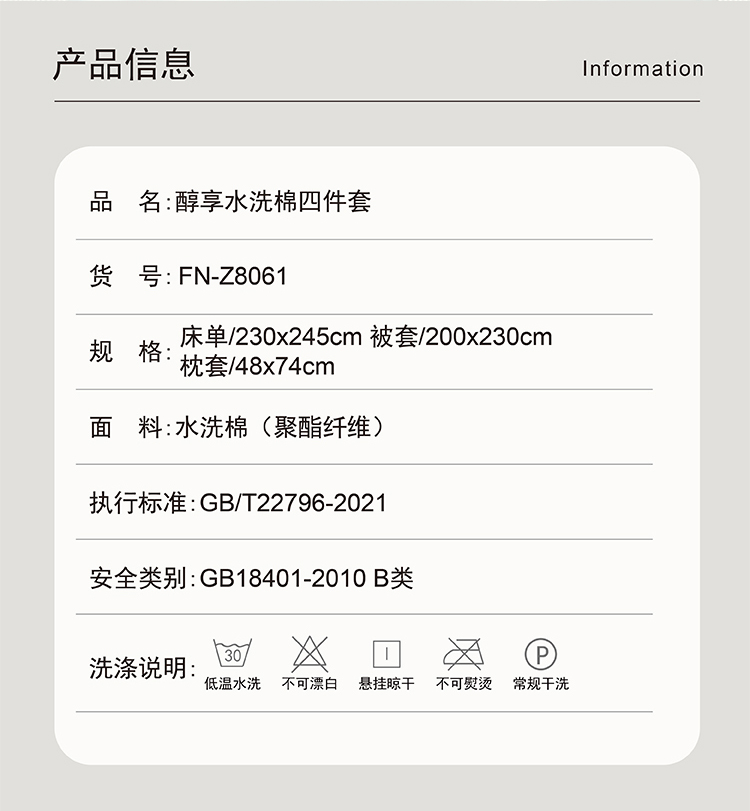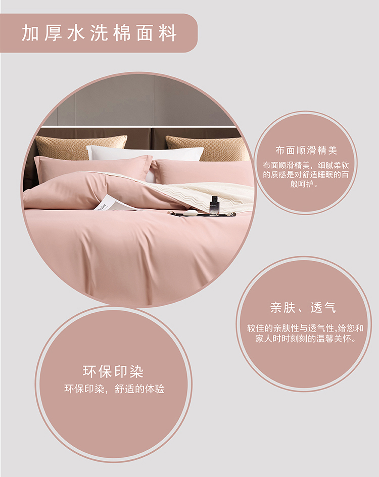 床单:230x245cm 被套:200x230cm 枕套:48x74cm 【面 料】水洗棉(聚酯纤维) 产品特点: 1.加厚水洗棉绒面料,细密紧实,吸湿透气; 2.经典纯色设计,适合不同家居风格,活性印染,色泽明亮; 3.锁边内缝式被套,圆角贴边床单,工艺精致。
