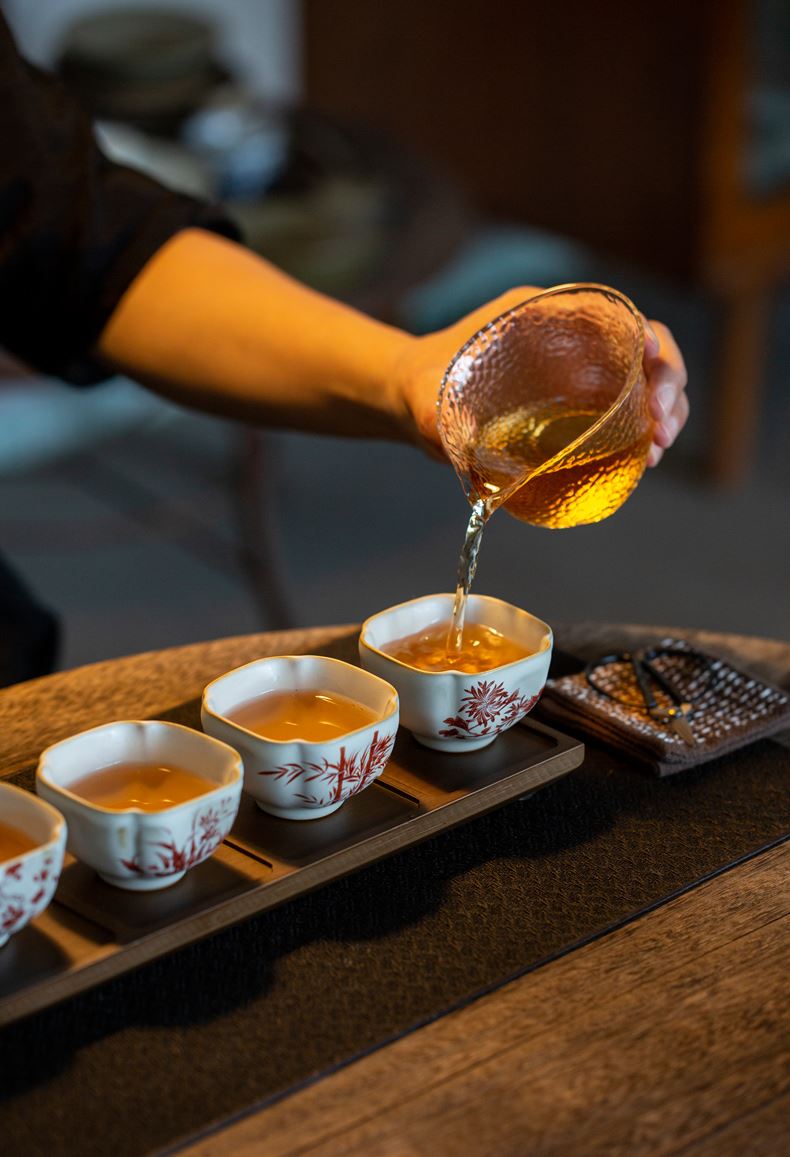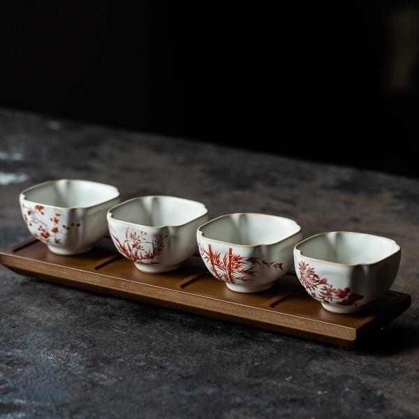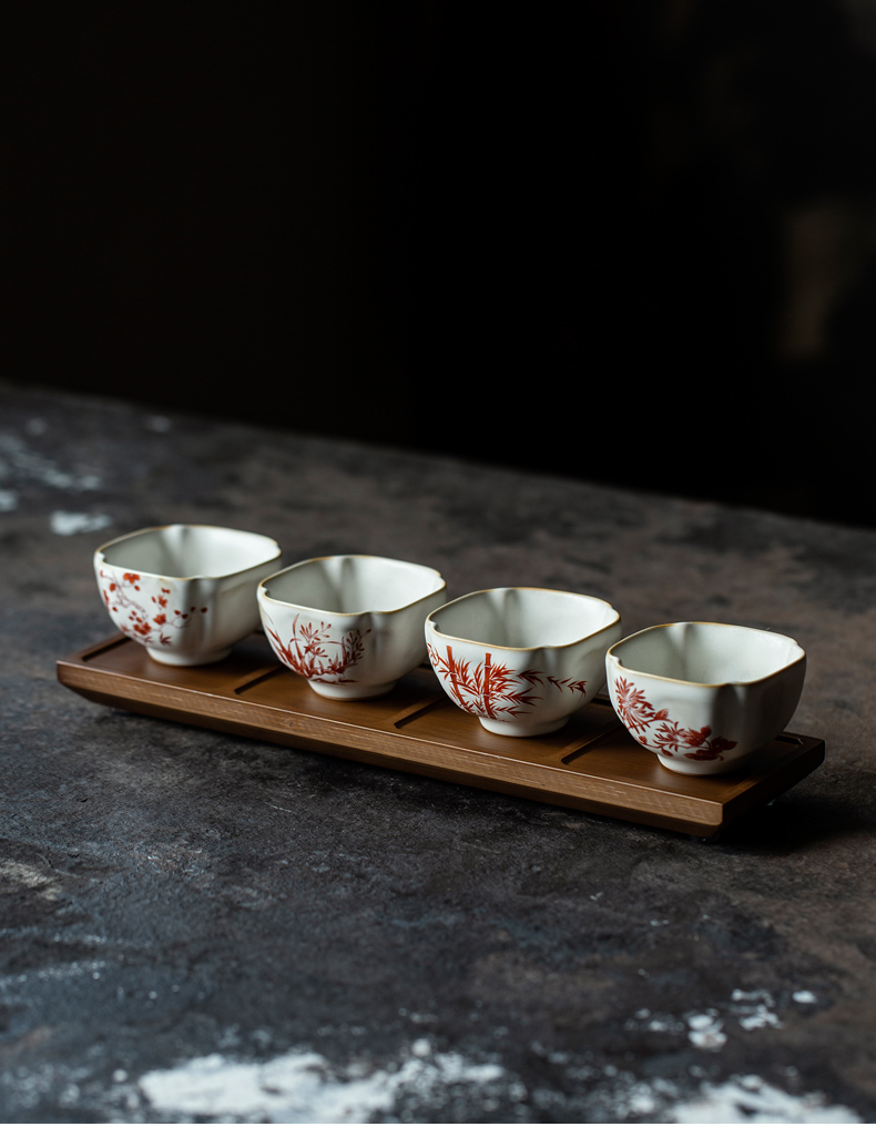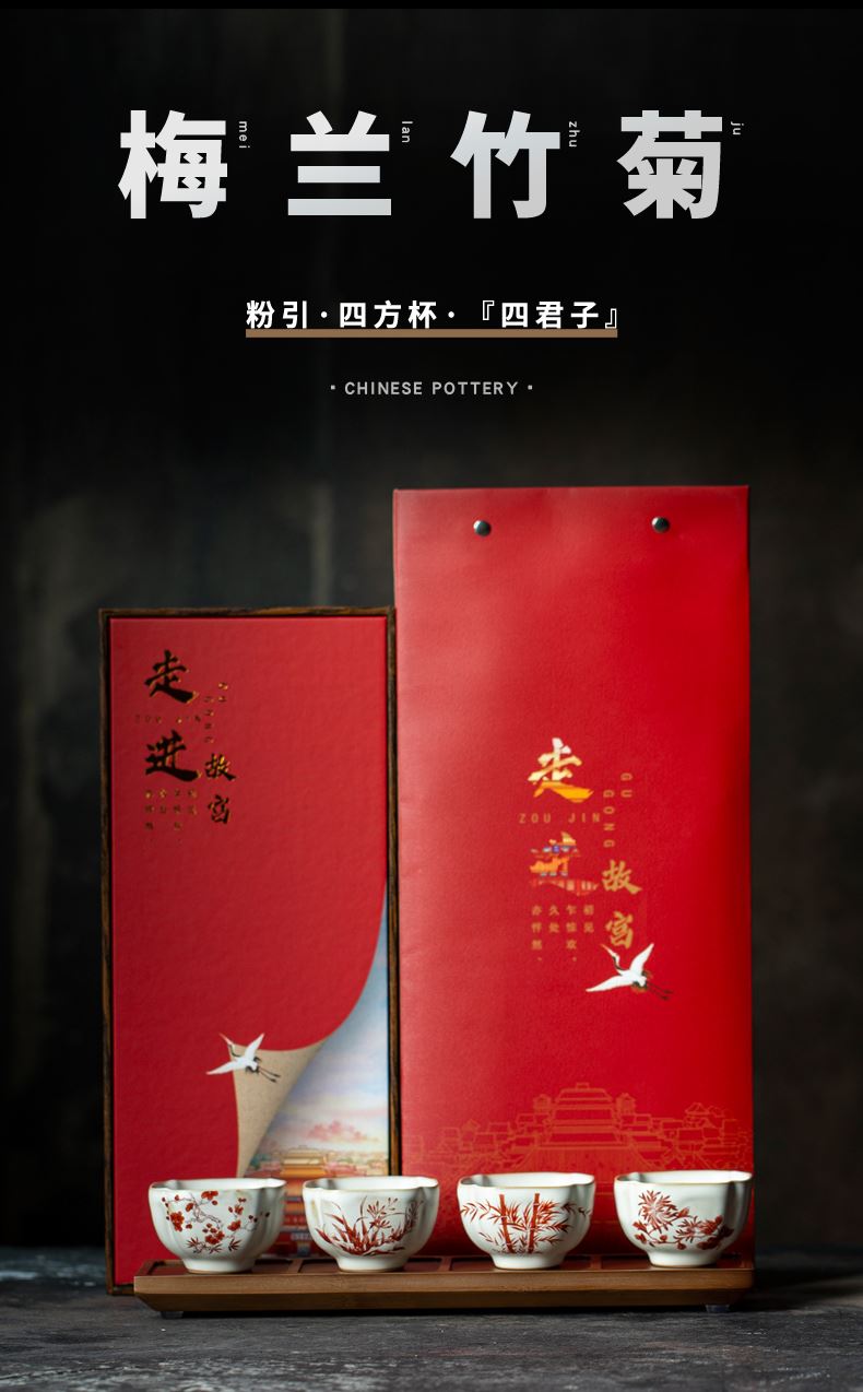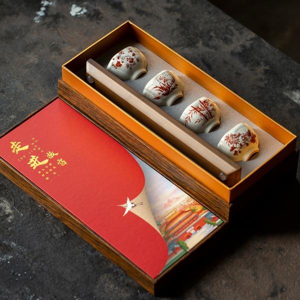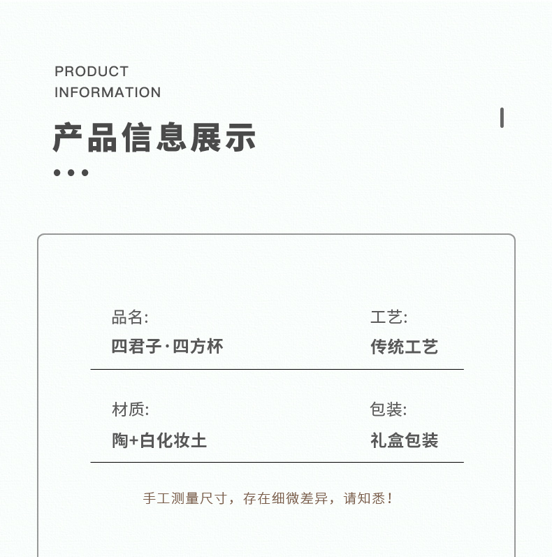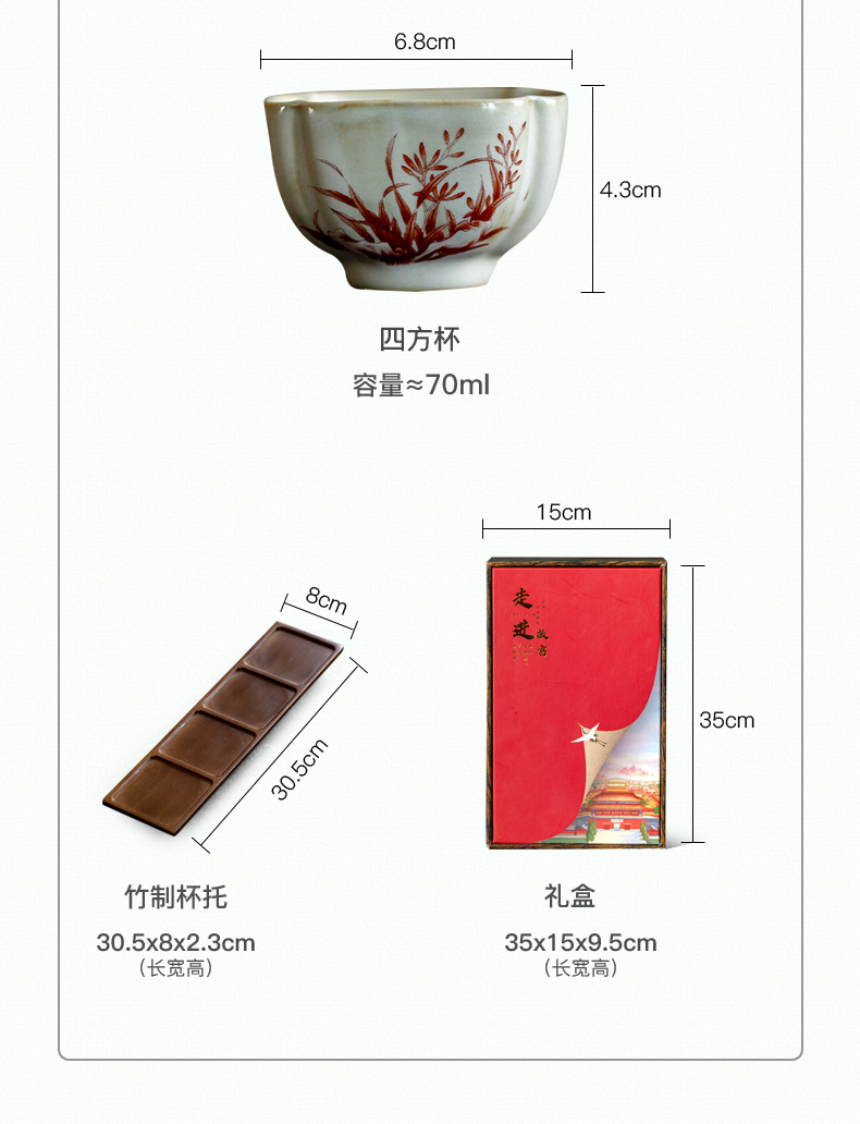 配置:茶杯*4, 尺寸:6.8*4.3cm, 容量:70ml, 竹制托盘:30.5*8*1.5cm 礼盒:15*35*9.5cm