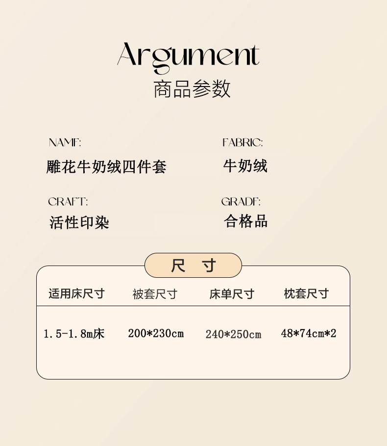 被套:200*230cm 床单:240*250cm 枕套:48*74cm*2 面料:牛奶绒 产品包装:精美软包 包装尺寸:50*40*20cm 特点:牛奶绒面料,充分吸收汗气蒸发产生的热量,舒适透气,精美大方,绒感细腻,呵护您娇嫩肌肤新型植绒技术,绒毛结构丰盈紧实,不易掉毛告别掉毛烦恼。