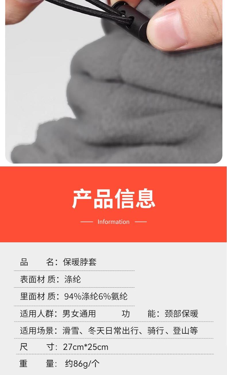 材质 表面-双面超柔 涤纶 250g/㎡ 里面-奥粒绒 94%涤纶6%氨纶 250g/㎡ 颜色 深灰色 尺寸 27cm* 25cm 重量 约86g/个 表面超柔面料,里面奥粒绒面料 亲肤柔软,保暖性强 一品多用,可以用做面罩使用,也可以用作围脖使用 可调节抽拉绳设计,防止滑落