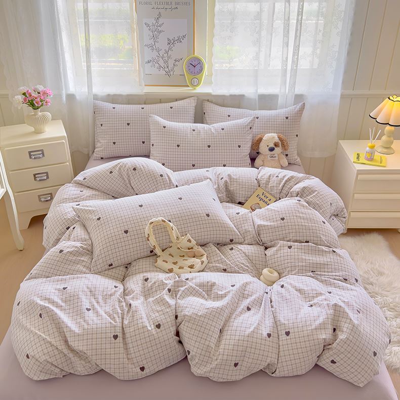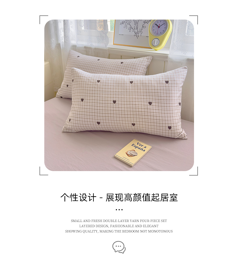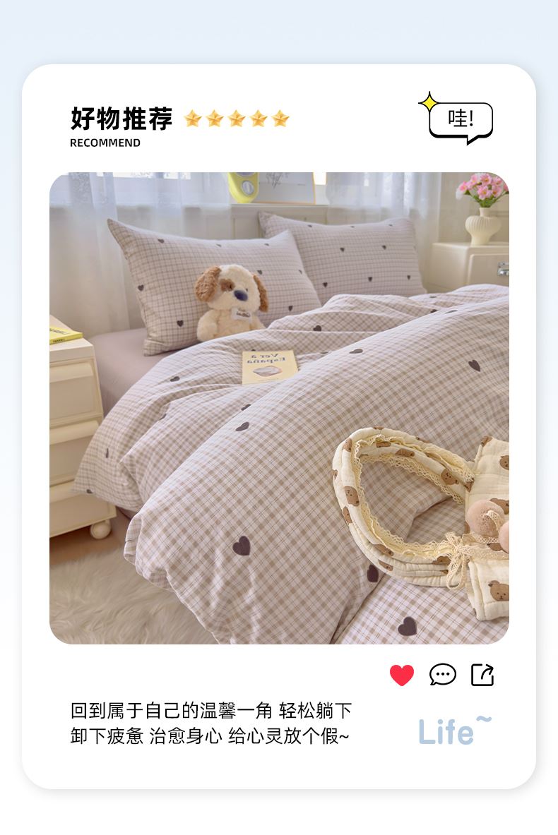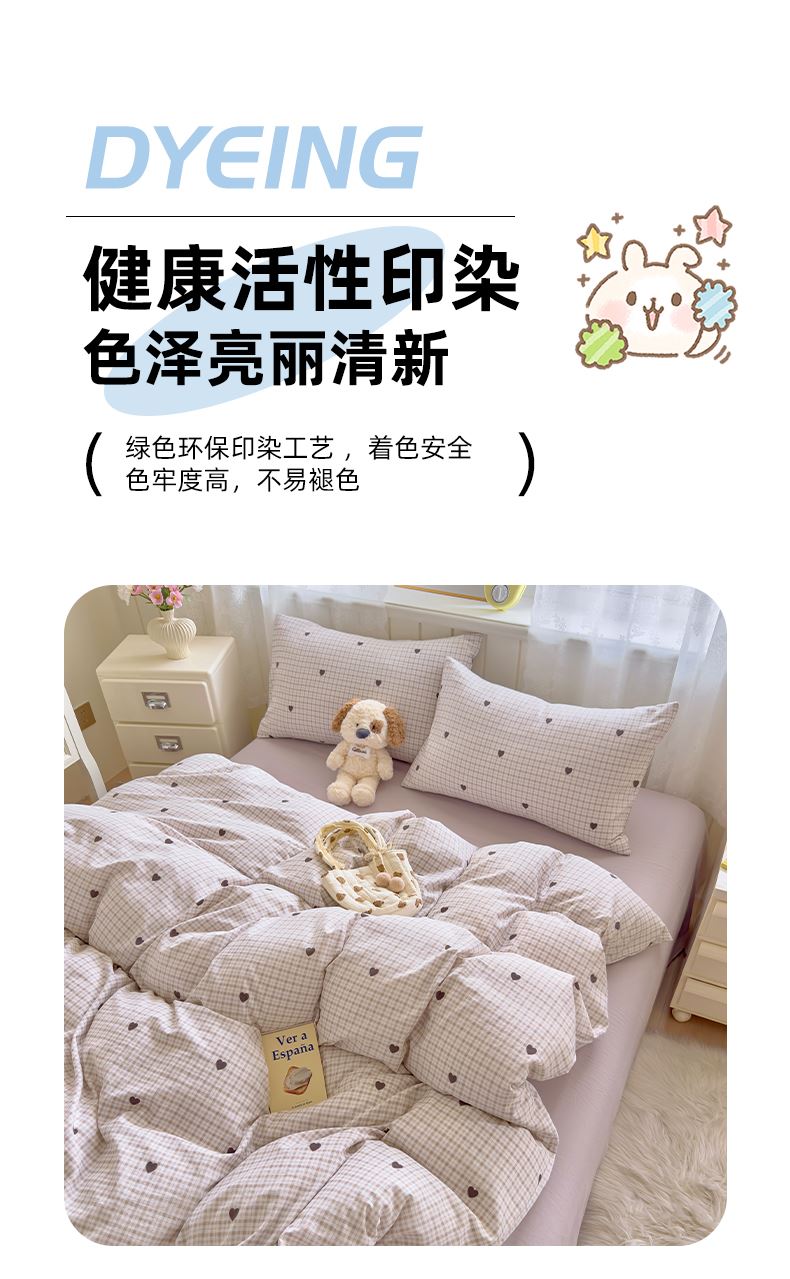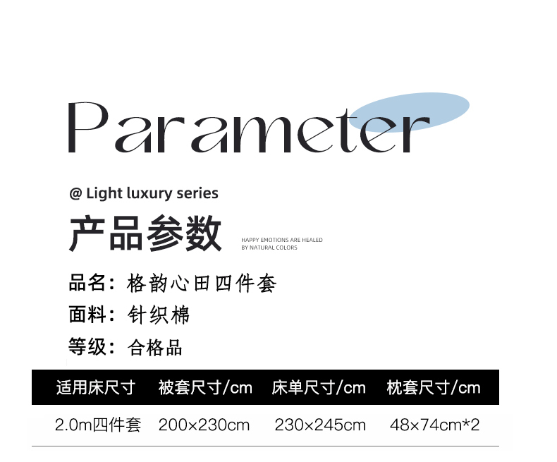 被套:200*230cm 床单:230*245cm 枕套:48*74cm*2 面料:针织棉 产品包装:精美礼盒 包装尺寸:42*33*11cm 1.面料柔软舒适、手感舒适,与肌肤接触时能带来被呵护的感觉。 2.透气性佳、吸湿性强,能够快速吸收身体排出的汗水。产品轻盈,使用时感觉轻松无负担。