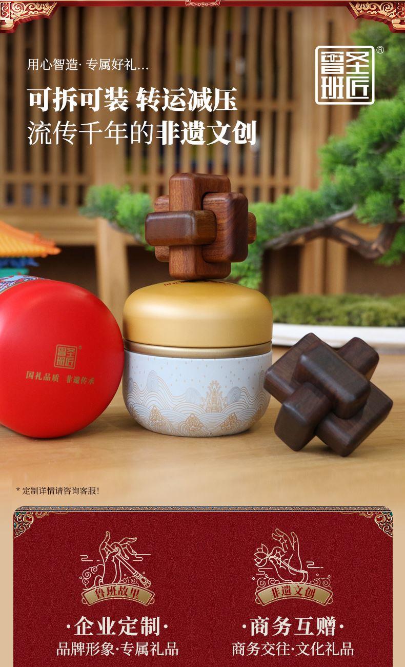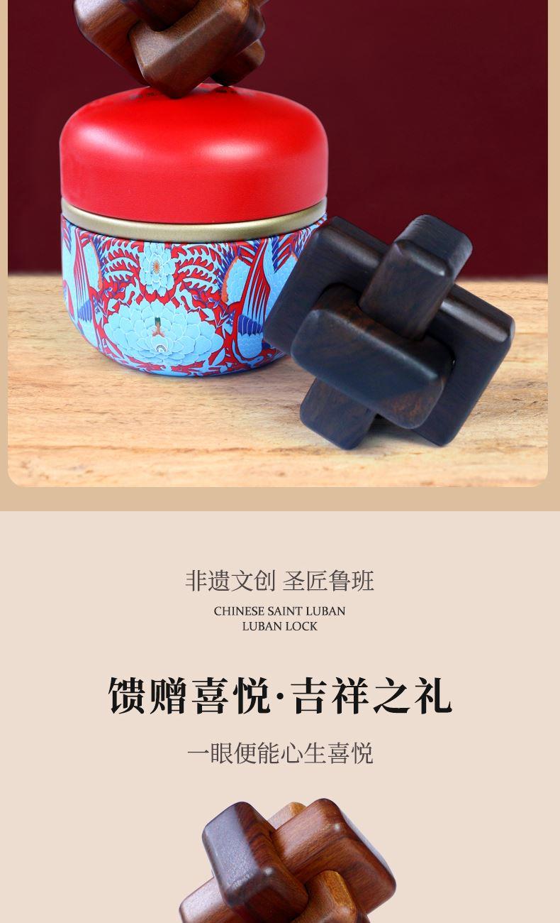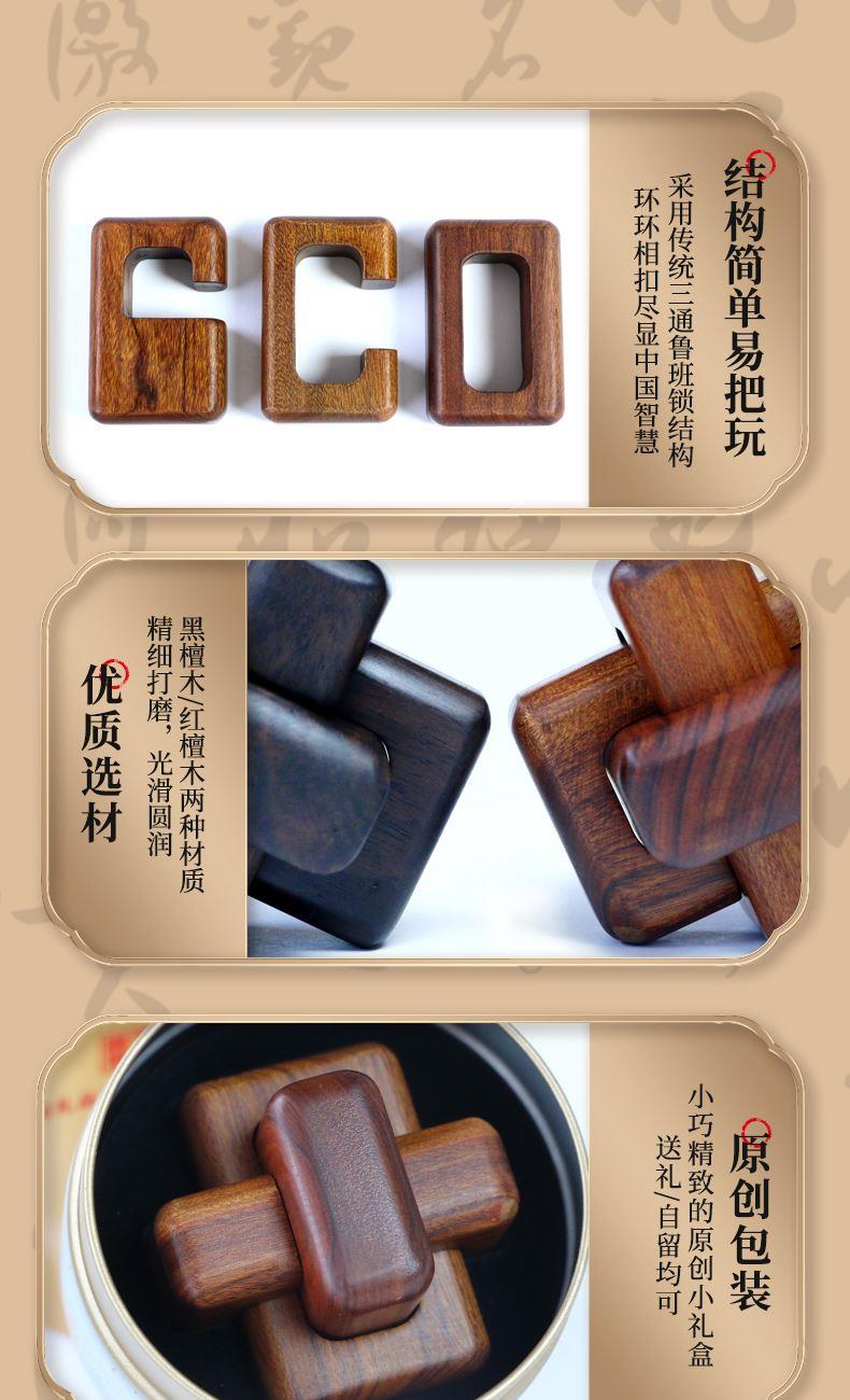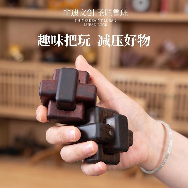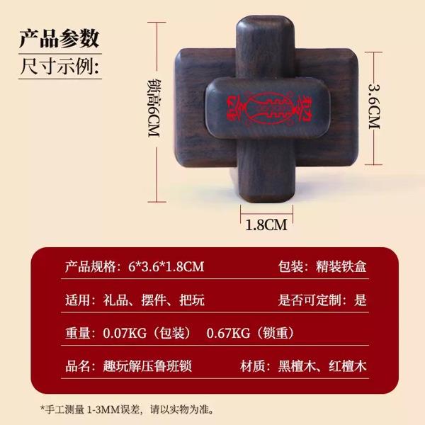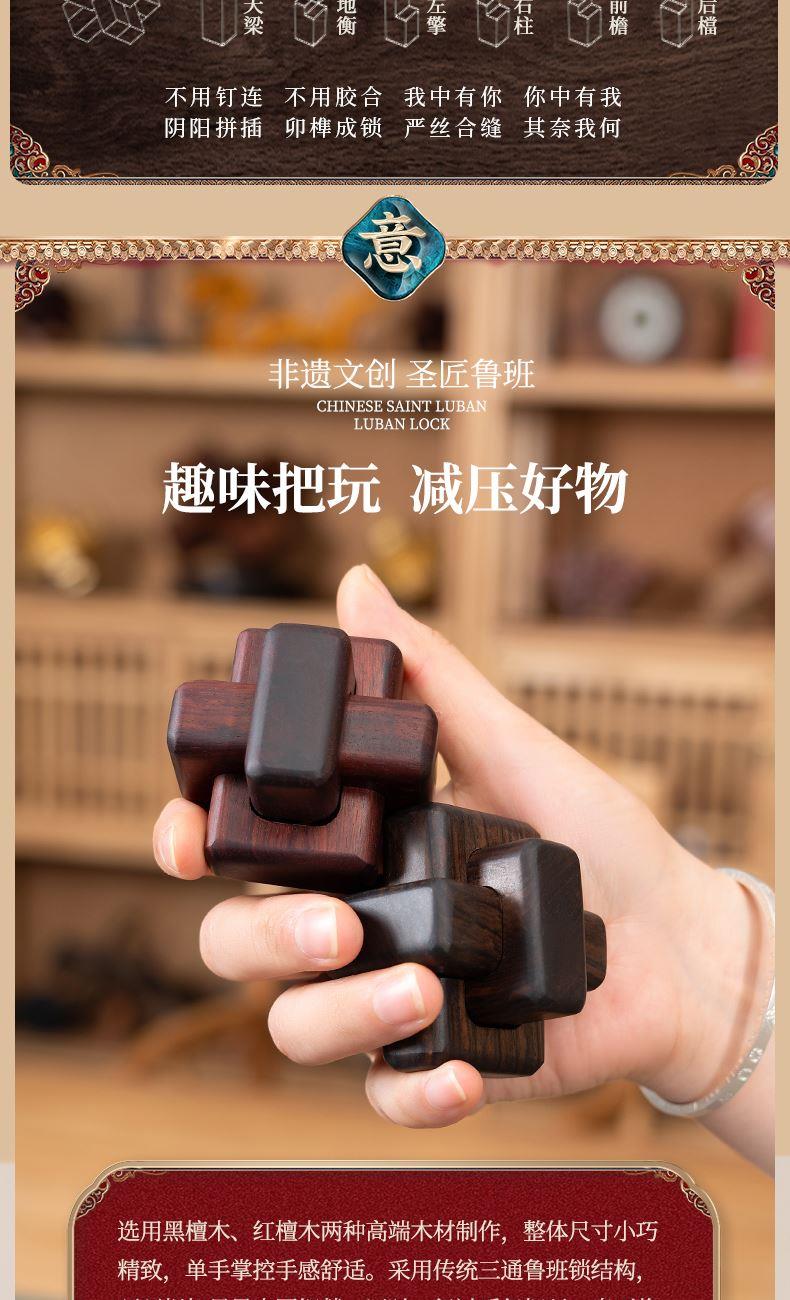 材质:黑檀 产品规格:60×60×60mm 包装规格:Φ85×87mm 来至鲁班故里,非遗文创产品 此款趣玩解压鲁班锁,甄选珍贵木料,精心打造,小巧精致。它沿袭了传统三通鲁班锁的结构,环环相扣,巧妙绝伦,充分展现了中国智慧的博大精深。手指轻拨,回弹丝滑,不仅锻炼了手指的灵活性,更在无形中舒缓了情绪。此锁不仅寓意着团结与紧密,更象征着智慧与和谐的结合。即可赠予亲朋,还适合自用把玩,