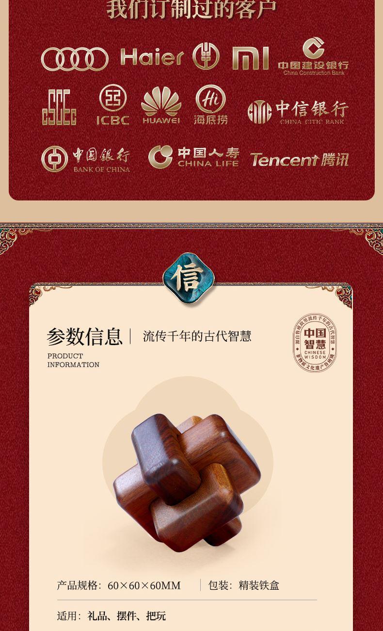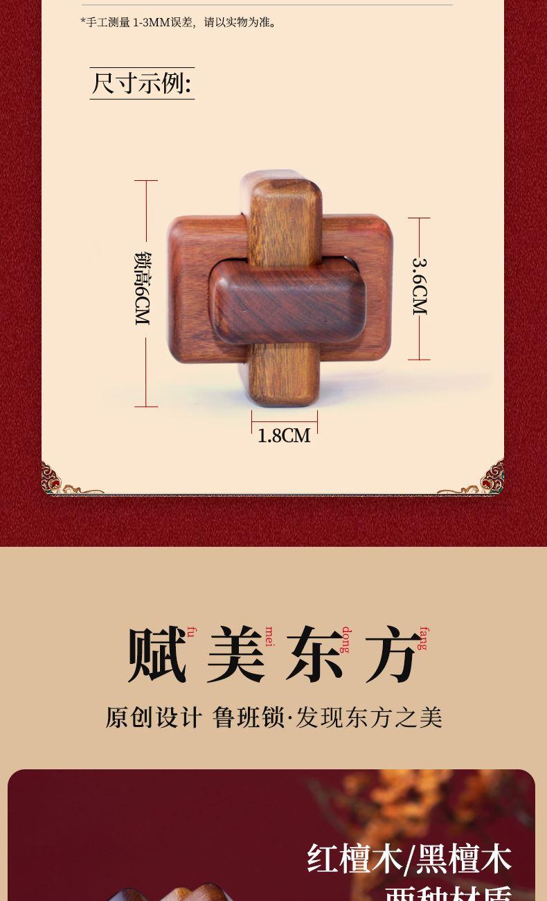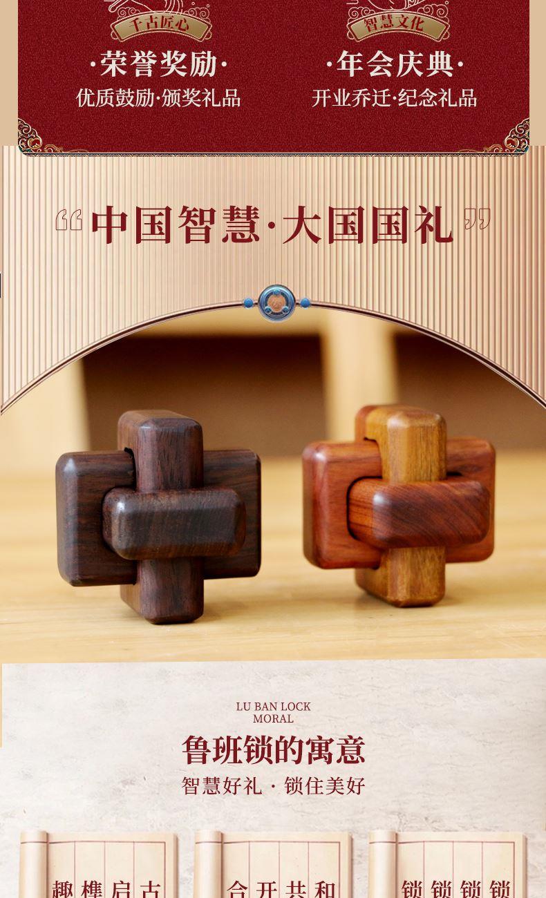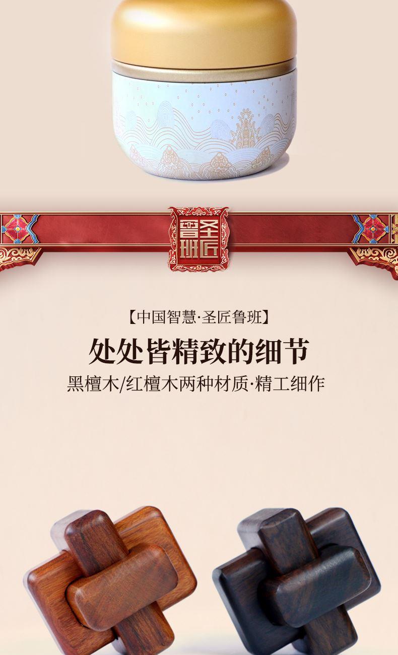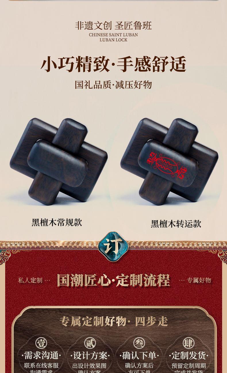 材质:黑檀 产品规格:60×60×60mm 包装规格:Φ85×87mm 来至鲁班故里,非遗文创产品 此款趣玩解压鲁班锁,甄选珍贵木料,精心打造,小巧精致。它沿袭了传统三通鲁班锁的结构,环环相扣,巧妙绝伦,充分展现了中国智慧的博大精深。手指轻拨,回弹丝滑,不仅锻炼了手指的灵活性,更在无形中舒缓了情绪。此锁不仅寓意着团结与紧密,更象征着智慧与和谐的结合。即可赠予亲朋,还适合自用把玩,