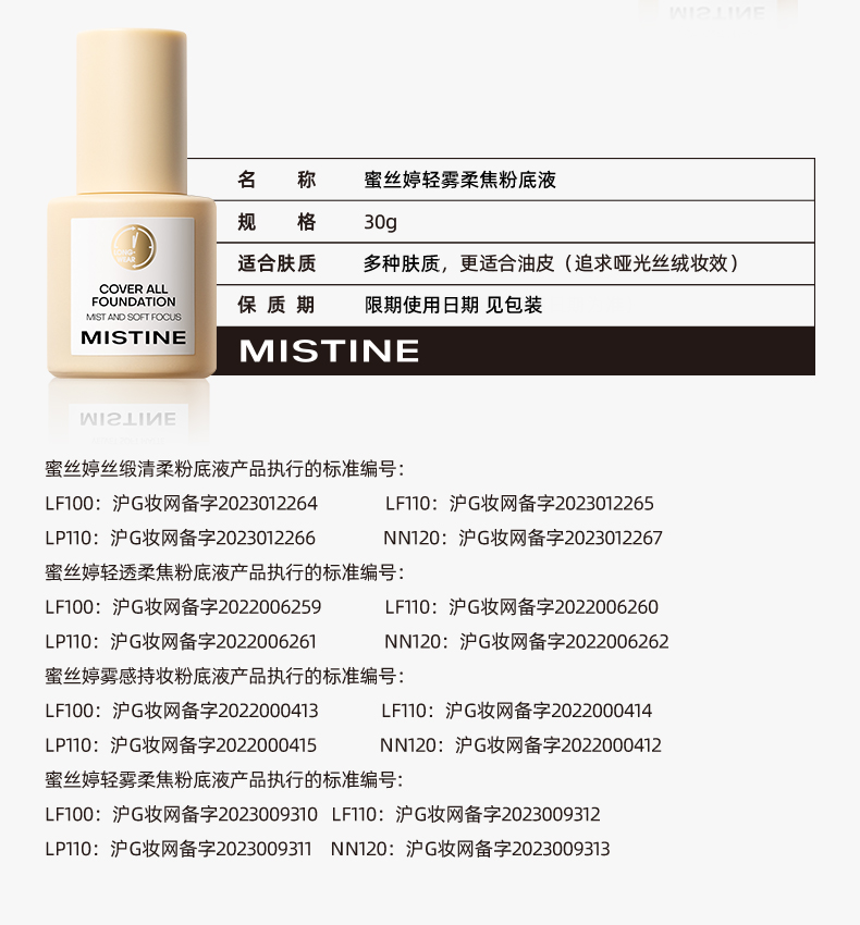 蜜丝婷轻雾柔焦金盾粉底液适合油皮LF110白皙中调色