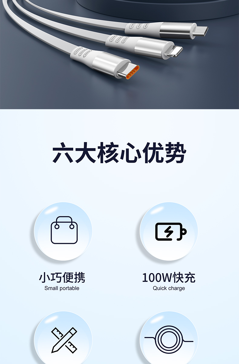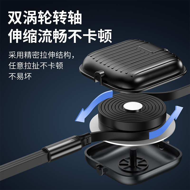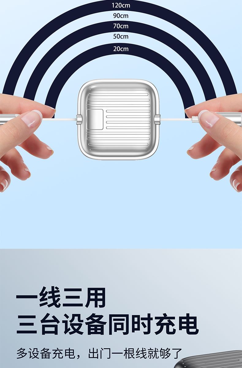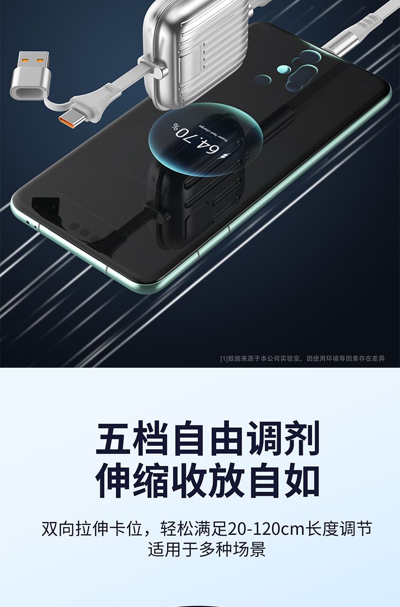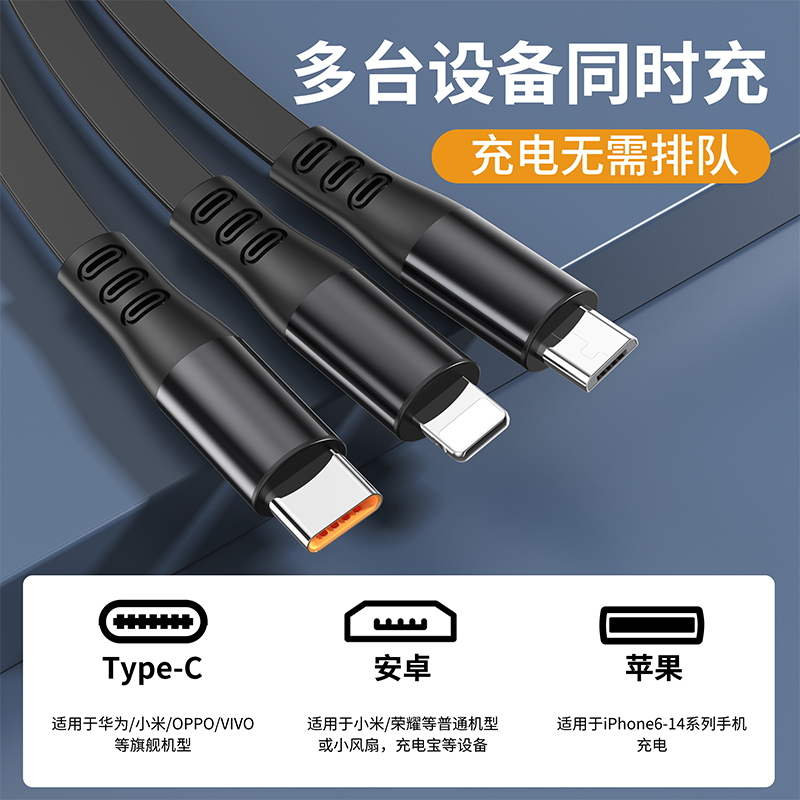 二拖三伸缩设计,兼容苹果15系列 66W超级快充,充电更快 三种接口满足各种手机 1.2米长度设计,使用方便 五档伸缩调节