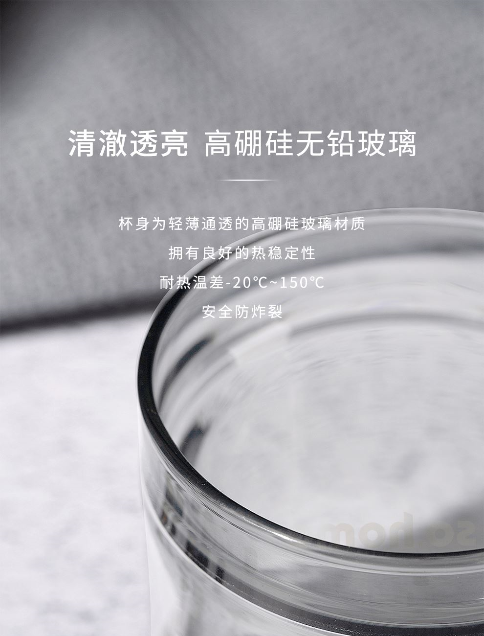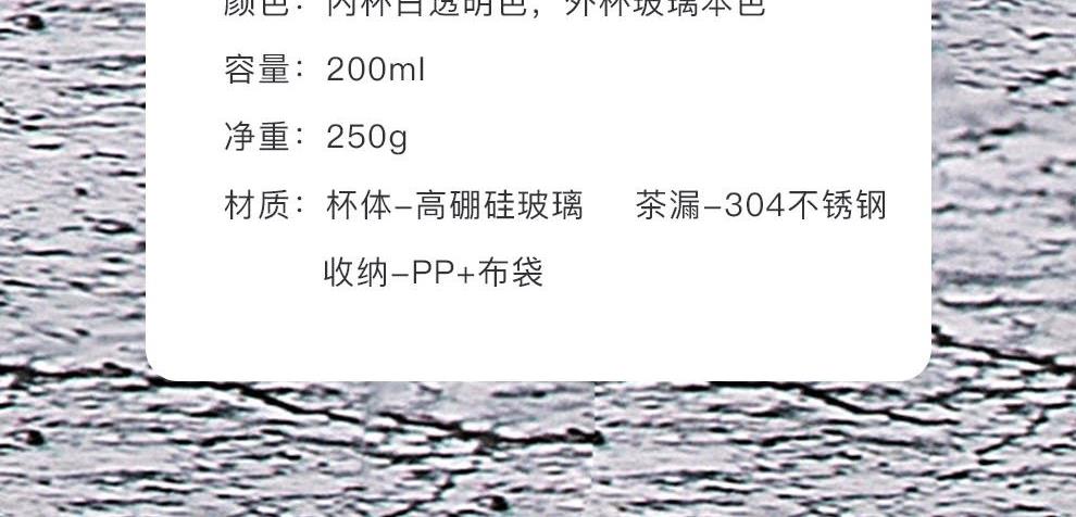 产品容量:220ML 产品材质:杯体-高硼硅玻璃、茶漏-304不锈钢 收纳-PP,帆布袋 1.夹层空气可阻碍热传递,长时间保温保冷; 2.滤网与滤孔里外双重结合,过滤更干净; 3.瞬时温差170度,无铅更健康。