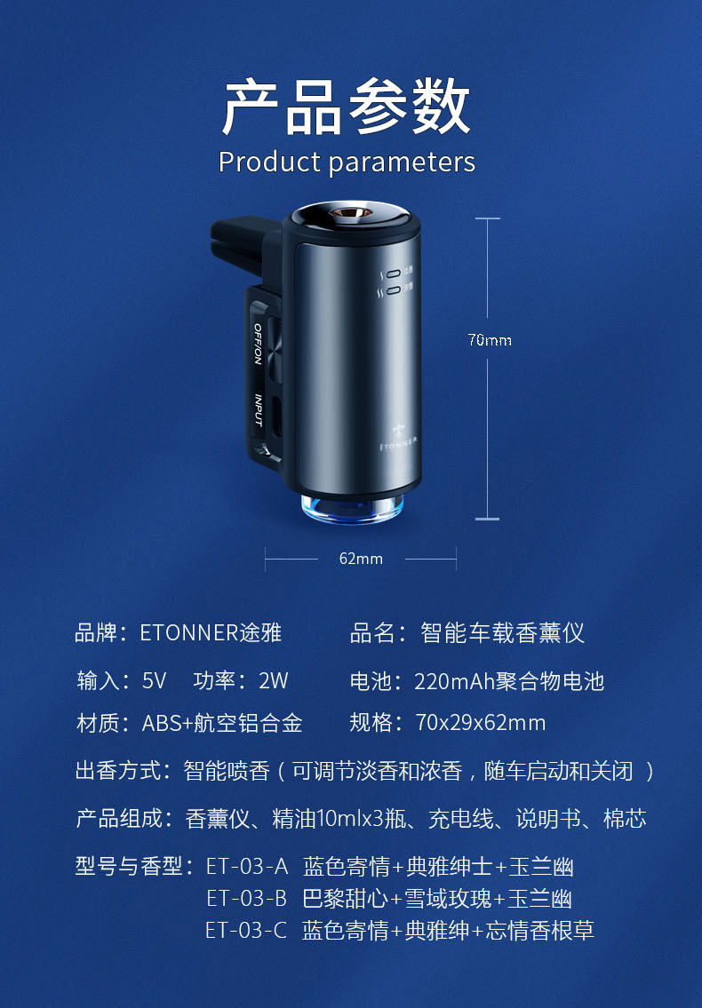 三款可选: A款经典共享:蓝色寄情+玉兰幽+典雅绅士; B款女士专享:巴黎甜心+玉兰幽+雪域玫瑰; C款男士经典:蓝色寄情+忘情香根草+典雅绅士 注:其中B款女士系列的是金色瓶盖 只能使用特定的香薰油,与其他的不通用(机器激光打标+3元)