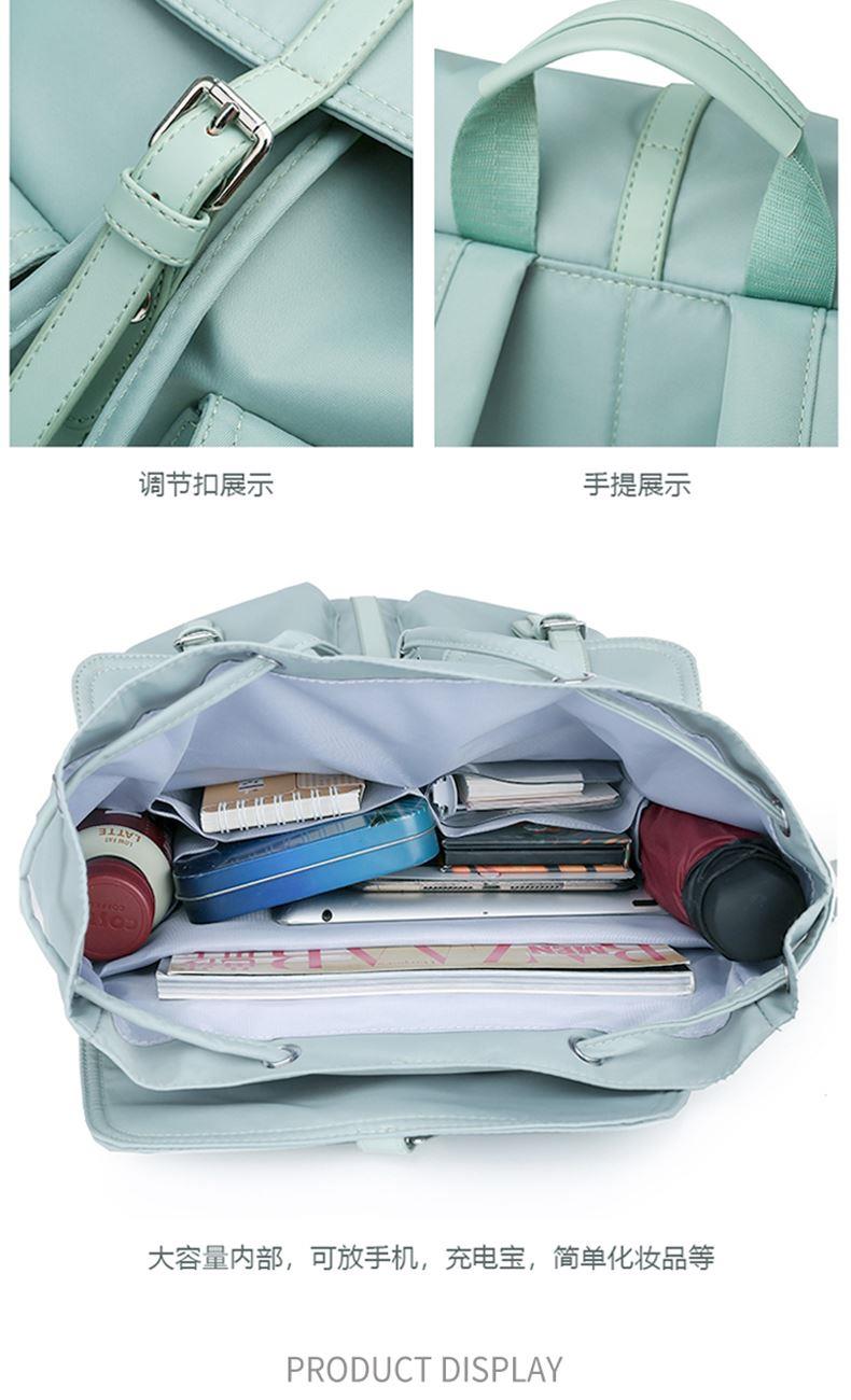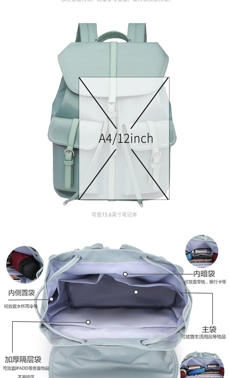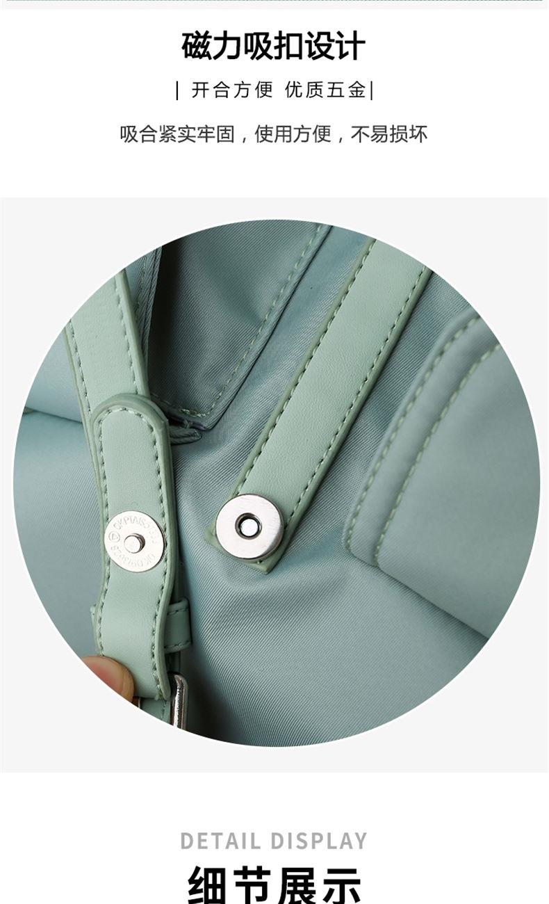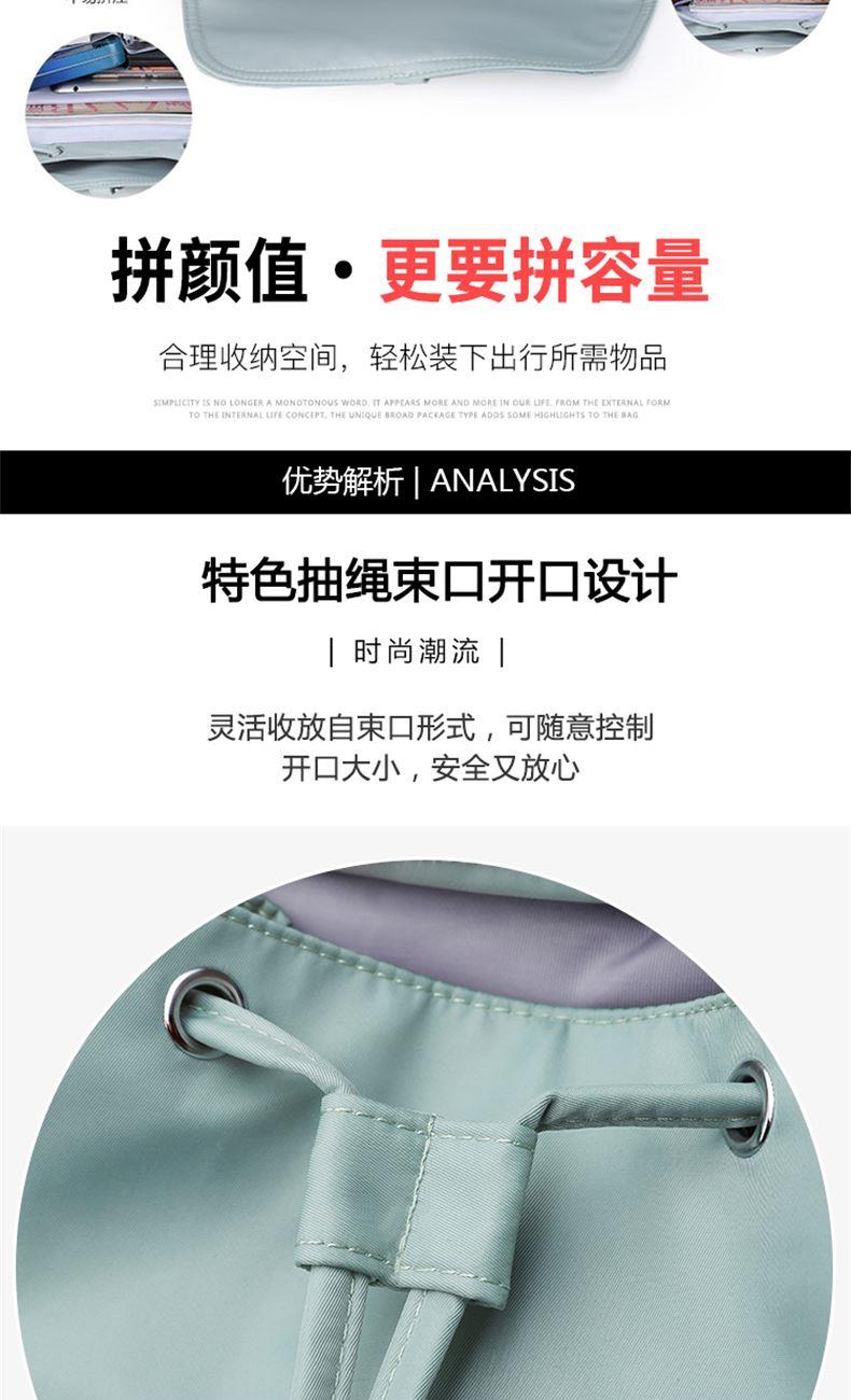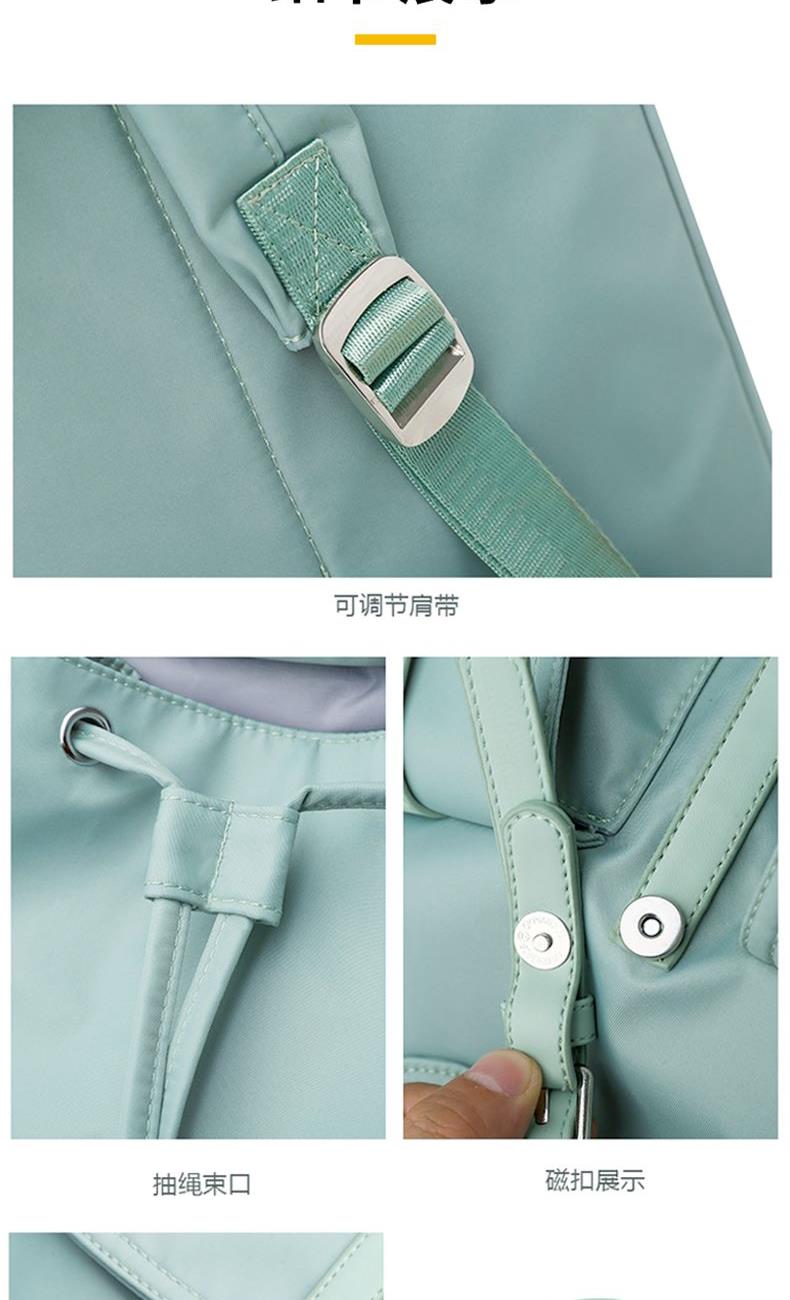 灵活收放,可随意控制开口大小,安全又放心; 超轻透气,色泽自然柔和手感舒适,易打理; 吸合紧实 ,使用方便,不易损坏; 型号: FF-Y005A 面料材质:290斜纹记忆复合尼龙+PU 里布材质:210D涤纶 尺寸: 37*29*14CM 颜色:薄荷绿 结构:主袋,内暗袋,内置侧袋,加厚隔层袋