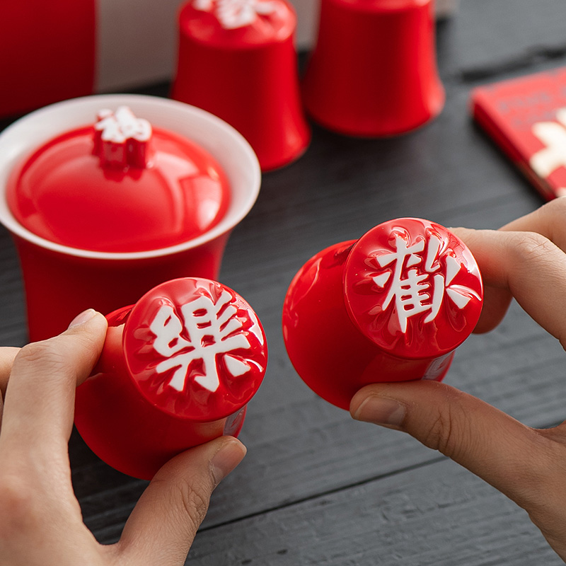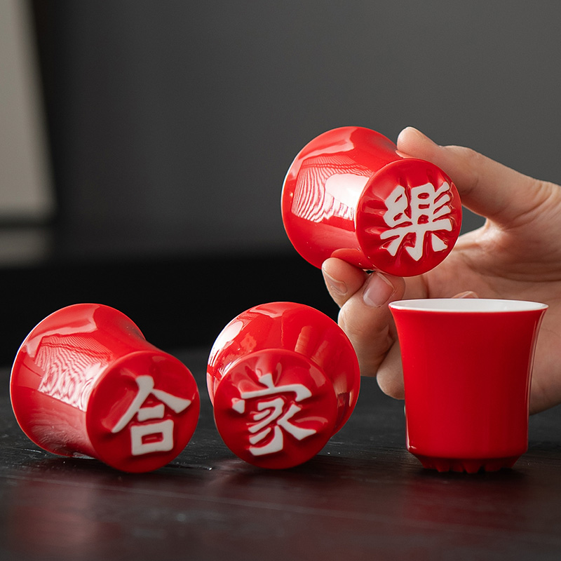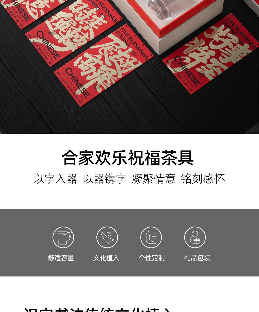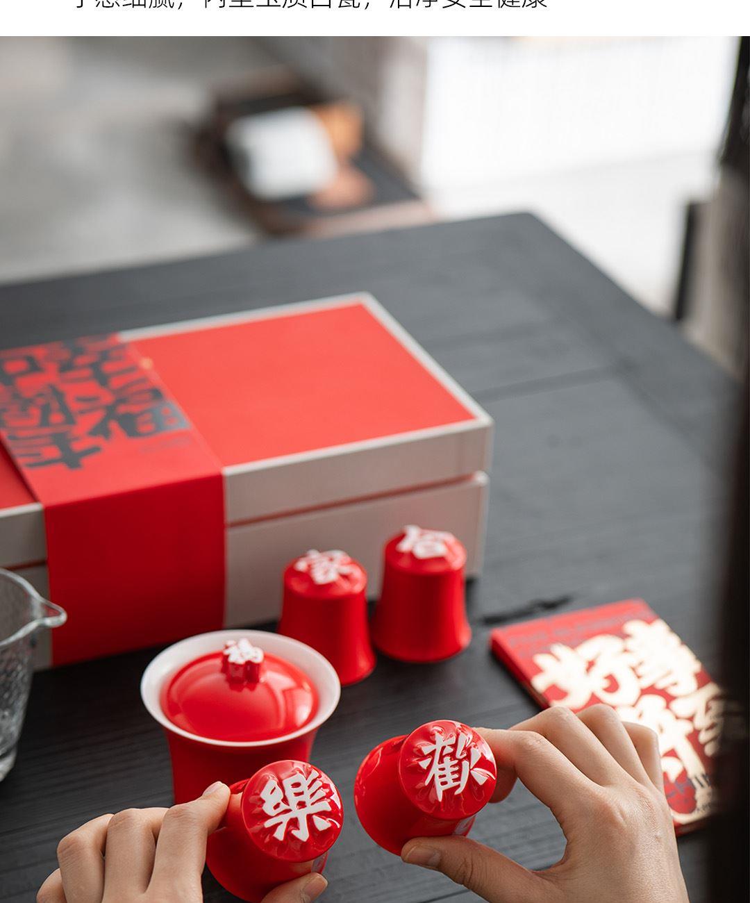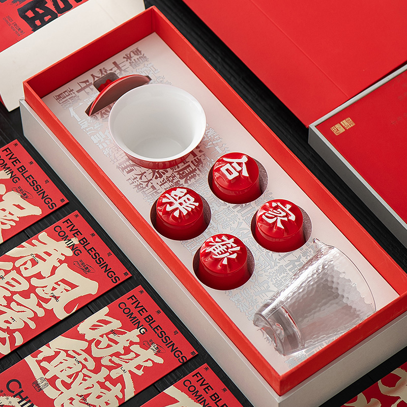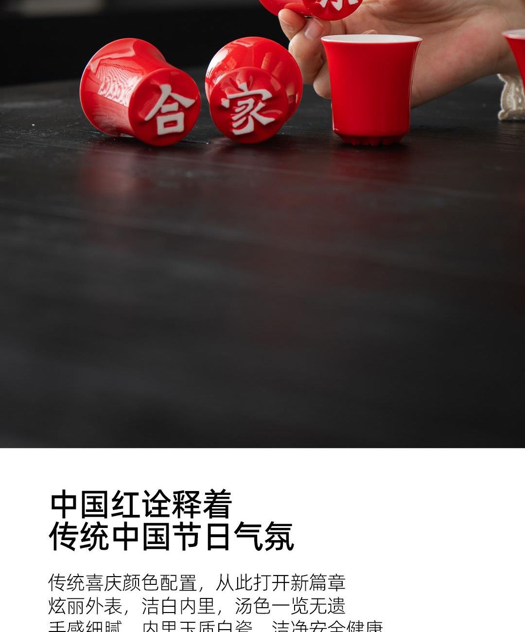 配置:汉字杯*4(合家欢乐) 御福盖碗*1 锤纹玻璃公道*1 (赠送红包袋) 材质:白玉瓷胎 颜色:中国红 尺寸:包装400*160*95mm 容量:壶150ml公道150ml杯50ml 1:汉字杯历经1300度以上高温烧制,不含铅和镉等重金属。 2:杯型源自竹节,一字一模,手工塑形。 3:传统中国红,结合汉字书法魏碑字体,相得益彰