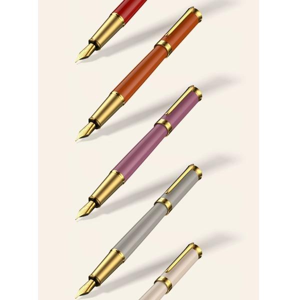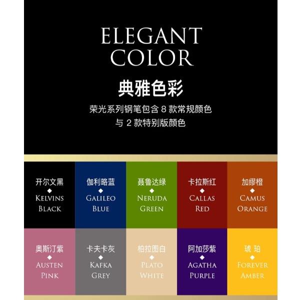 型号:荣光系列墨水笔 类型:螺纹上上墨式墨水笔 重量:墨水/宝珠笔43g/47g 颜色分类:开尔文黑/卡拉斯红/奥斯汀紫/加缪橙/伽利略蓝/卡夫卡灰/柏拉图白 书写粗细:F尖 套餐类型:官方标配 包装方式:鸿运笔记本礼盒装 适用场景:送礼书写 钢笔笔尖成分:铱金笔 笔尖种类;标准型 适用人群:商务办公人士 上墨方式:旋转吸墨 笔杆材质:金属 笔尖嵌入方式:明尖 笔身纹理:格子纹 墨水材质:非碳素墨水