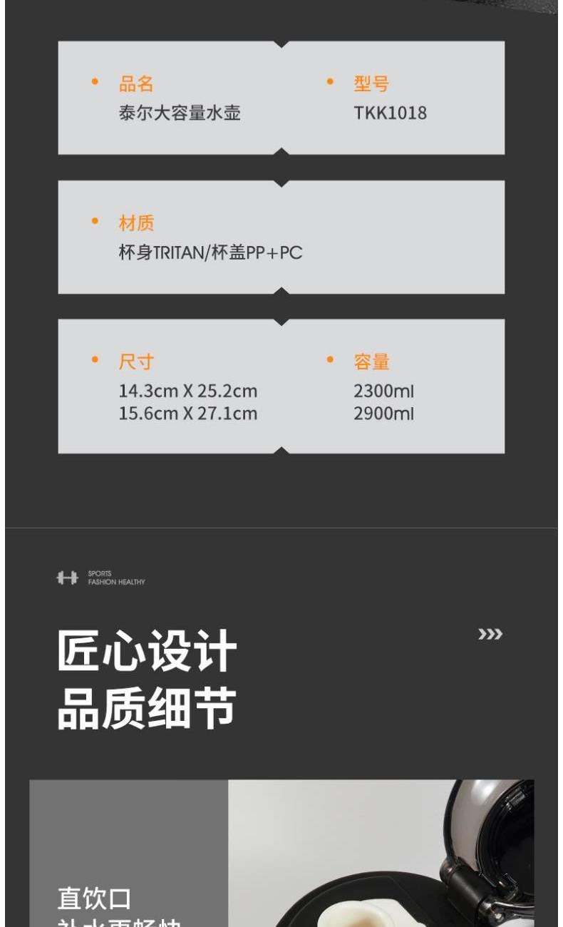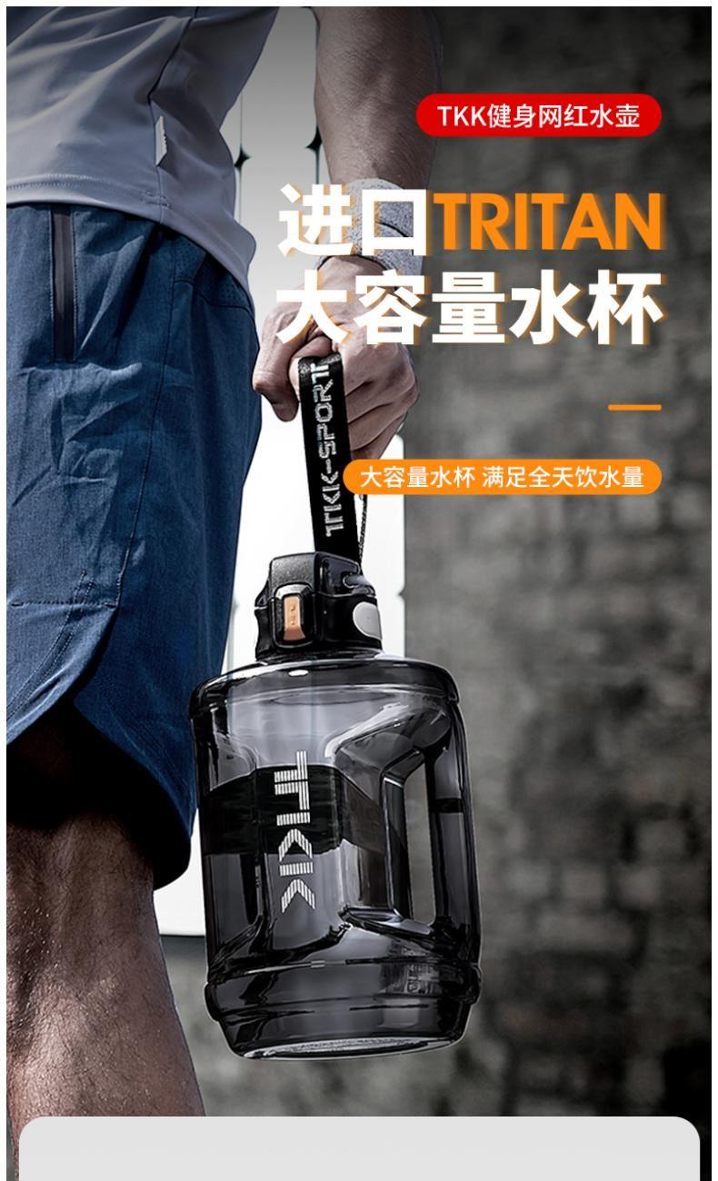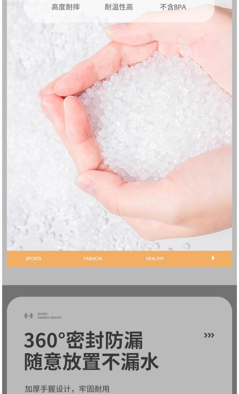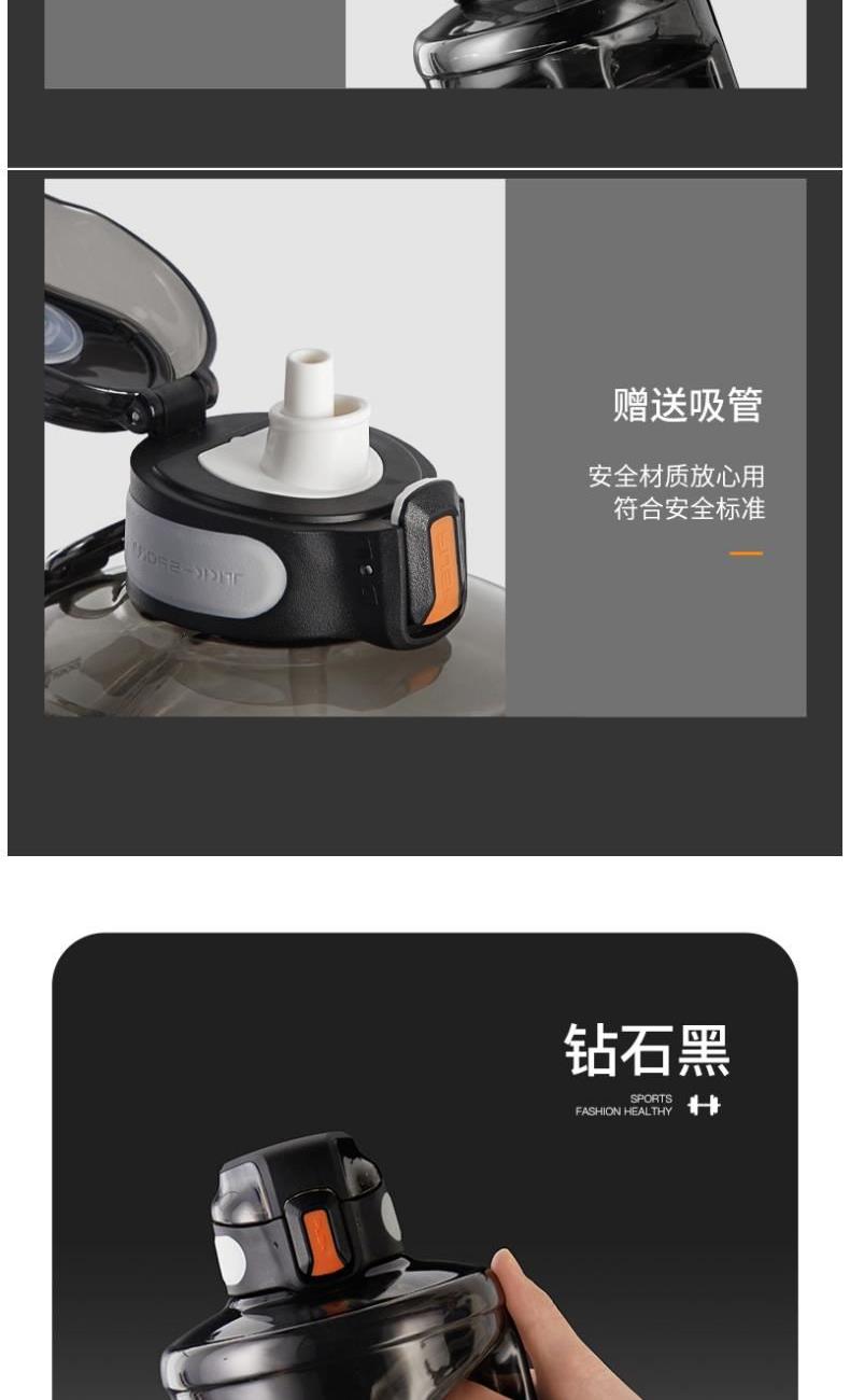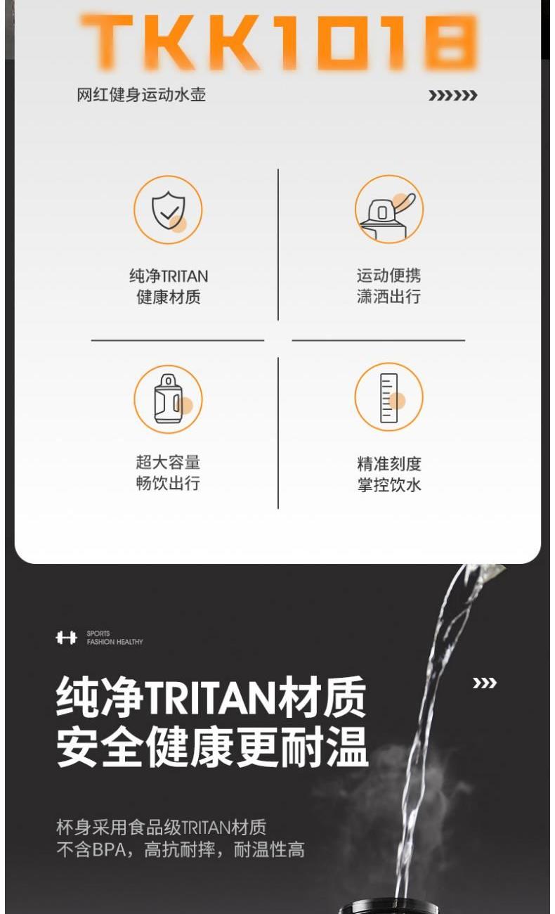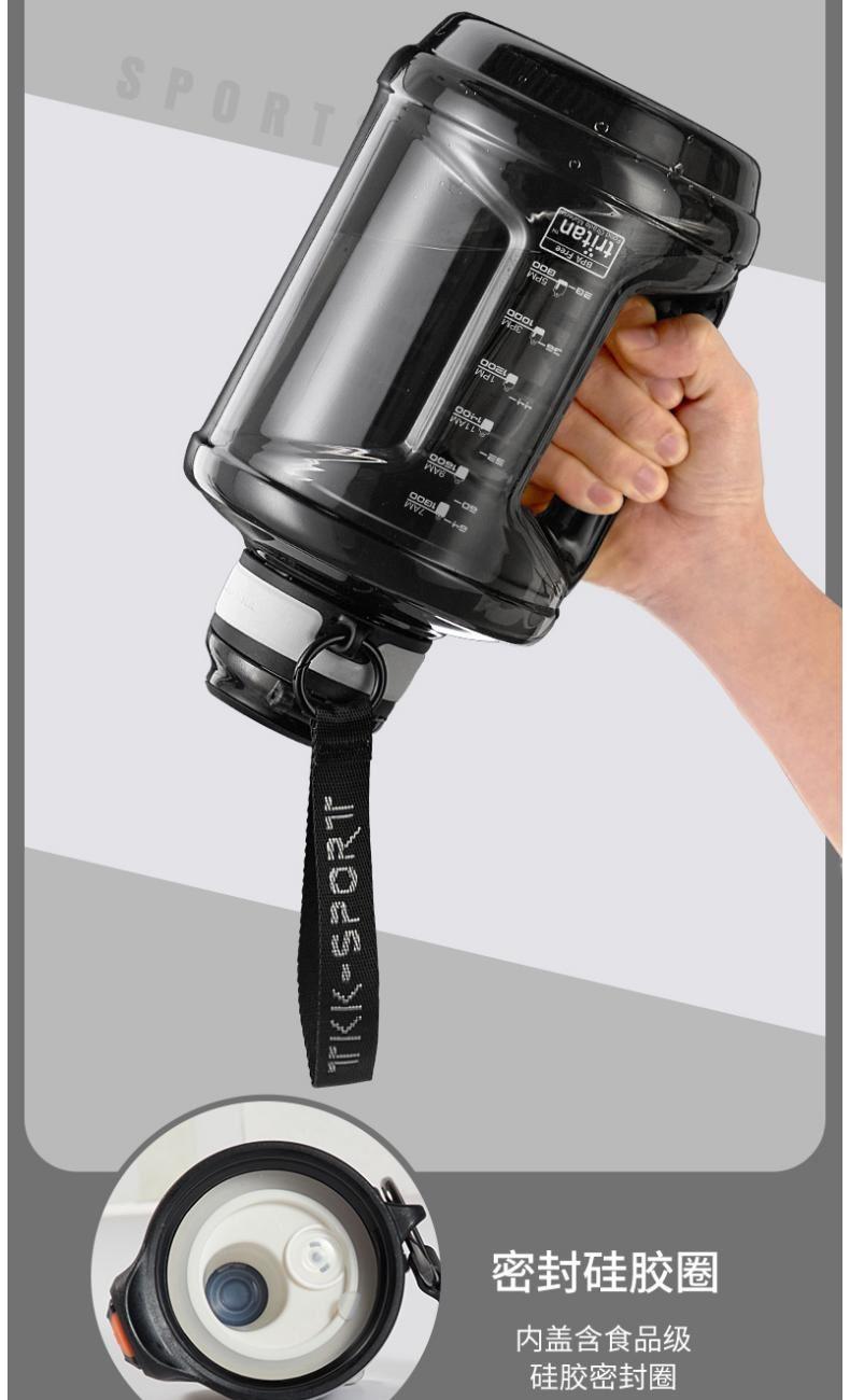 商品容量:1800ml 杯身材质:tritan 商品净重:326g 商品尺寸:143X252mm 1.时尚运动感设计直饮杯 ;同时配送一个直饮吸管嘴,2种方式体验不同的喝水感。 2.杯身采用美国伊士曼Tritan进口材料,不含双酚A(BPA),风靡欧美的婴幼儿用品安全材质, 3.按压式一键弹盖, 轻松开合不费力,畅快补水; 4.宽扁的编织带提绳 手感好,外出轻松携带,随心随性 即拎即走 5.食品级硅胶防漏圈,密封防漏,安全可靠; 6.可拆卸配件,便于日常清洗,不易藏污纳垢; 7.圆润的饮水口设计,舒适口感,不侧漏不呛喉, 8.安全锁扣 锁紧杯盖,防止杯盖不慎弹开漏水/烫伤,安心无忧; 9.硅胶防滑防烫杯杯套,安心使用;