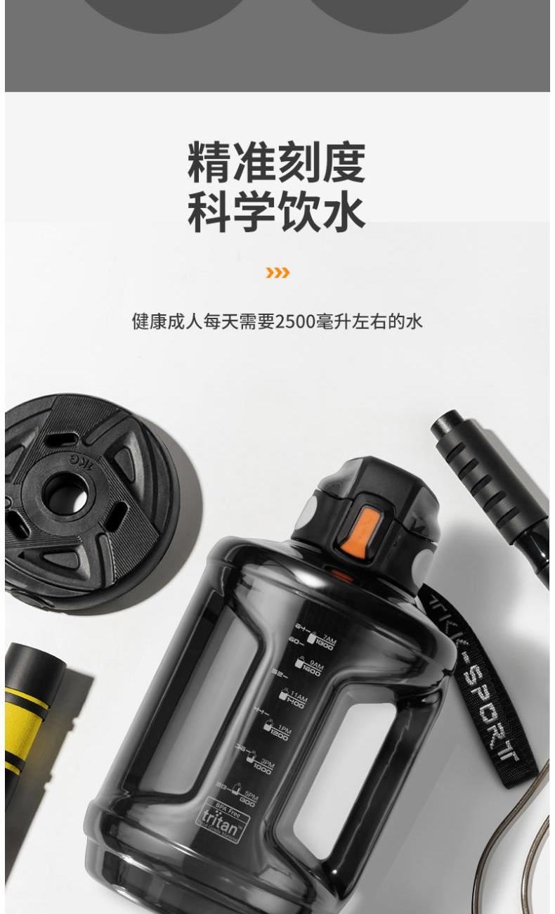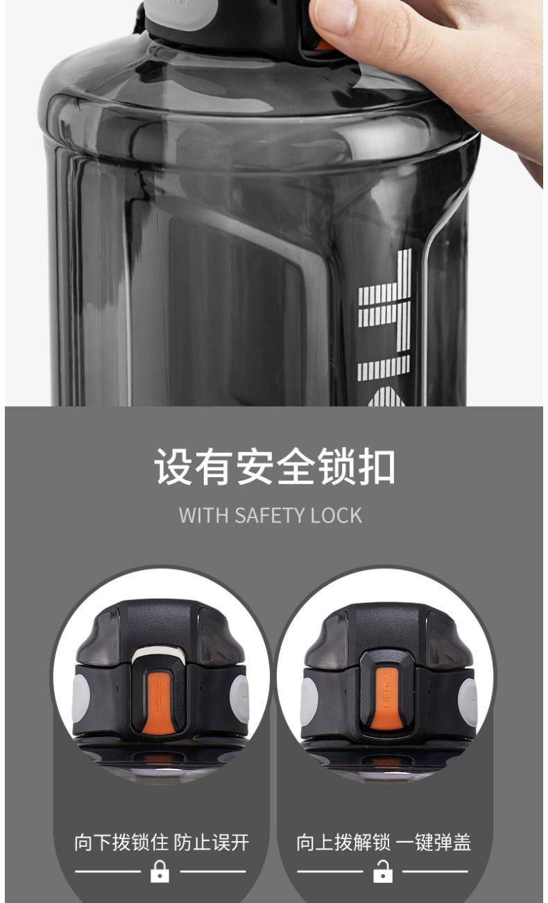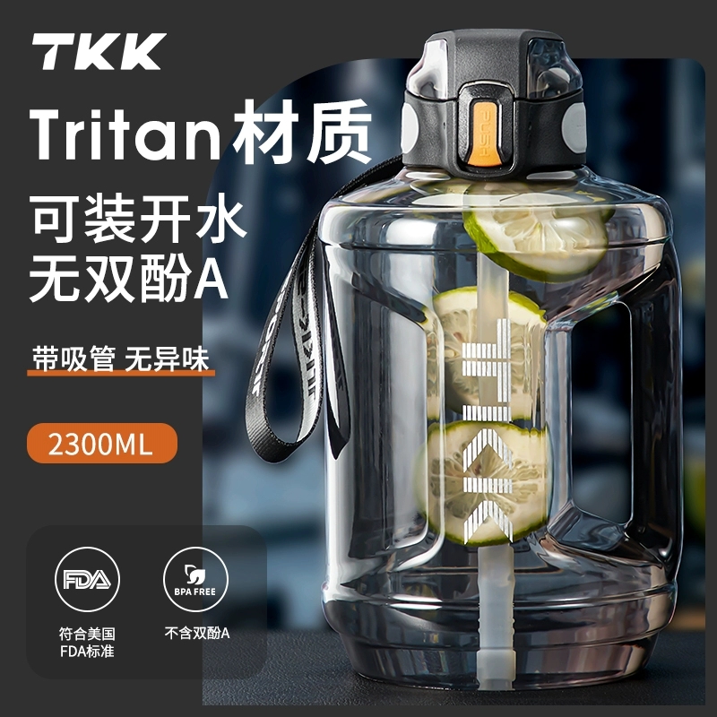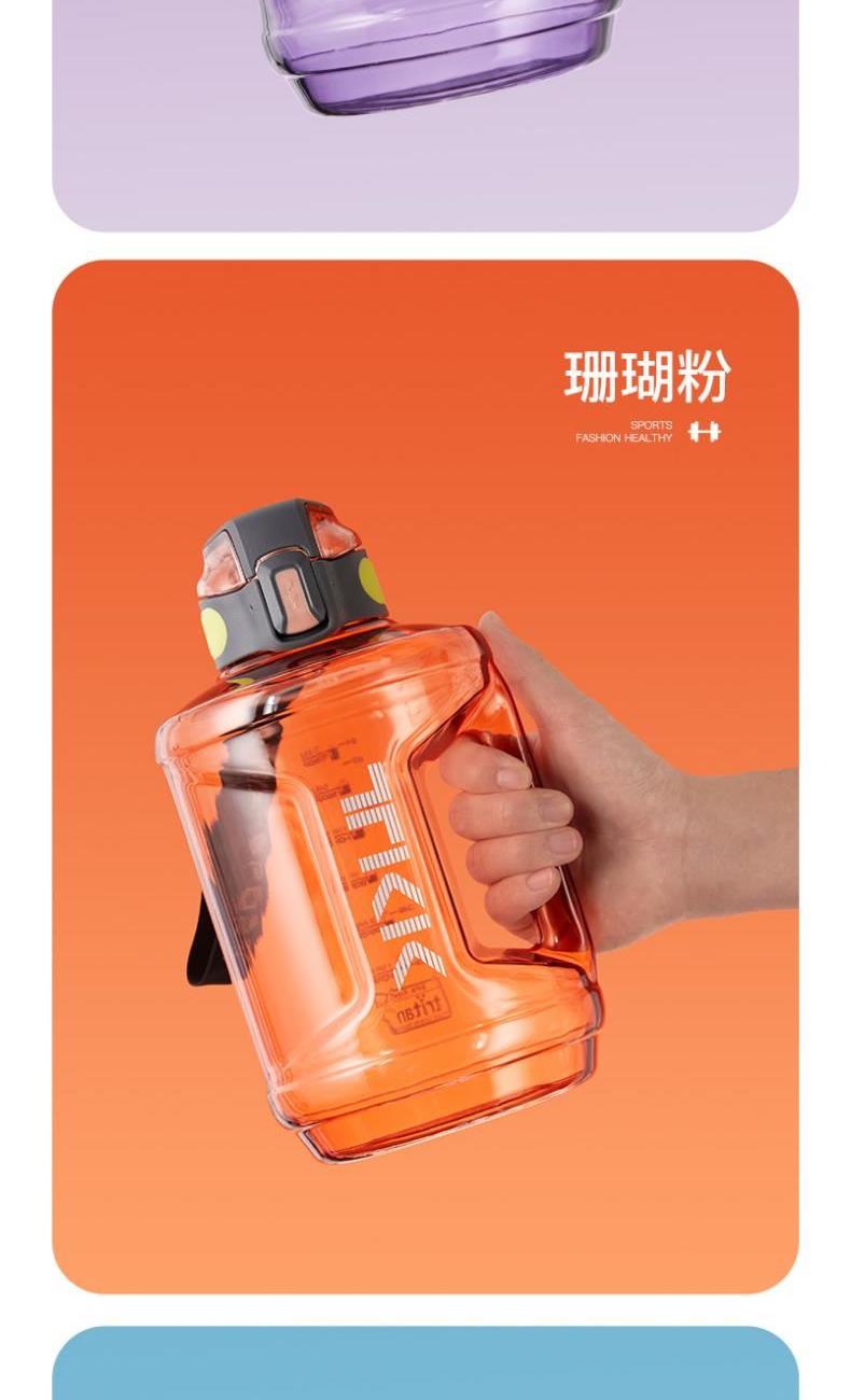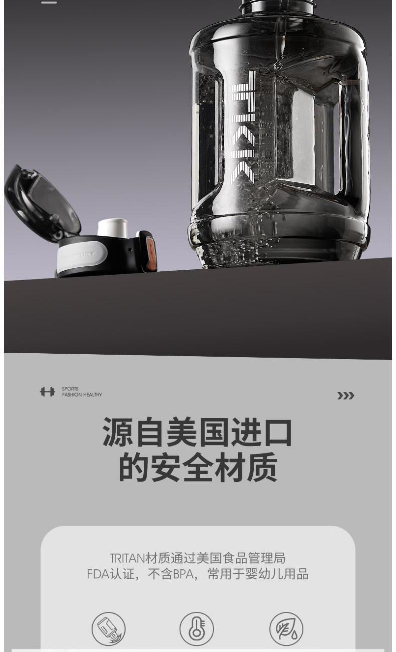 商品容量:1800ml 杯身材质:tritan 商品净重:326g 商品尺寸:143X252mm 1.时尚运动感设计直饮杯 ;同时配送一个直饮吸管嘴,2种方式体验不同的喝水感。 2.杯身采用美国伊士曼Tritan进口材料,不含双酚A(BPA),风靡欧美的婴幼儿用品安全材质, 3.按压式一键弹盖, 轻松开合不费力,畅快补水; 4.宽扁的编织带提绳 手感好,外出轻松携带,随心随性 即拎即走 5.食品级硅胶防漏圈,密封防漏,安全可靠; 6.可拆卸配件,便于日常清洗,不易藏污纳垢; 7.圆润的饮水口设计,舒适口感,不侧漏不呛喉, 8.安全锁扣 锁紧杯盖,防止杯盖不慎弹开漏水/烫伤,安心无忧; 9.硅胶防滑防烫杯杯套,安心使用;